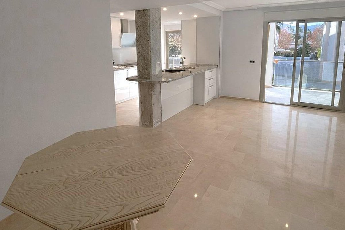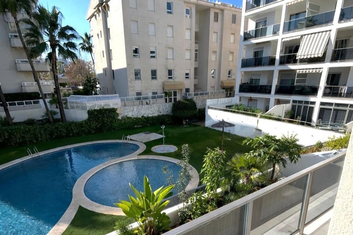 Two-bedroom apartment, south-facing, with two bathrooms, sunny terrace, and equipped kitchen with parking space and storage room in a well-maintained building with a pool, green areas, and concierge.~The home has a spacious living-dining room with an equipped and furnished semi-independent American-style kitchen with a bar. Both open onto the sunny terrace facing south, overlooking the pool.~It has two bedrooms with built-in wardrobes and natural light, and two full bathrooms.~It is sold unfurnished, and the price includes an underground parking space and a storage room.~The building is well-maintained with two pools (one large and one for children), green areas, and a cozy reception.~In the surroundings, we have restaurants, supermarkets, and shops as well as public transport. There is also a park and a school nearby.~The Albir beach is only 300m from the building.