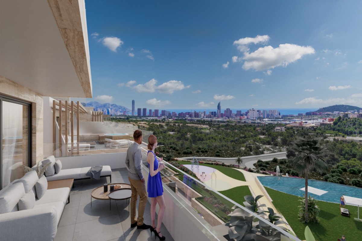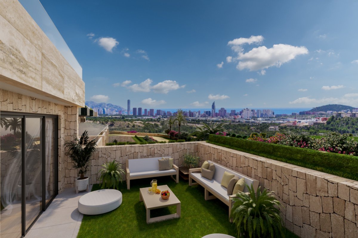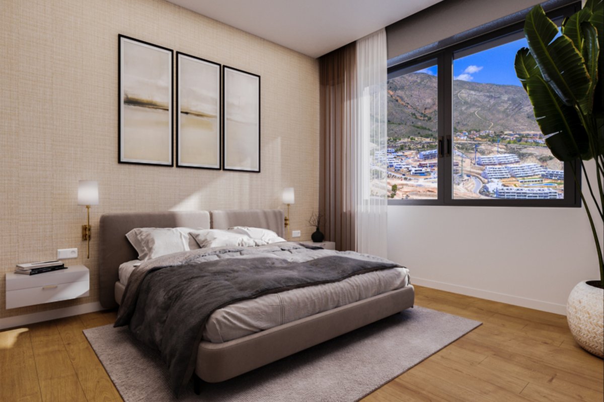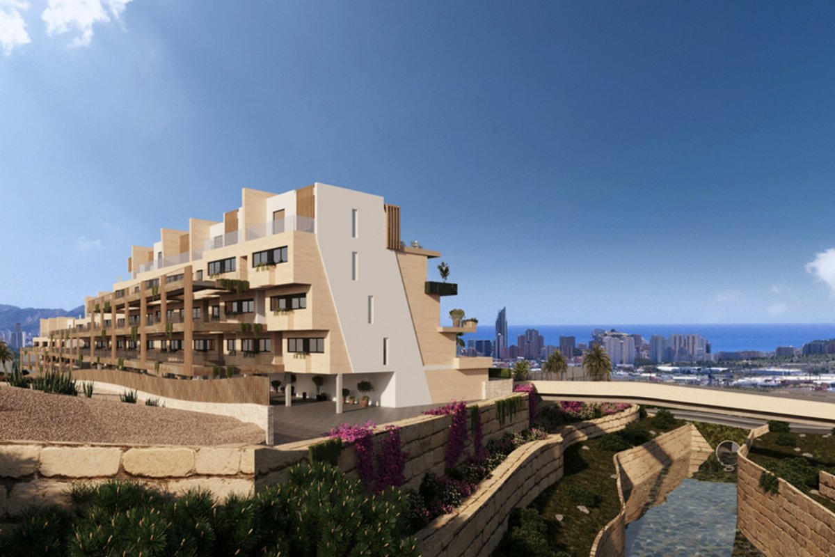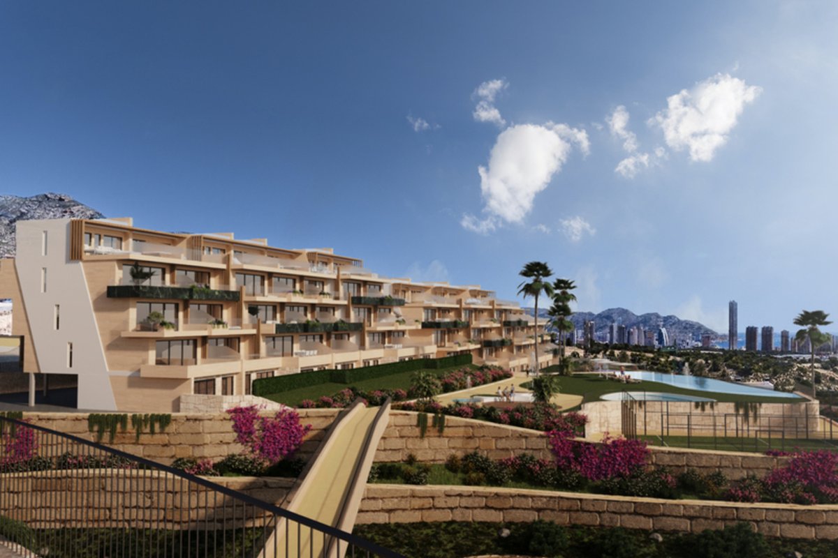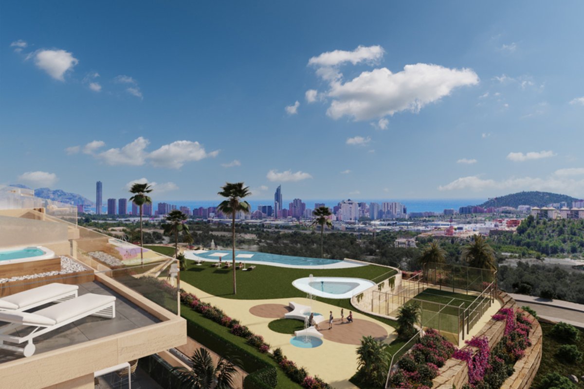 Brand New Development of Luxury Apartments in Finestrat all are south Facing with sea viewsThis is a Middle Floor 2 bed 2 bath one level Apartment, is has a open plan living room, kitchen, utility and large terrace of26m2 with sea views, stunning views of the resort, communal pool, and skyline of Finestrat and Benidorm.Every detail has been carefully taken in to consideration with design and unique styles homes, all homes meet highest standard of quality safety and designThe development is gated and private, all terraces are South facing enjoying the Sun and sea views to the distanceThe development has a Communal pool, Gardens, Childrens play area, Gym, Sauna, Padel and Climatized pool to enjoy in Winter monthsPerfect location for Holiday or Permanent Living, with all facilities on the doorstep, Golf, Shopping and Beaches not far away.Good access links to AP7 and Coastal Roads