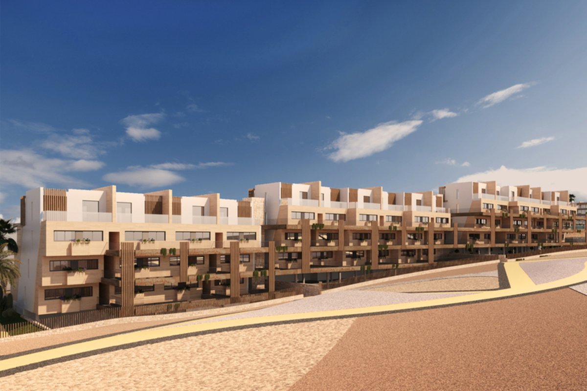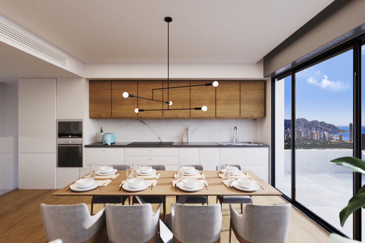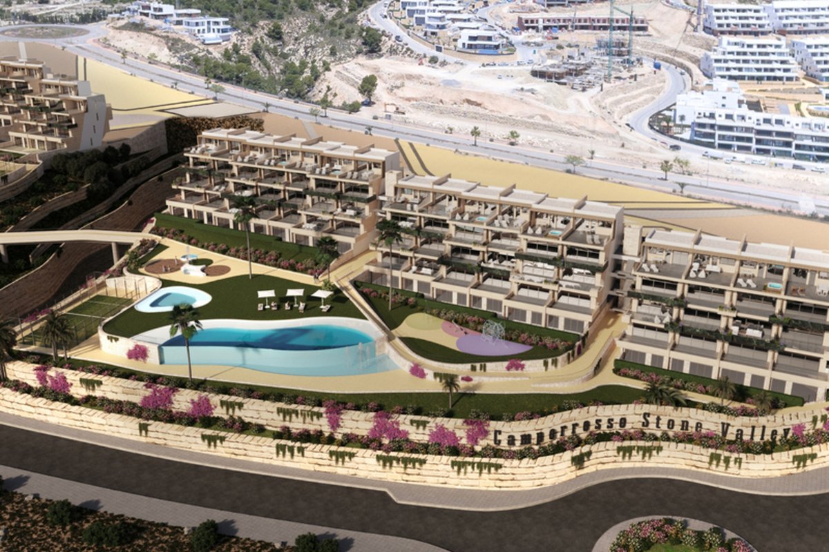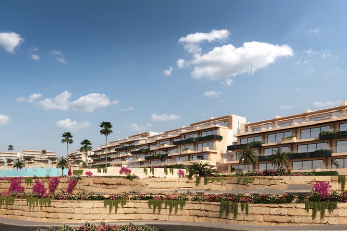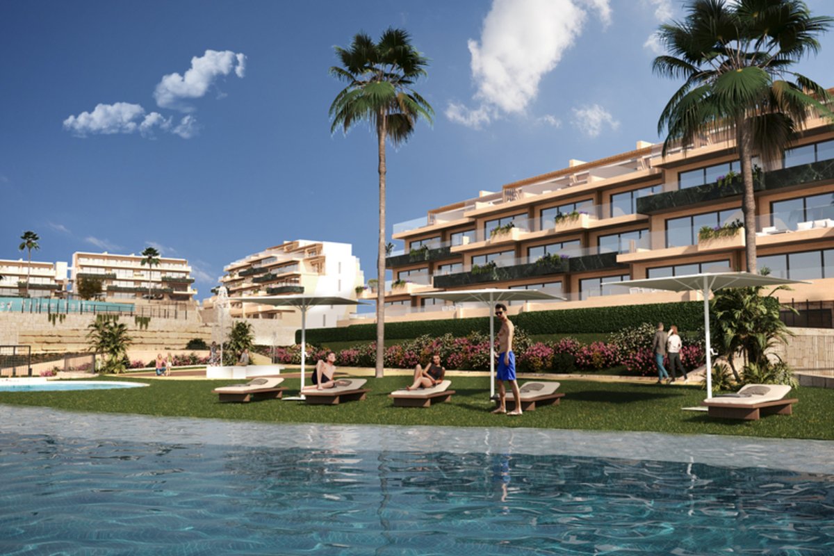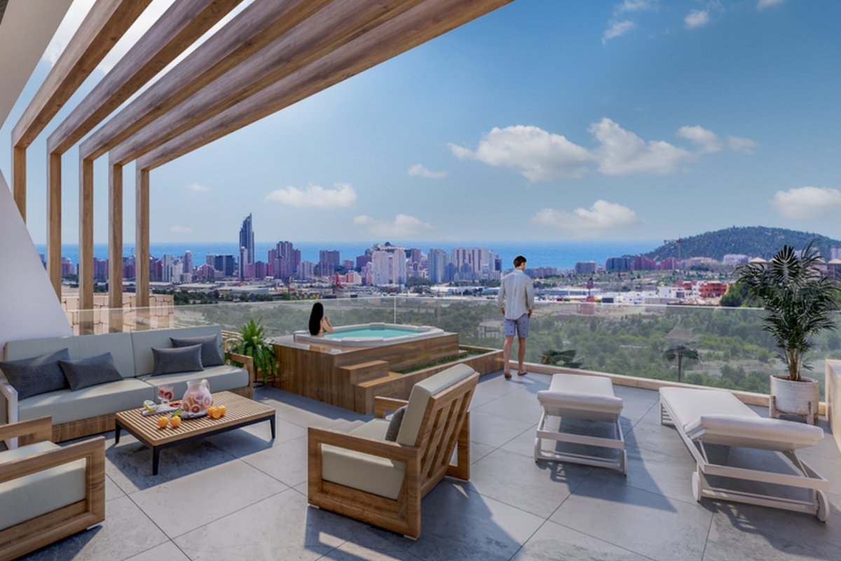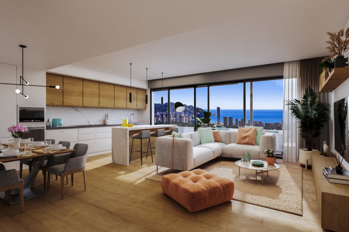 Brand New Development of Luxury Apartments in Finestrat all are south Facing with sea viewsThis is a Middle Floor 2 bed 2 bath one level Apartment, is has a open plan living room, kitchen, utility and large terrace of26m2 with sea views, stunning views of the resort, communal pool, and skyline of Finestrat and Benidorm.Every detail has been carefully taken in to consideration with design and unique styles homes, all homes meet highest standard of quality safety and designThe development is gated and private, all terraces are South facing enjoying the Sun and sea views to the distanceThe development has a Communal pool, Gardens, Childrens play area, Gym, Sauna, Padel and Climatized pool to enjoy in Winter monthsPerfect location for Holiday or Permanent Living, with all facilities on the doorstep, Golf, Shopping and Beaches not far away.Good access links to AP7 and Coastal Roads