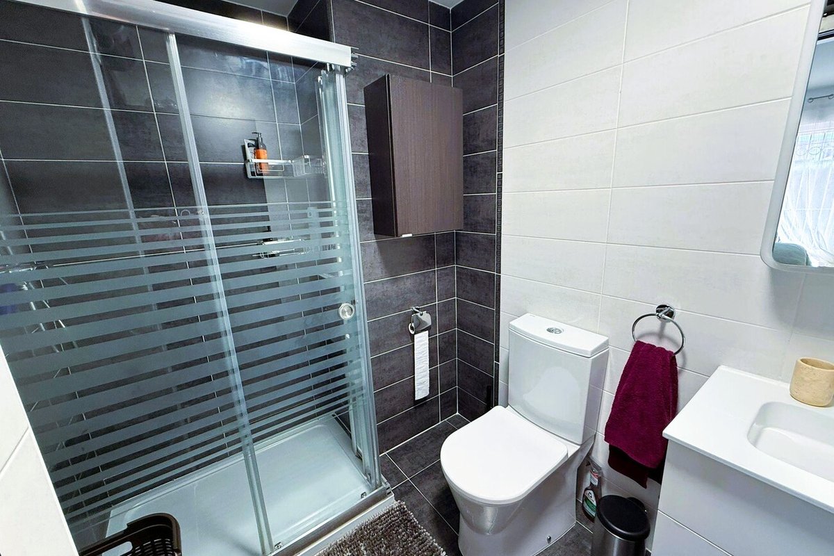 This ground-floor apartment comprises three bedrooms, two bathrooms, and a living room with an open-plan kitchen. The living room opens onto a terrace with a garden. A utility room is also located off the kitchen. The property is sold furnished, with appliances and ducted air conditioning. A designated above-ground parking space is included in the complex. The complex offers a large swimming pool, a jacuzzi, and green areas. The location is close to the La Fuente and Villamartin Plaza shopping centers, several supermarkets, bars, and restaurants.