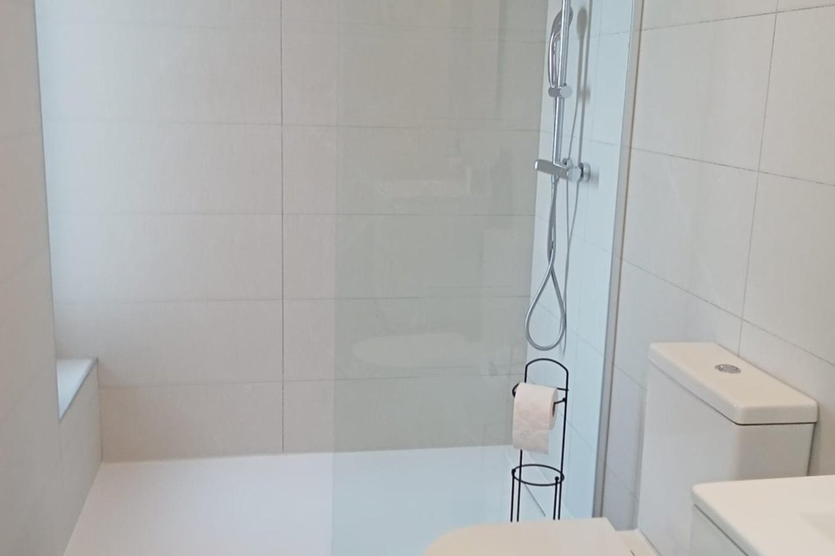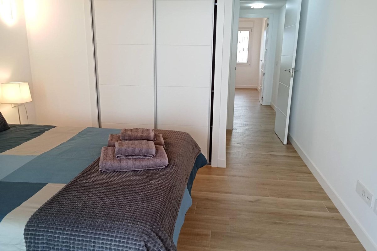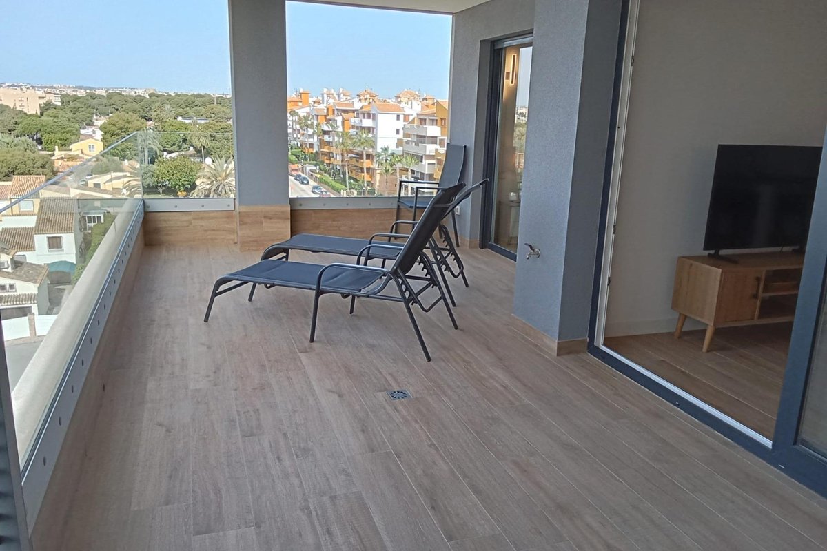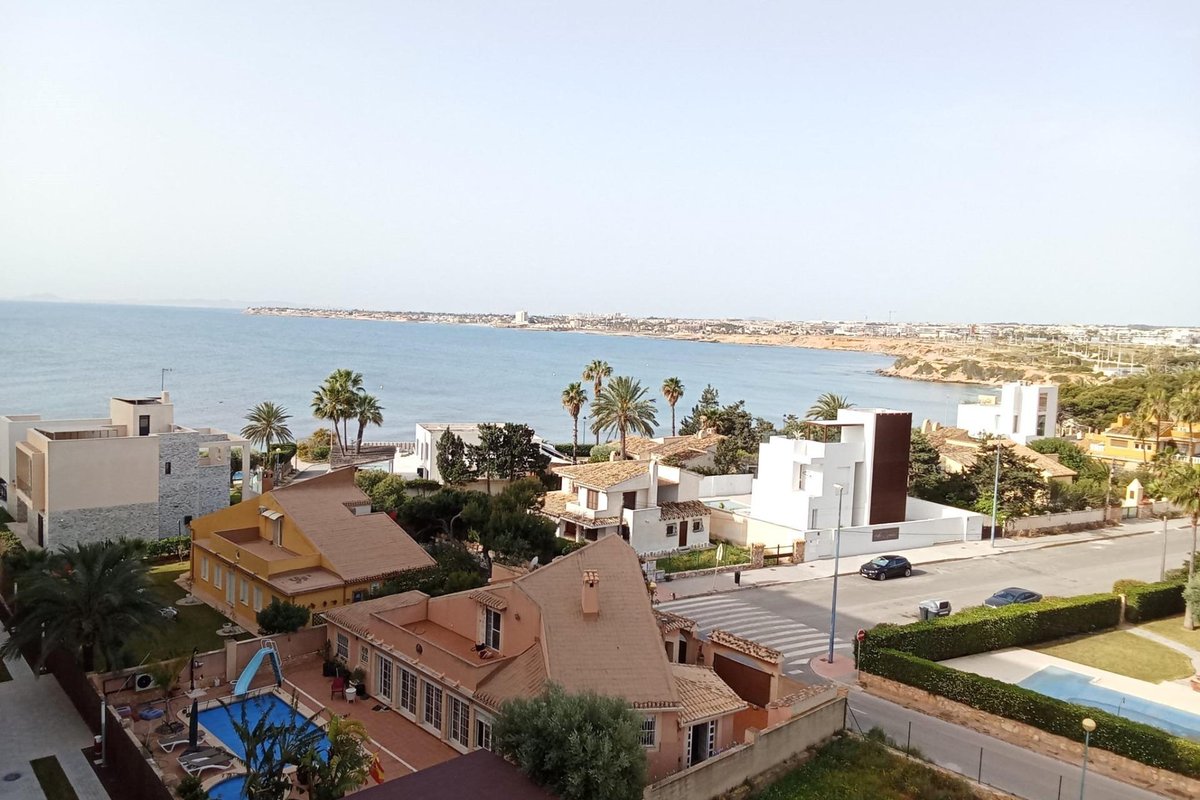 Apartment on the sixth floor, with elegant and modern design, like-new apartment, with frontal and panoramic sea views, on the sea front in Punta Prima! It consists of a living room with access to the spacious terrace (approximately 20 m2) with sea views, a separate fully equipped kitchen with a small pantry (for washing machine,…), two double bedrooms with built-in wardrobes, two bahtrooms and an underground parking space with a storage room in the same building. The main bedroom has an en suite bathroom and access to the terrace. Furnished. Ducted air conditioning and heating. Bathrooms with underfloor heating. Video intercom. South facing. Top-quality materials. Direct elevators access from the apartment to the parking and storage units. Concierge and video surveillance. Residential with 3 swimming pools (Infinity, heated and children’s pools) with sea views, outdoor jacuzzi, children’s play areas and gardens. Close to all amenities, cafes, supermarkets, … A luxury! With a privileged location a few steps from the sea facing the immensity Mediterranean sea!