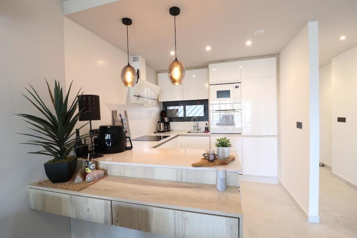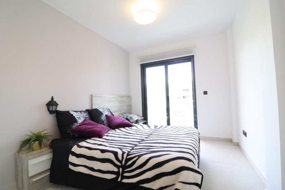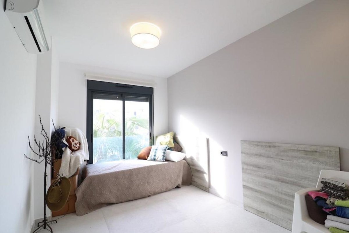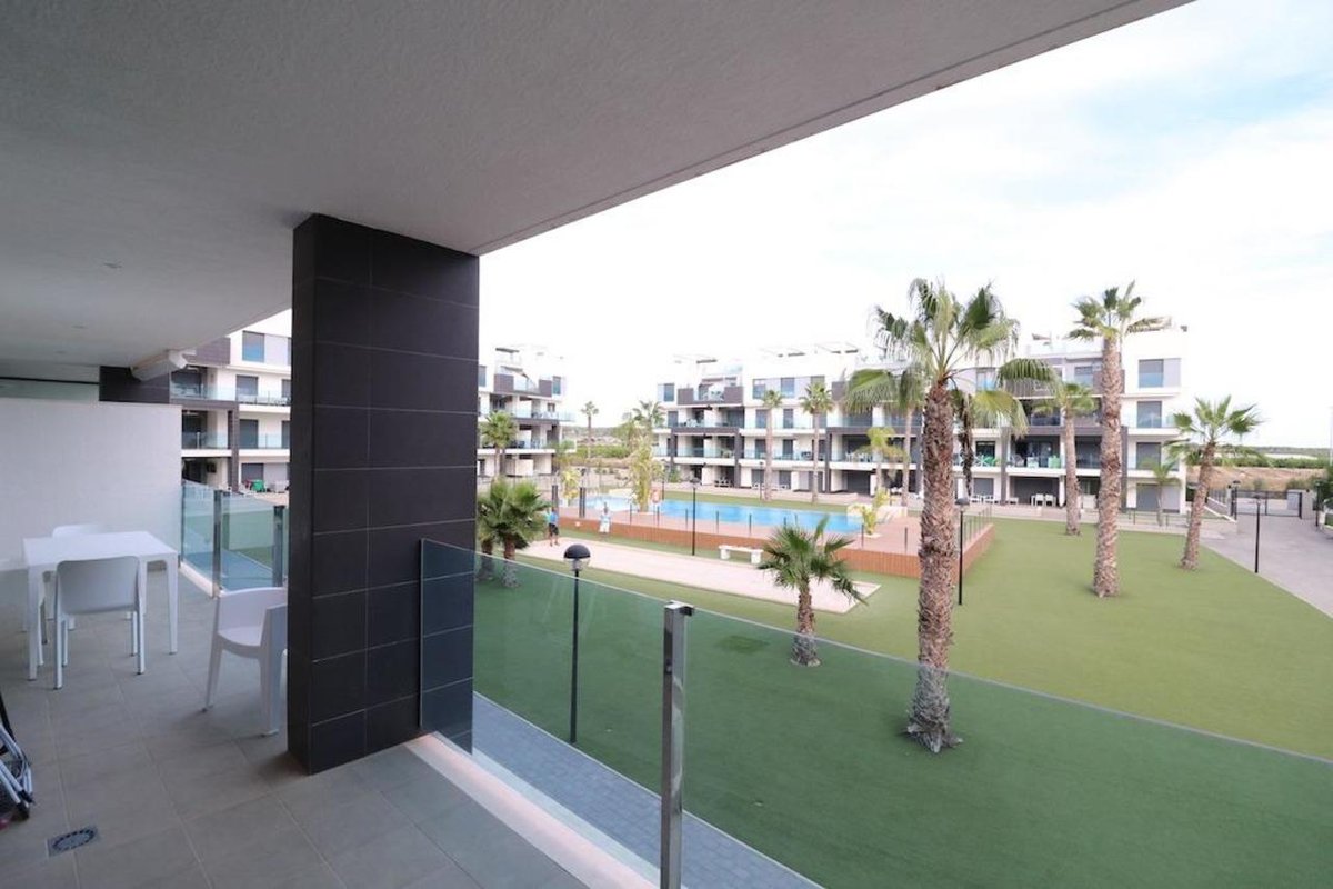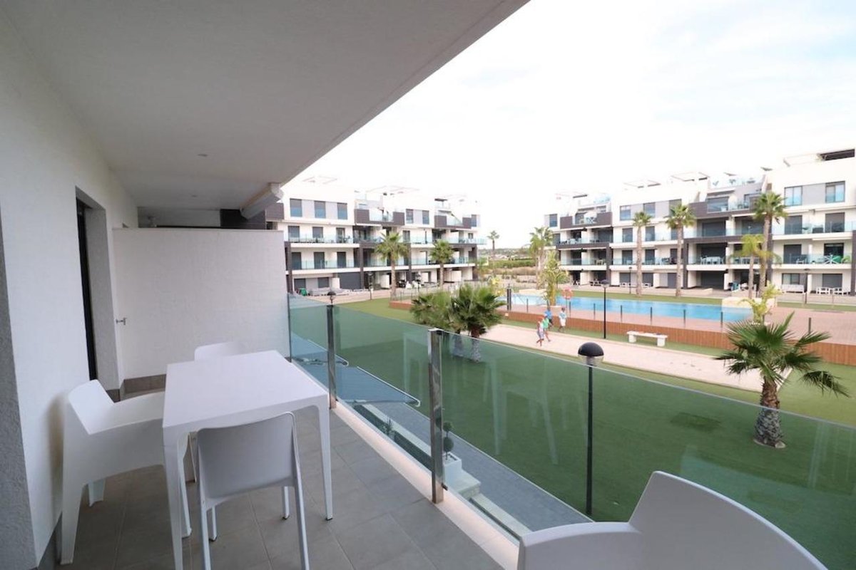 El Raso, Residencial Oasis Beach XIII, apartment on 1st floor (with elevator), facing the pool and communal garden area, South-East facing apartment of 108 m2 built with 2 bedrooms, 2 bathrooms, kitchen, large living room and a very large terrace of 18 m2, the property is sold furnished with air conditioning, subway garage and storage room.