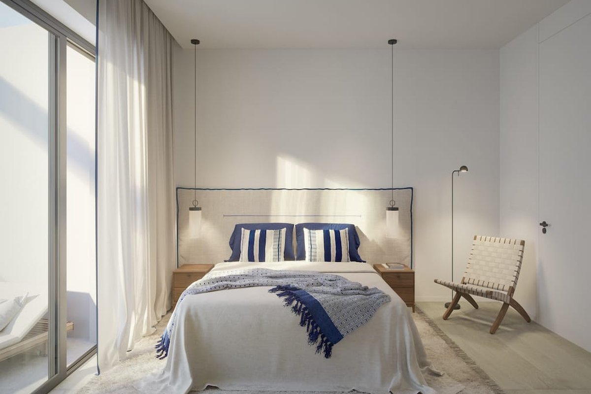 Each apartment has been carefully designed to maximise space, light and sea views. Interiors are finished to a high standard, featuring elegant wood flooring, large windows with glass balustrades, and generous balconies that frame the Atlantic horizon. Modern comforts include air conditioning, heating, double glazing, electric shutters, security doors and lift access, alongside ample built-in storage with sleek lacquered cabinetry. The apartments are bright, airy and functional, offering a calm and stylish coastal retreat.