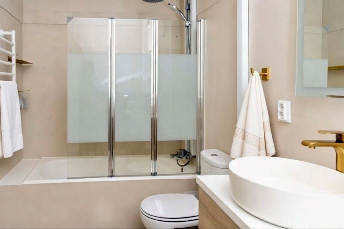 The bathroom is spacious for this type of property, featuring a bathtub, shower, WC, and additional built-in storage, which is rarely found in similar apartments.