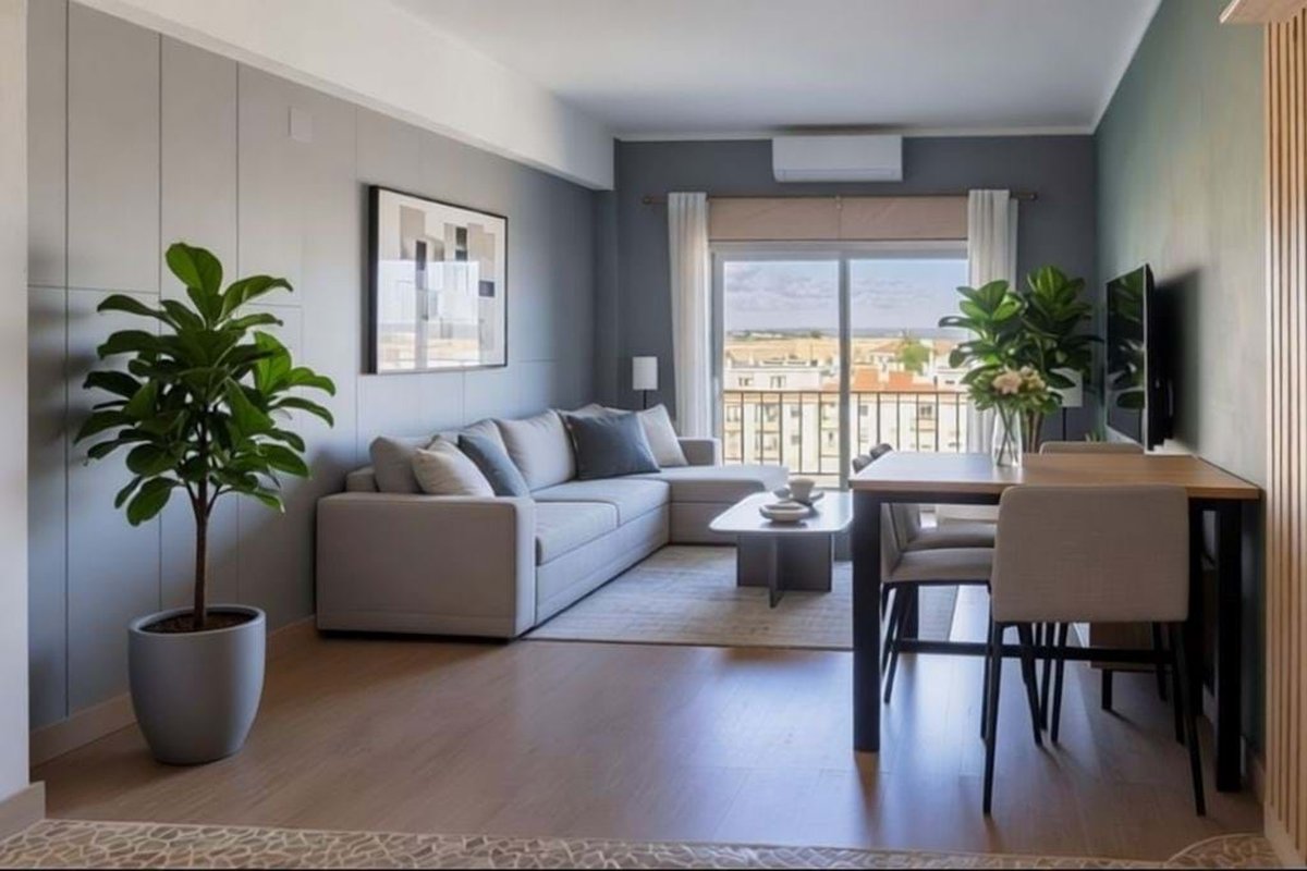 You enter the apartment directly into a spacious open-plan living and dining area, currently furnished with a dining table and four chairs. From here, you access a generous 12 m² balcony, perfect for outdoor dining, morning coffee, or relaxing while enjoying sunrise views over the sea. Given its size, there is also room to install a small barbecue, further enhancing outdoor living.