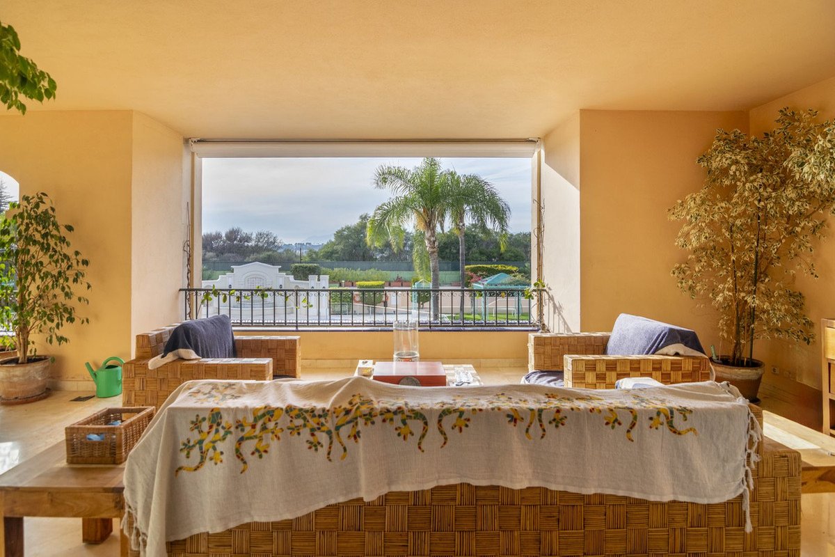 This gated complex is designed to offer a perfect blend of luxury and privacy with 24/7, 3-level security. The expansive windows and terrace overlook a private garden with a lush green landscape and a sparkling pool, providing an oasis of calm amidst the vibrant energy of Marbella.