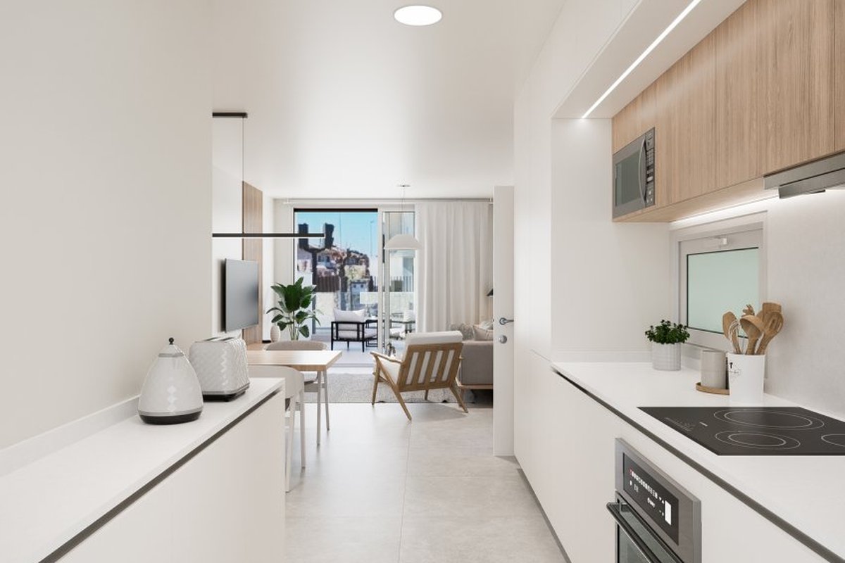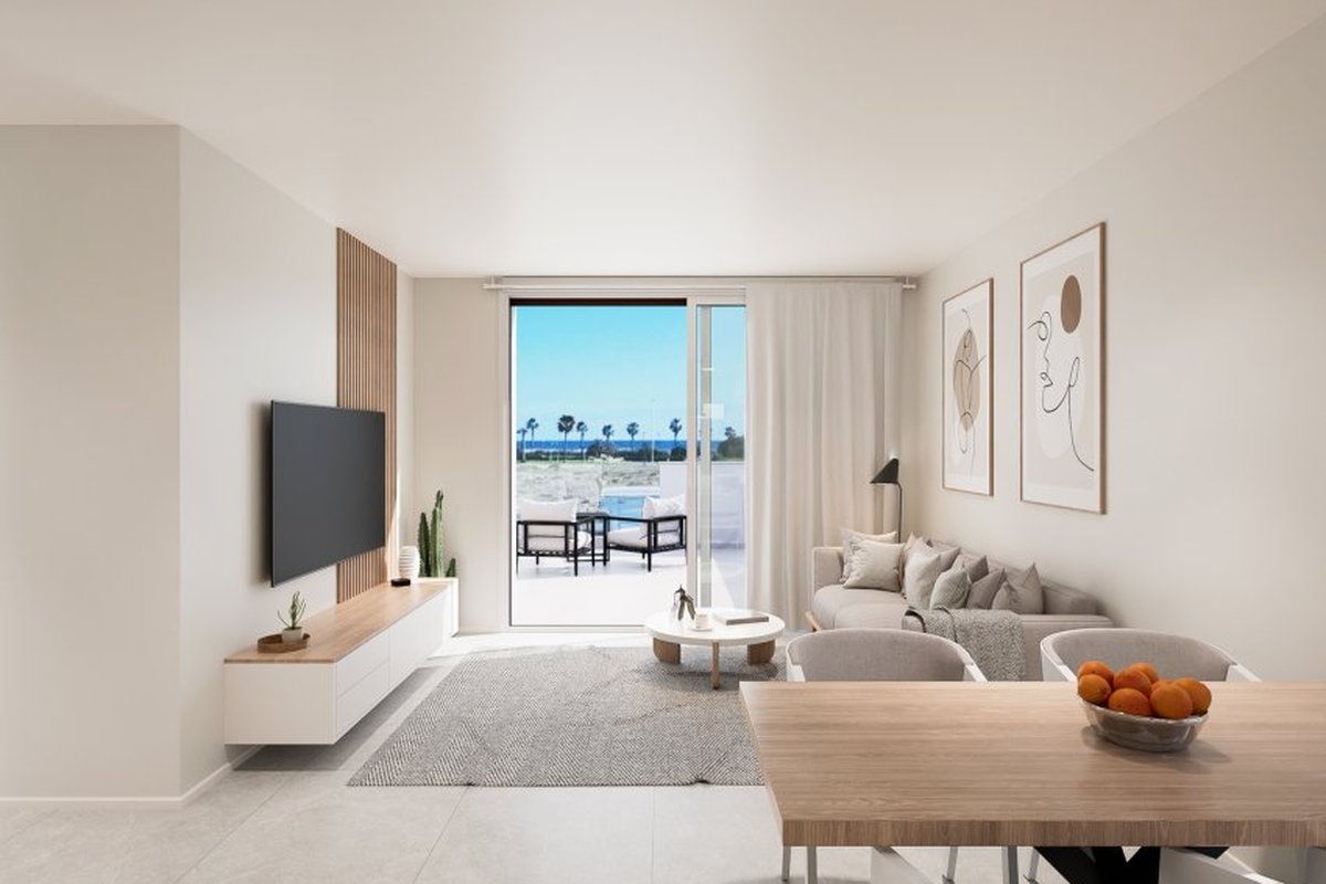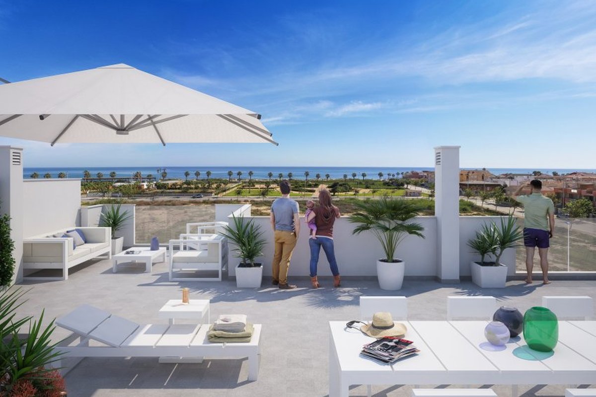 Located in the charming town of Pilar de la Horadada, this exclusive residential complex offers a unique living experience on the front line of the sea. With a total of 25 properties, residents can enjoy stunning sea views from the comfort of their home. The offer includes a variety of typologies that cater to different needs and lifestyles, such as apartments, penthouses, townhouses, and bungalows on the ground and upper floors. All homes are designed to maximize comfort and functionality, with options of 2 or 3 bedrooms and 2 bathrooms, ideal for families or couples seeking additional space. The proximity to the sea, just 1 km away, and the airport, 15 km away, ensures excellent connectivity and access to essential services.OUTDOOR AREASThe properties feature exterior characteristics that enhance their appeal and functionality. Each home has a private terrace, perfect for enjoying the Mediterranean climate and sea views. Additionally, some typologies include a solarium, providing additional outdoor space for relaxation or socializing. Private gardens are an available option in certain homes, offering a personal oasis of tranquility. For those seeking a touch of luxury, some properties feature a private pool, ideal for cooling off on hot days. The exterior design is complemented by electric shutters, which add not only convenience but also a modern and elegant touch.INDOOR AREASThe interiors of the homes are carefully designed to offer maximum comfort and style. Porcelain stoneware floors provide an elegant and durable finish, while air conditioning ensures a pleasant environment year-round. The kitchens are equipped with modern appliances, making daily life easier. Built-in wardrobes in the bedrooms provide efficient and organized storage. Every detail has been considered to create a cozy and functional space where quality and design come together to offer an exceptional home.COMMON AREASThe common areas of the residential are designed to promote an active and social lifestyle. Residents can enjoy spacious garden areas, perfect for walking or relaxing outdoors. The communal pool offers an ideal space for swimming and socializing with neighbors and friends. Additionally, the residential features a communal garage and parking options, ensuring convenience and security for all residents.PILAR DE LA HORADADAPilar de la Horadada, on the Costa Blanca, is a coastal town with fine sandy beaches and a tranquil atmosphere. Its coastline, such as Playa de Mil Palmeras, attracts visitors in search of sun and sea, making it a popular tourist destination in summer. Tourism in Pilar de la Horadada focuses on its beaches and water activities, such as snorkelling and scuba diving. Its proximity to areas of interest such as the Salinas de San Pedro Natural Park adds value to its tourist offer. The lifestyle in Pilar de la Horadada is relaxed and sea-oriented. Residents enjoy a quiet life, with a wide gastronomic offer based on fresh fish and Mediterranean dishes. The community values the proximity to the sea and local traditions. Pilar de la Horadada offers a coastal and tranquil atmosphere for those seeking a relaxed life by the Mediterranean Sea on the Costa Blanca.