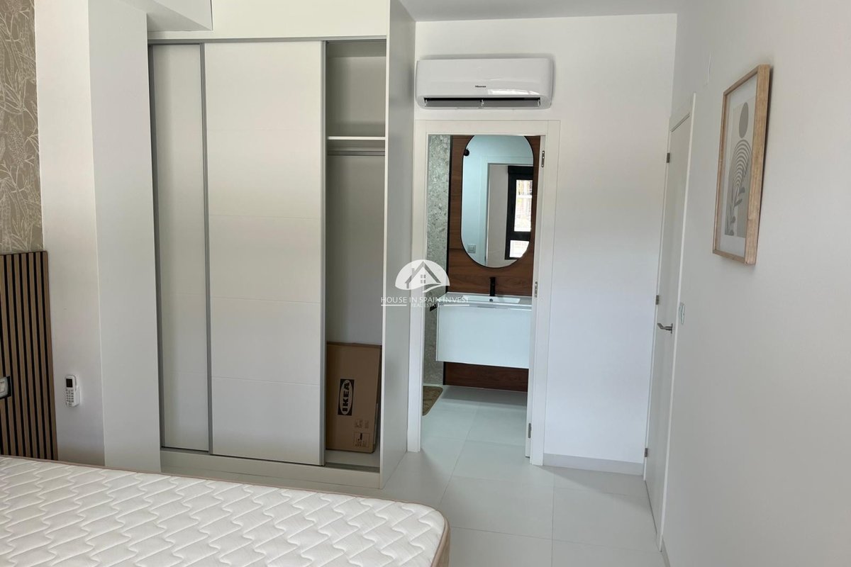 This modern 2 bedroom, 2 bathroom apartment is located in San Miguel de Salinas, in an excellent location close to all amenities and leisure areas. With a built area of 75 m², the house features a fully equipped open-plan kitchen, a bright living room and two bedrooms, and access to a private veranda and a private garden overlooking a covered terrace of 30 m² and a spacious garden of 40 m². Highlights: 2 built-in wardrobes Furnished Equipment included Air conditioning and pre-installation for air conditioning Secure door and intercom Located on the ground floor with easy access Ideal location: Only 15 minutes from the beach 40 minutes from the airport 10 minutes from the golf course 10 minutes from recreational areas and amenities Perfect for both permanent living and holidays. Move-in ready!