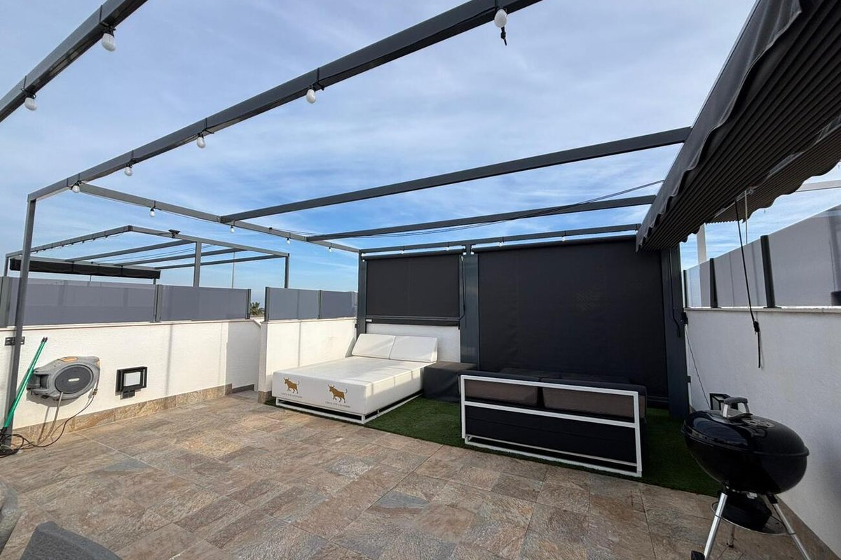 We are pleased to present this exclusive property built in 2021, located in a quiet residential area of Pilar de la Horadada, just 2 km from the beach and only 500 meters from shops, restaurants, and leisure facilities. An ideal option as a holiday home, permanent residence, or investment on the southern Costa Blanca.Situated on the first floor, the property offers 60 m² built area, efficiently distributed as follows:2 spacious bedrooms, both with fully lined built-in wardrobes2 fully fitted bathrooms, equipped with shower screens and modern finishesBright living-dining area with open-plan American-style kitchen, fully equippedPrivate 8 m² balcony, west-facing, perfect for enjoying the afternoon sunImpressive 60 m² private solarium, ideal for a chill-out area, outdoor kitchen, or jacuzziCondition & FeaturesThe property is in impeccable condition, practically unused, and ready to move in. It is sold with exclusive designer furniture included, offering a stylish and elegant atmosphere throughout.Additional features include:Air conditioningWhite goods includedInstalled interior lightingTV and telephone connectionsMains electricity connectedCommunal swimming poolPrime Location Beach: 2 km⛳ Golf course: 3 km✈ Airport: 45 minutes Shops & leisure: 500 mA contemporary, functional property with generous private outdoor space, located in one of the most sought-after areas of the southern Alicante region.