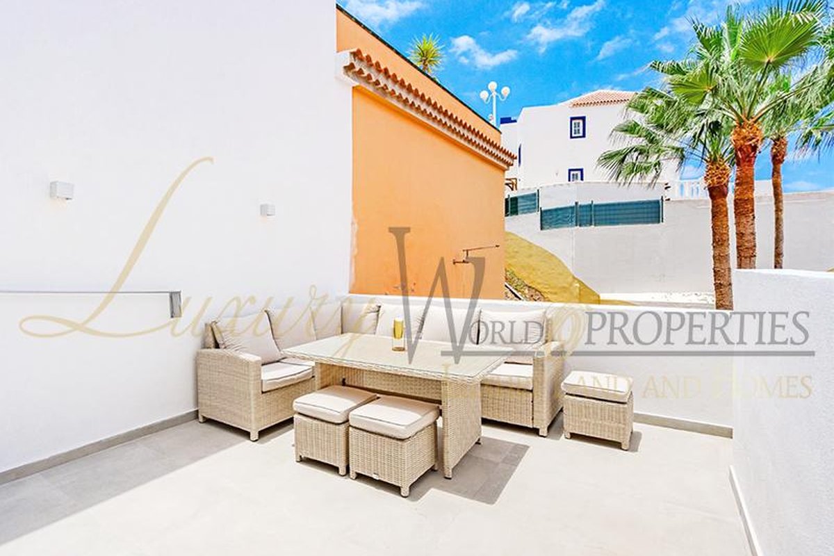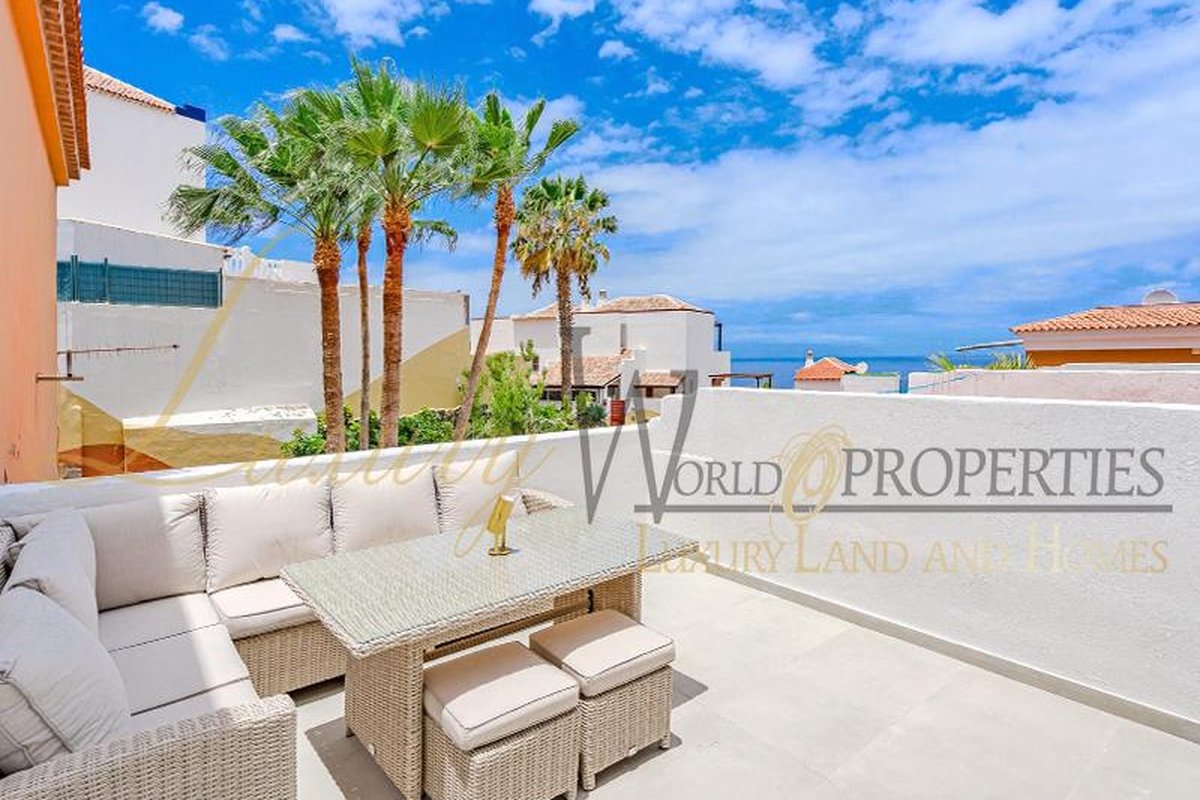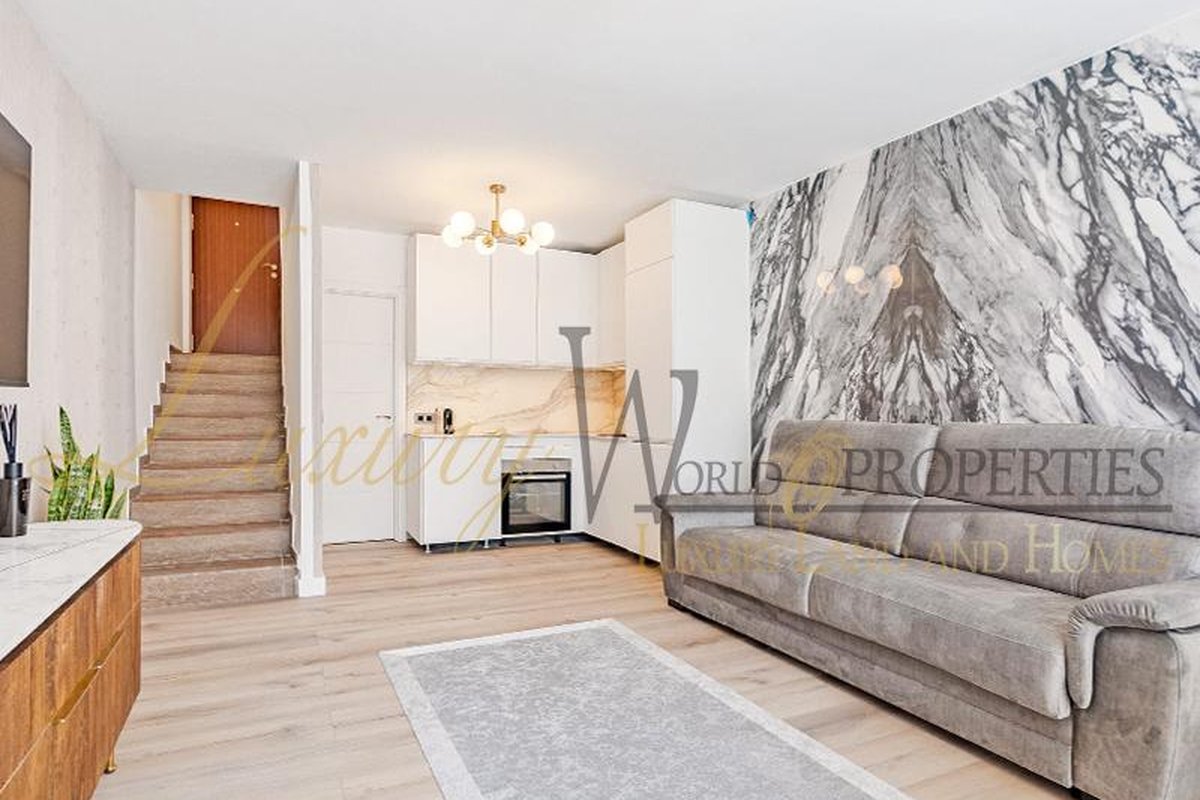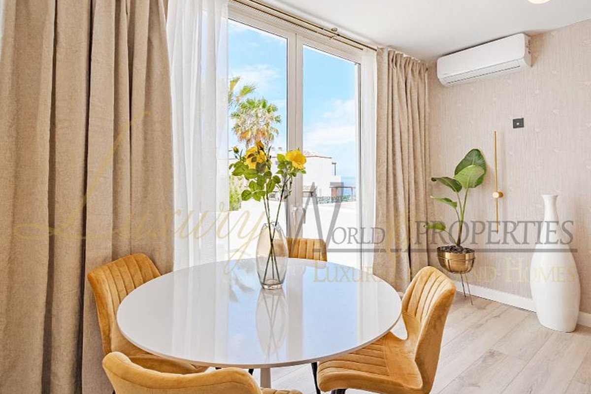 Luxury World Properties is pleased to offer an apartment in the complex Ocean View in San Eugenio Alto. This charming, tastefully renovated and furnished apartment spans 74 m2 over two floors. Upon entering, you descend a few steps to the spacious living-dining area with air conditioning, an American kitchen, and a bathroom with a shower. The terrace, approximately 20 m2 in size, provides ample space to enjoy with friends and family while taking in the fantastic sea view. Upstairs, you will find a bedroom with a built-in wardrobe, air conditioning, and another bathroom. The apartment is bright thanks to integrated LED lighting. Within short distance are amenities such as restaurants, bars, shops, supermarkets, the renowned water parks Agualand and Siam Park, as well as the Siam Mall shopping center.