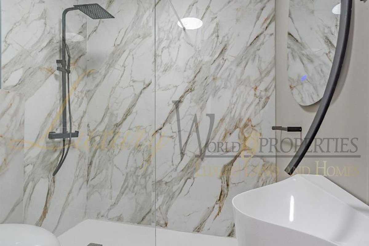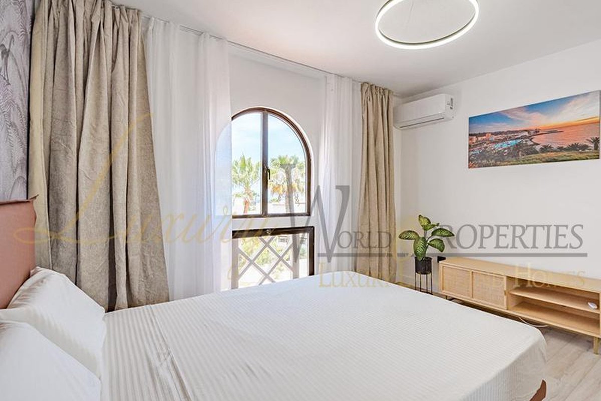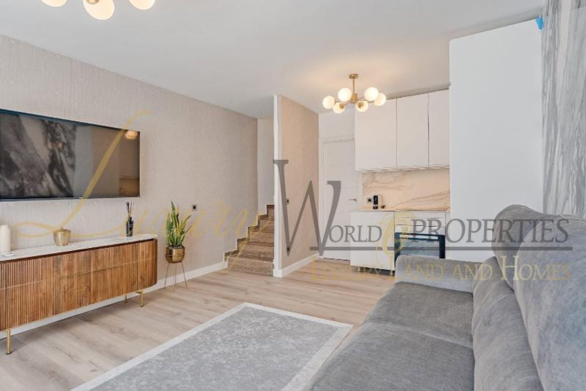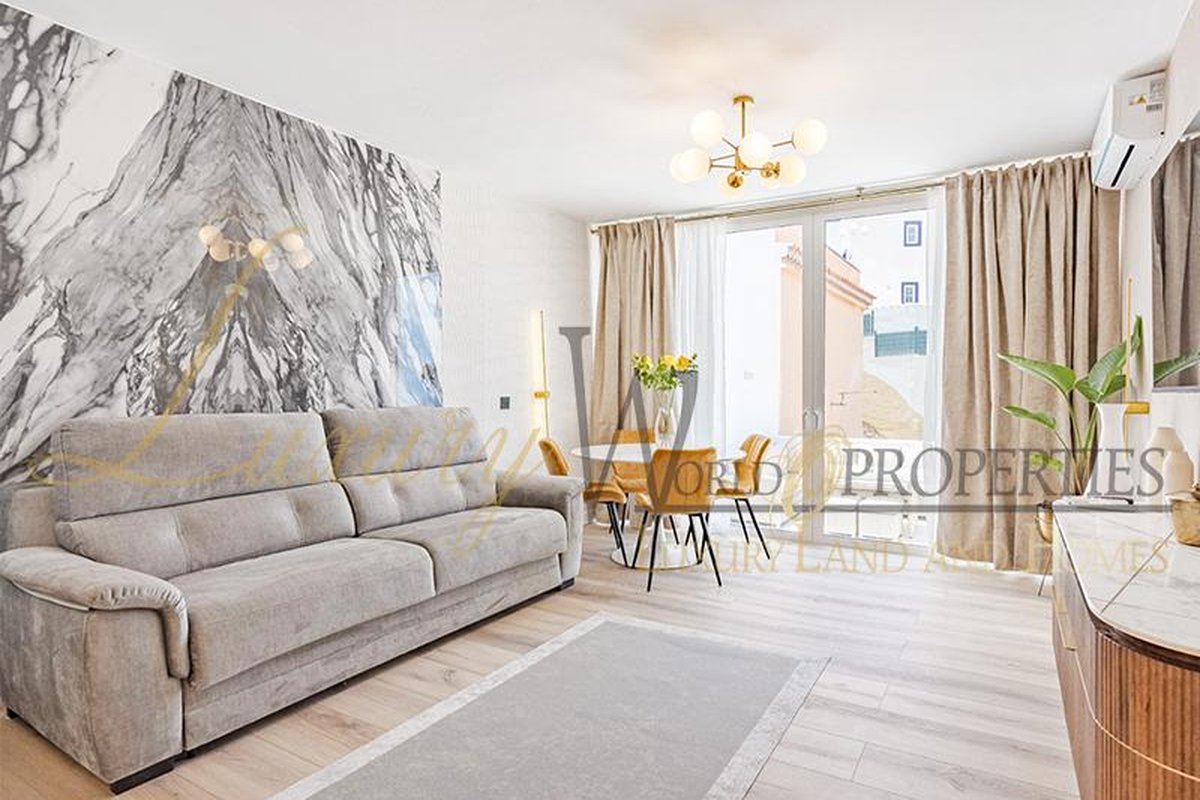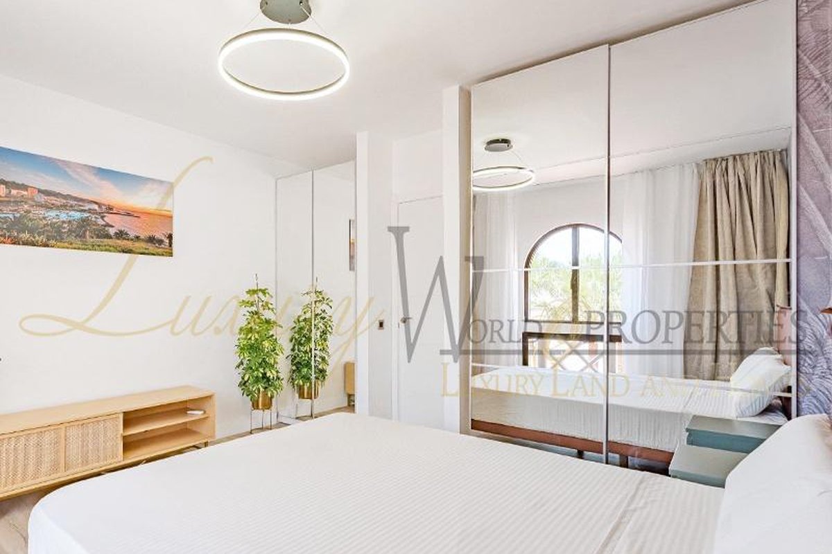 Luxury World Properties is pleased to offer an apartment in the complex Ocean View in San Eugenio Alto. This charming, tastefully renovated and furnished apartment spans 74 m2 over two floors. Upon entering, you descend a few steps to the spacious living-dining area with air conditioning, an American kitchen, and a bathroom with a shower. The terrace, approximately 20 m2 in size, provides ample space to enjoy with friends and family while taking in the fantastic sea view. Upstairs, you will find a bedroom with a built-in wardrobe, air conditioning, and another bathroom. The apartment is bright thanks to integrated LED lighting. Within short distance are amenities such as restaurants, bars, shops, supermarkets, the renowned water parks Agualand and Siam Park, as well as the Siam Mall shopping center.