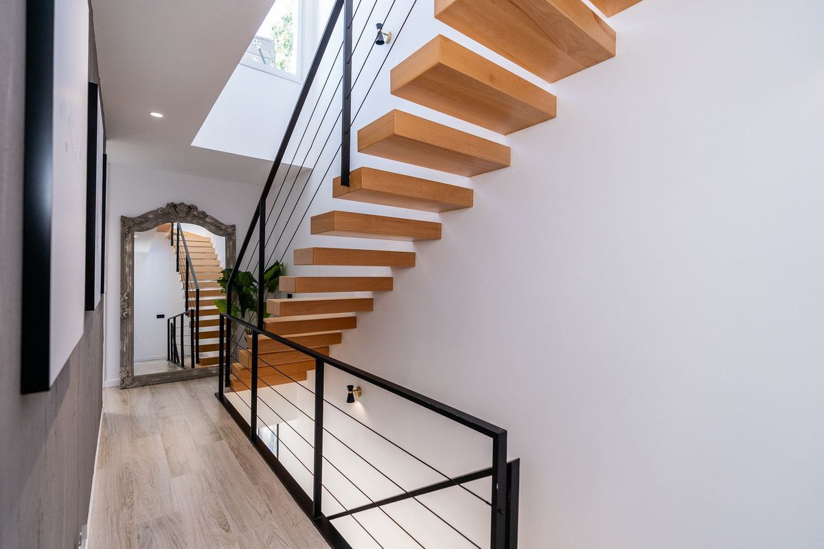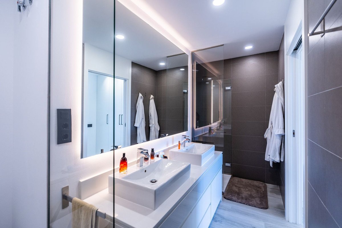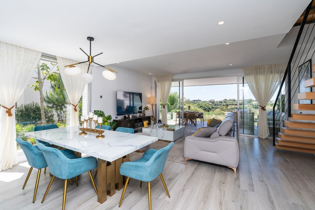 Stylish Corner Townhouse with Panoramic Mountain Views in Cancelada – New Build with Solarium, Terrace & High-End UpgradesWelcome to this stunning corner townhouse with panoramic mountain views, located in a contemporary new development in Cancelada, one of Estepona's fastest-growing areas. Just minutes from the beach by car and close to all essential services, this property offers the perfect blend of modern design, comfort, and strategic location.Modern Layout & Open SpacesSpread over three floors plus a rooftop solarium, this bright and spacious home enjoys exceptional natural light thanks to its corner position and large windows.On the main floor, you'll find an open-plan kitchen with a central island finished in exposed concrete for an elegant industrial touch, seamlessly connected to a bright living-dining area. A custom storage closet and guest toilet have been added, and from the living room, you have direct access to a large terrace with breathtaking mountain views — perfect for outdoor dining or relaxing.Comfortable Sleeping Quarters with Designer TouchesThe second floor features three bedrooms. Two guest bedrooms share a bathroom in the hallway, while the master suite includes an en-suite bathroom upgraded with glass shower screens and a custom vanity unit, a walk-in wardrobe, and a double built-in wardrobe. Decorative concrete accents on the wall separating the rooms add a cohesive design element throughout the home.Rooftop Solarium for Sunset ViewsOn the top floor, the fully furnished solarium is ideal for enjoying evenings under the stars or sunsets with panoramic views. Equipped with a retractable awning, and pre-installed water and electrical connections, it's ready for an outdoor kitchen or chill-out area.High-Quality Finishes & Extras IncludedThis immaculate home has been enhanced with premium upgrades:*LED lighting in the living area*Designer black switches and power outlets*Decorative concrete details*Designer furniture included in the sale*2 Parking spaces, storage room & Premium AmenitiesIncludes two parking spaces Residents also enjoy access to a full range of community amenities, including:*Outdoor swimming pool*Exclusive social club with gym*Heated indoor pool*Sauna*Coworking area*CaféA truly unique property in terms of location, design, and quality — ideal as a permanent residence or investment on the Costa del Sol.