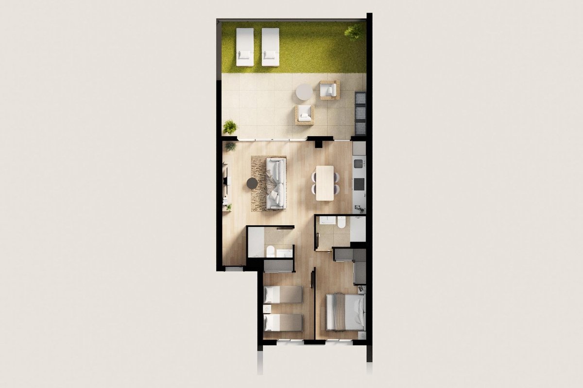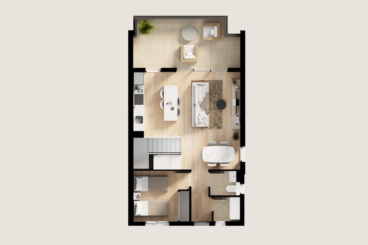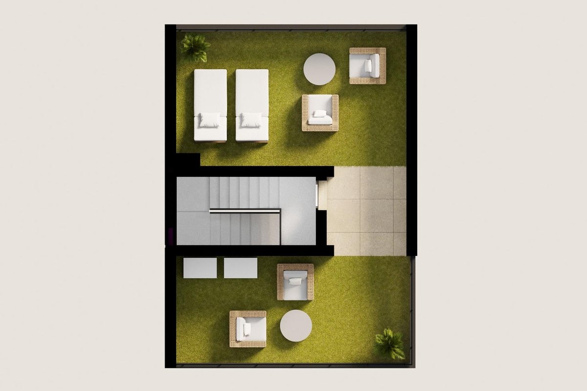 Modern Townhouse on the Costa Blanca in a quiet urbanization at Balcon de Finestrat with excellent road communication, close to Benidorm, the beaches, golf courses, shopping centers, etc.~~The townhouses are built with quality materials and excellent finishes, consisting of 3 bedrooms and 3 bathrooms, a spacious living room and integrated kitchen into bright and comfortable spaces along with beautiful views of the common areas with swimming pool and private gardens, in a natural environment with views of the Benidorm skyline and some units will also provide sea views.~~The houses are located in a modern residential complex, private outdoor parking, storage room, garden areas, and children's playground areas as well. The private pool in the property is provided as an option.~~~