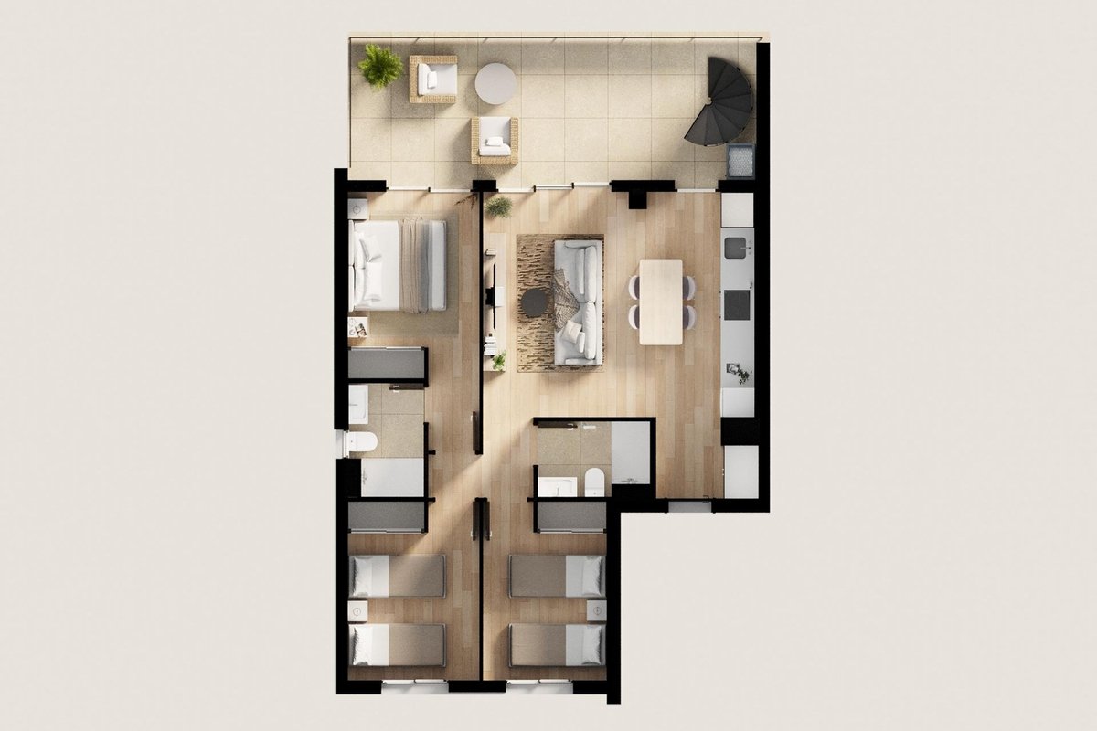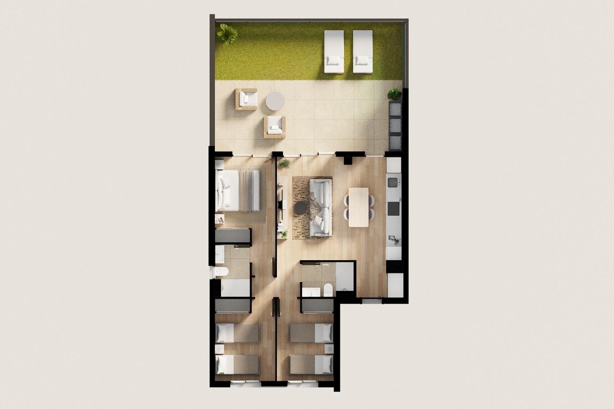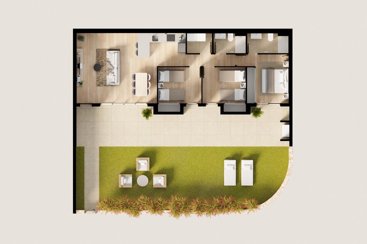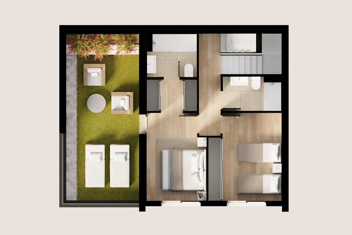 Modern Townhouse on the Costa Blanca in a quiet urbanization at Balcon de Finestrat with excellent road communication, close to Benidorm, the beaches, golf courses, shopping centers, etc.~~The townhouses are built with quality materials and excellent finishes, consisting of 3 bedrooms and 3 bathrooms, a spacious living room and integrated kitchen into bright and comfortable spaces along with beautiful views of the common areas with swimming pool and private gardens, in a natural environment with views of the Benidorm skyline and some units will also provide sea views.~~The houses are located in a modern residential complex, private outdoor parking, storage room, garden areas, and children's playground areas as well. The private pool in the property is provided as an option.~~~