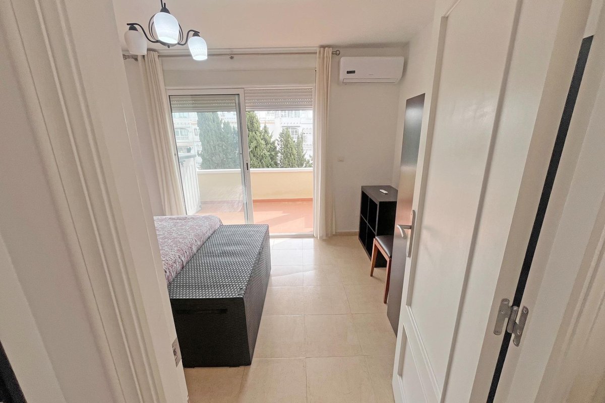 Discover this spectacular villa located in the quiet town of San Miguel de Salinas. Upon entering, you will be greeted by a cozy porch, ideal for enjoying the outdoors. This property is distributed over two well-defined floors; the ground floor houses a bright dining room with air conditioning and windows equipped with bars and mosquito nets that provide security without sacrificing natural light. The open-plan kitchen is fully equipped and has access to a utility room where you will find space for laundry and additional storage. There is also a spacious bedroom with a built-in wardrobe, whose window offers views of the rear terrace of the home. The ingenious use of space is also reflected under the stairs, where you will find a practical storage room. As you climb the elegant wooden stairs to the first floor, you will find another single bedroom next to a full bathroom equipped with a bathtub. You will also have the pleasure of a spacious master suite that opens onto its own private terrace. From here, you can ascend to the upper solarium, whose unobstructed views allow you to glimpse the beautiful beaches near Torrevieja. The property also has sufficient private parking for two vehicles and includes direct access from one side to the common area: a refreshing swimming pool surrounded by landscaped areas ideal for picnics or family moments in the sun on well-maintained artificial grass. Located close to all essential amenities such as local supermarkets and prestigious schools such as El Limonar, this architectural gem is only ten minutes away from the Mediterranean Sea. An excellent choice if you are looking for tranquility combined with modern comfort.