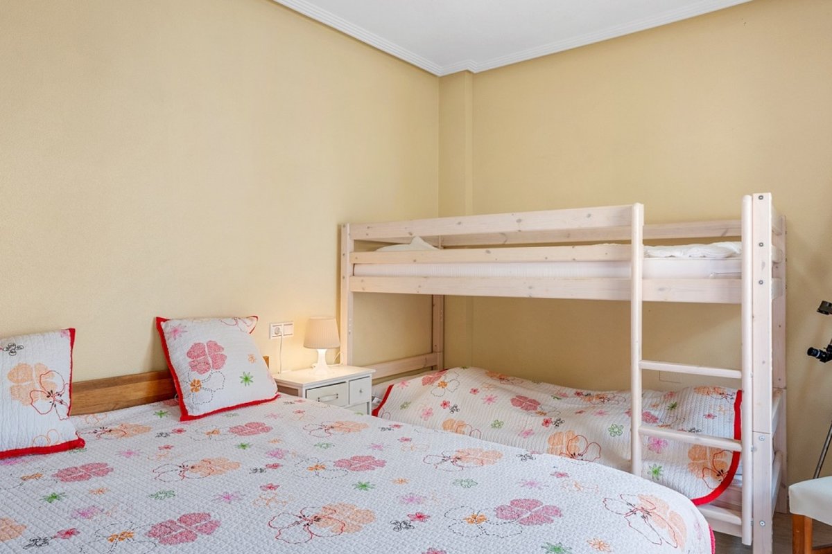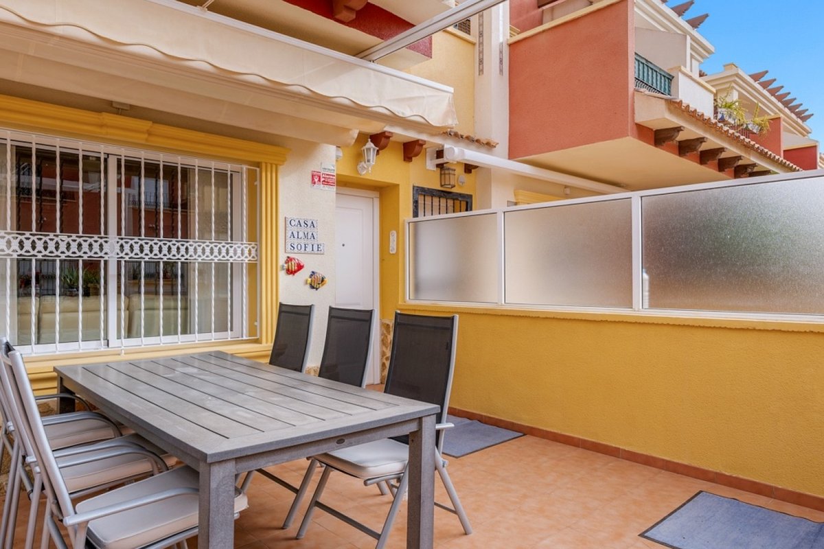 Corner townhouse with large 200+ m² plotSouth-facing orientation (sun all day)3 bedrooms / 2 bathrooms1 bedroom on the ground floorSeparate fully equipped kitchen + closed patioPrivate balconies for both upstairs bedroomsPrivate rooftop solariumGated communityCommunal swimming poolPrime location in VillamartínMinutes from La Zenia Boulevard