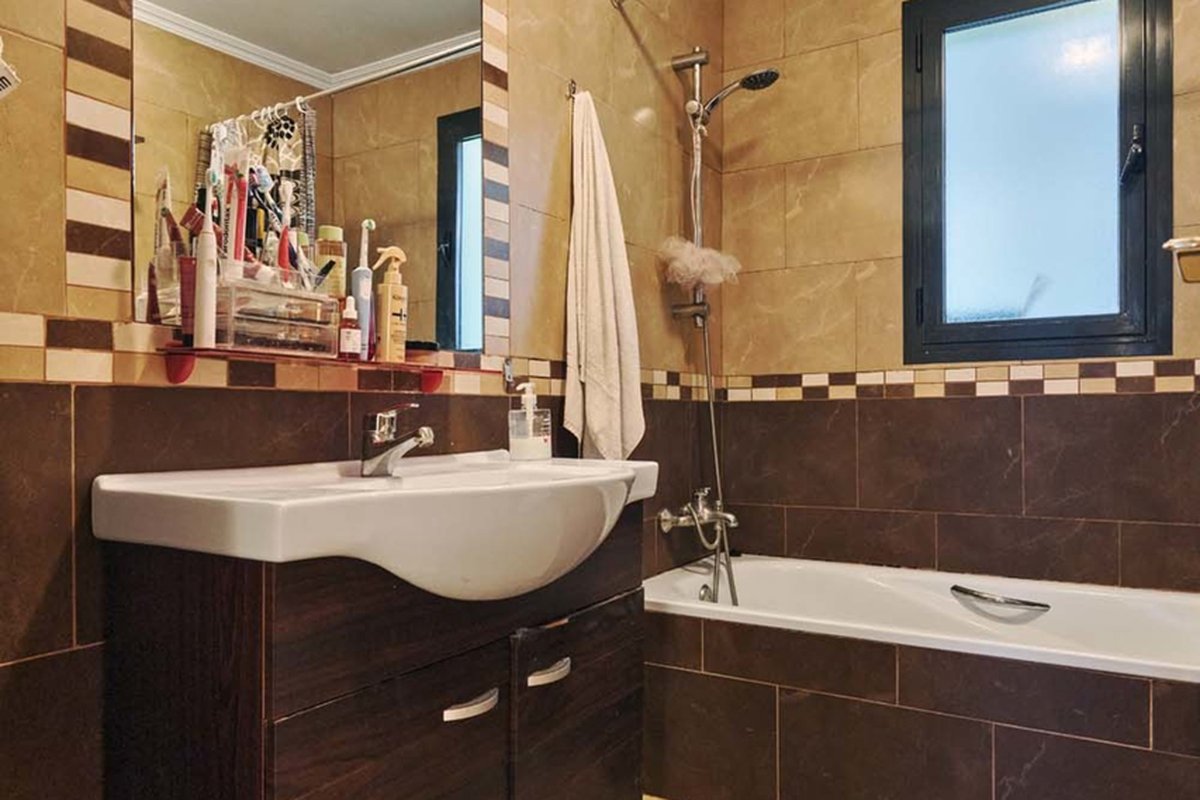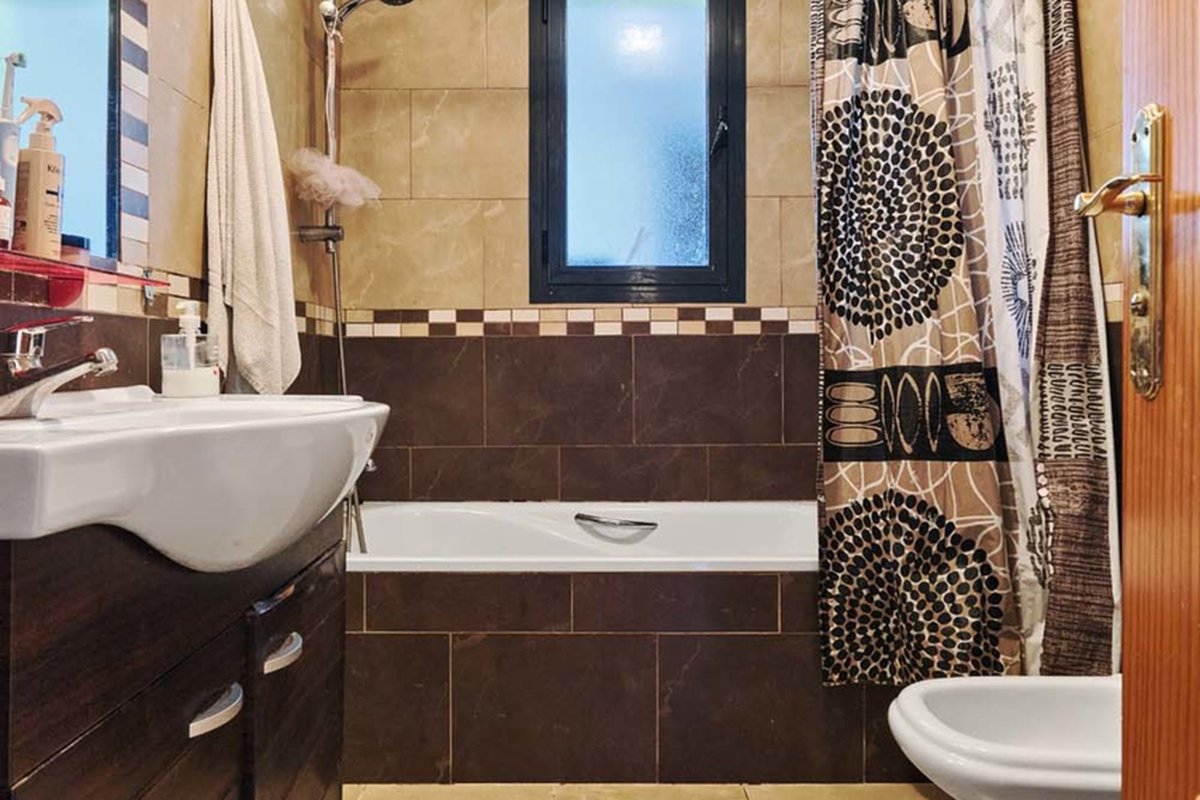 Stairs from the living area lead to the first floor, to the front is the master bedroom with air conditioning, built in wardrobes and a patio door leading to a terrace with views of the communal swimming pool. Next door is a second double bedroom with built in wardrobes, air conditioning and patio doors leading to a covered and glazed terrace, this space is currently used as a play room but could be an office or fourth bedroom if needed also located on this floor is the second bathroom with bath tub.