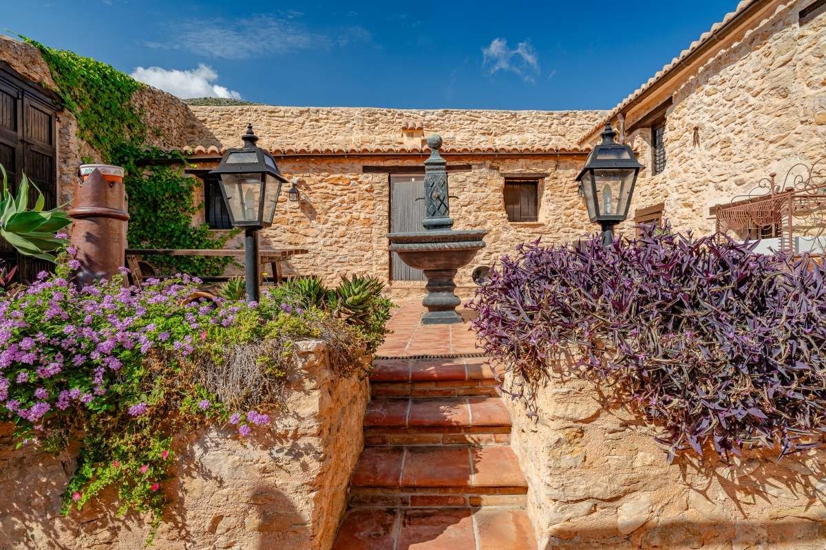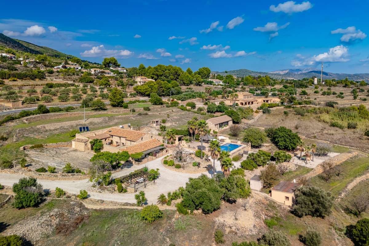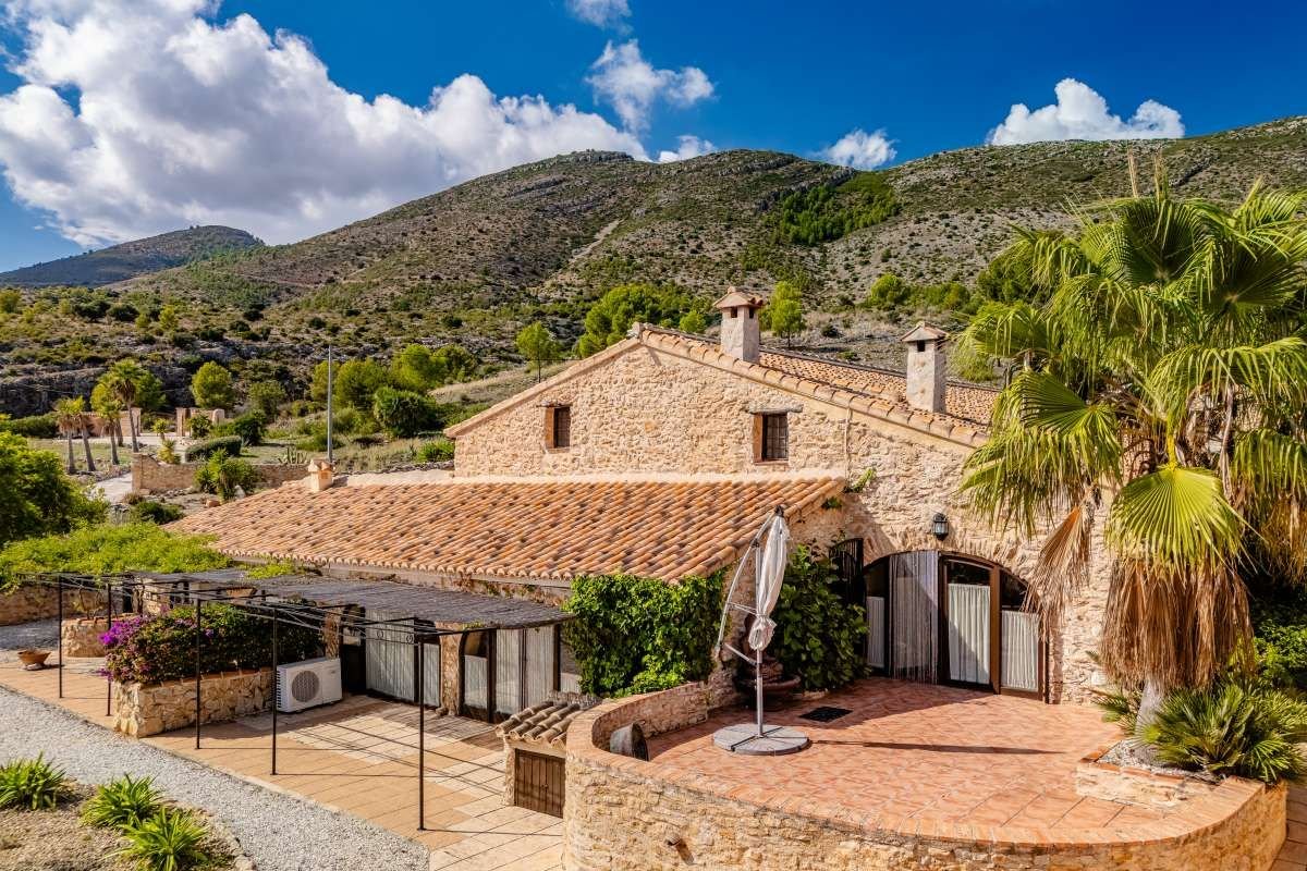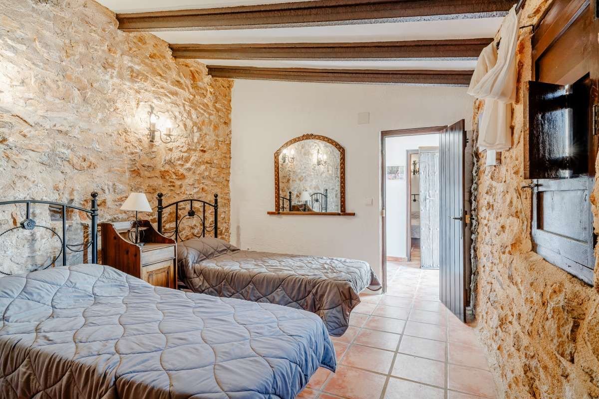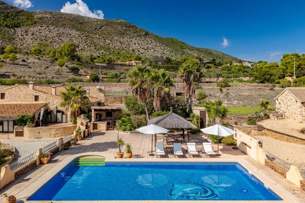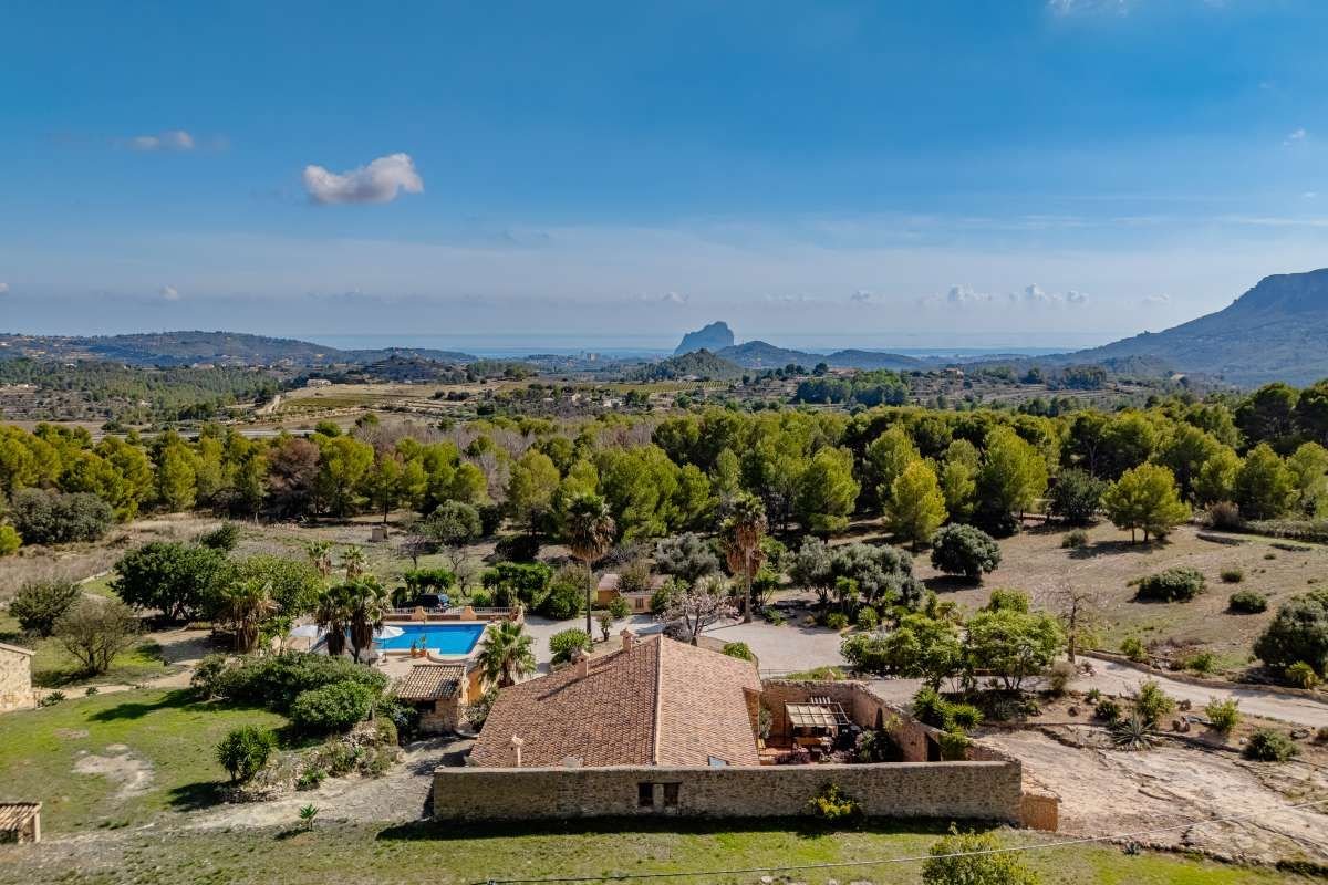 The Finca Vinyent is uniquely situated along the Mediterranean with its privileged location on flat land offering magnificent views of the Penon de Ifach de Calpe, the sea and the Sierra de Olta, making it an ideal place to seek peace and tranquility. With no immediate neighbors, this extraordinary property within the green valley of Benissa is near Hipica town, and is not far from restaurants and shops.~Full of elegance and exclusivity spread over 650sq.m, the Finca is surrounded by a magical natural landscape and 300 years of rich history. Each of its 8 rooms plus 2 apartments have their own individual character thus forming a special and incomparably harmonious unit. Embedded in this typical landscape is the distinctive architectural style of the property which is light brown like the surrounding terrain, as well as the rocks on the walls. The architecture of the walls and the ceilings is also harmonious with the furniture and radiates a warm and comfortable atmosphere.~Outside, there is the pool and an adjacent Mediterranean garden of citrus and tropical fruit trees. Both are isolated thereby affording you the privacy you need to unwind and relax. After a refreshing swim, the sun loungers on the pool terrace are ideal for sunbathing or taking a nap outdoors. The straw pavilion has style and invites you to enjoy a refreshing sangria. Of course the field offers the possibility of a cozy barbeque in the spacious barbeque area. You can also choose to enjoy a front row seat to watching the picturesque sunset.~Depending on the season and the time of day, you can choose between several outdoor rest areas to sit, relax and enjoy a glass of your favorite beverage. In this intact nature, you can also go hiking or take a walk. The nearest town of Benissa is easily accessible by car. The picturesque beaches of Calpe with its fine sand and crystal clear water can be reached in just 15 minutes. ~The additional possibility of converting the Finca Vinyent into a small charming hotel makes the property a perfect investment. Contact us today to arrange for a site visit.~