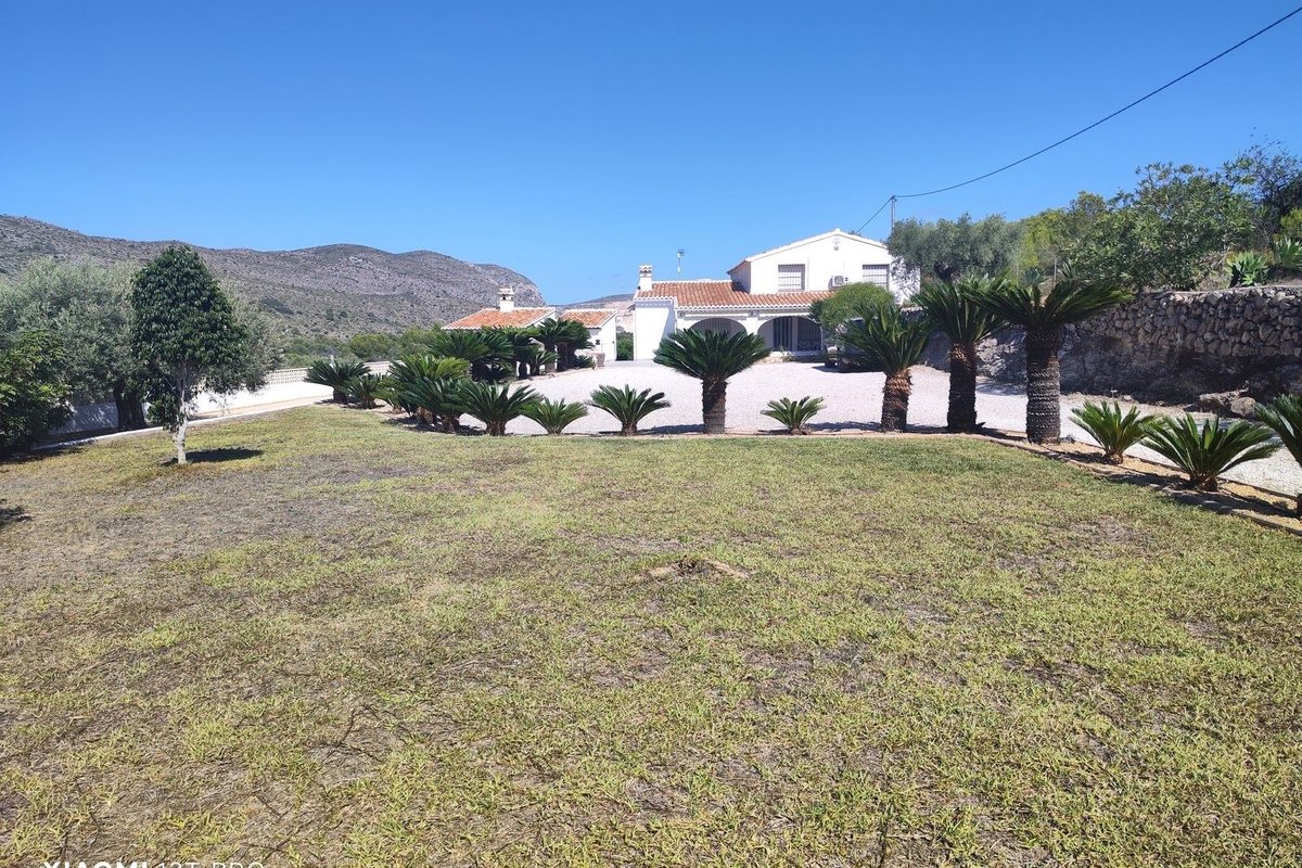 Charming villa with private pool in Benissa (Costa Blanca, Alicante). Here you can enjoy peace and nature, while still being close to the towns of Benissa and Moraira-Teulada. In addition, the coast with the beaches of El Portet and L`Ampolla in Moraira is a relatively short distance away.~~Everything you need for comfortable living is available: shops, supermarkets, cafés, restaurants, medical centre, private and public schools, childcare — everything is available. The beautiful beaches of Calpe and Moraira are 9.5 km and 13.5 km away, respectively.~The property is spread over two floors:~~Ground floor: Here you will find a spacious living and dining room with a fireplace, a fully equipped kitchen, a bedroom and a bathroom, with access to the laundry room with a washing machine and shelves for storing provisions or other items, and a garage.~First floor: accessible via a staircase, with three bedrooms and a bathroom. Each bedroom has recently installed air conditioning.~~Outside there is a covered outdoor kitchen with barbecue and sink, as well as a bathroom with shower and toilet. In front of the house is the 10 m x 5 m swimming pool. An awning has been installed at the front of the terrace. The garden has an automatic sprinkler system, a lawn and is planted with various low palm trees, recently planted olive trees, apricot trees, orange trees and fig trees.~The property has central gas heating and air conditioning for cooling and heating. The windows are fitted with insect screens and roller shutters. There is a very good internet connection via the STARLINK installation. The plot has two entrances, one of which has an electric gate.~