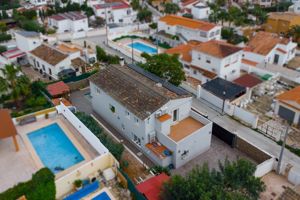 Spacious villa 900 m from the sea for sale in Calpe.~~This charming villa is located in the quiet and pleasant Carrio urbanisation, within walking distance of the coast. The property is distributed over two floors and offers a spacious living-dining room, a kitchen, 4 bedrooms and 3 bathrooms, ideal both as a permanent residence or a holiday home. In addition, the villa features a large garage with direct access to the house, several photovoltaic solar panels, built-in wardrobes and air conditioning, contributing to energy efficiency and comfort.~~Outside, there is a private swimming pool with a covered lounge area and outdoor shower, where thanks to its south-facing orientation you can enjoy the sun all year round.~~A move-in ready villa in a prime location!~