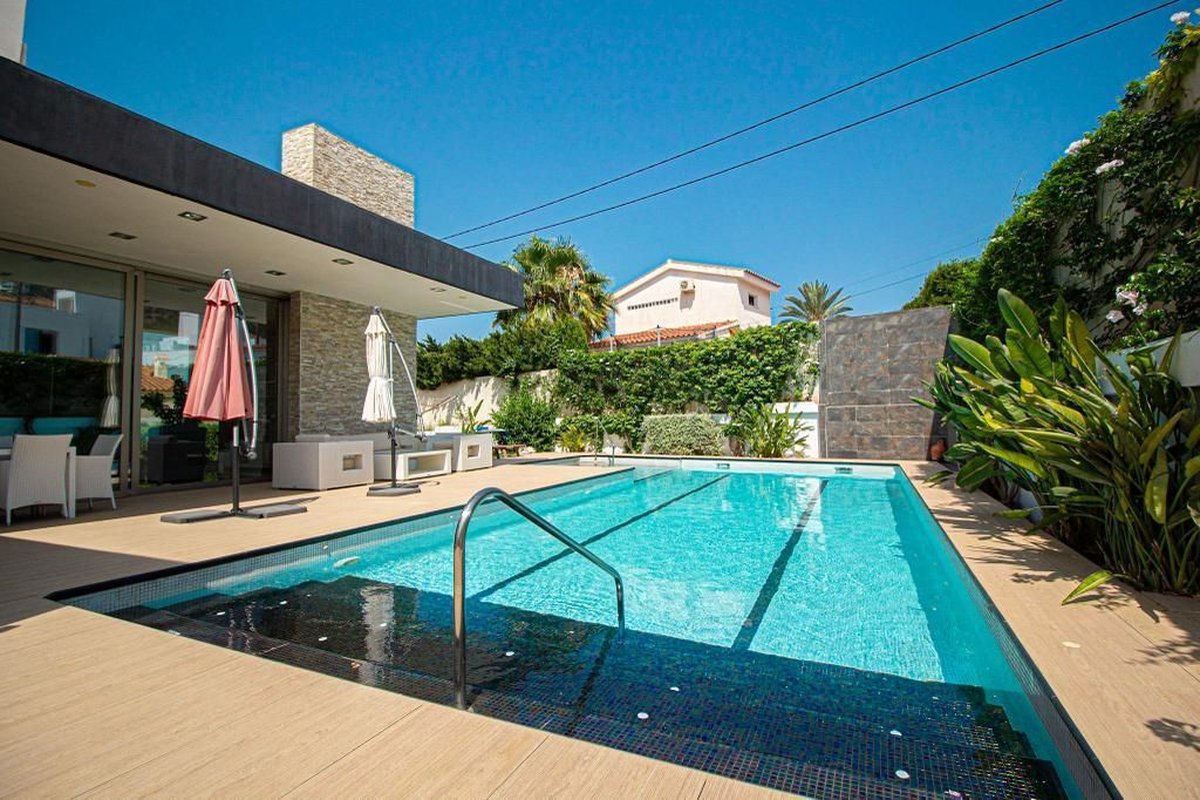 Luxury villa 900 meters from the beach. The plot area is approximately 1250 square metres, of which 355 square metres are in the built-up area. The distribution of the house is as follows: On the main floor there is a master bedroom with a magnificent walk-in wardrobe and an en-suite bathroom with whirlpool bath. Then there is a spacious living room with large windows of 3 meters high, which provides maximum natural light. This living room is connected to the designer kitchen with a beautiful granite island in the middle for cooking comfort. The kitchen also has access to a swimming pool of 61 metros with jacuzzi and waterfalls. Adjacent to the kitchen is a laundry room connected by a pipe to the upper floor for the convenience of transporting laundry. Completing this floor is a guest bathroom and a room that can be used as an office. On the first floor there are four bedrooms, each with its own bathroom and a separate terrace. The first floor offers a terrace with panoramic views of the city, the sea and the mountains. As for the quality of the finishings, the floor is made of high quality porcelain stoneware and has underfloor heating. The windows are made of triple glazing, providing thermal and acoustic insulation. In addition to all this, the property is equipped with central air conditioning for hot and cold, and there is the possibility of installing a lift according to the floor plan. And finally, there is a magnificent garage of approximately 350 square metres and ceiling height 5 meters for 12 cars with an anti-seismic structure.