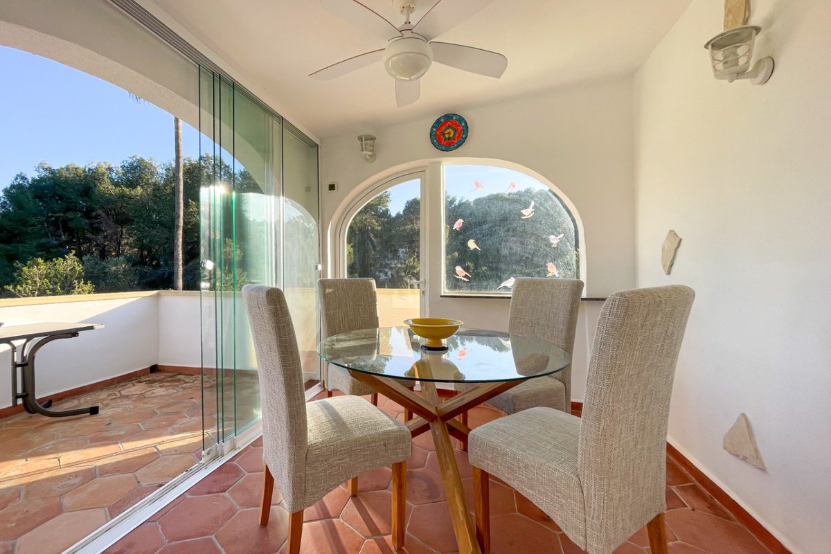 Villa for sale in Benissa La Viña with swimming pool and south-facing position. Spacious property with 5 bedrooms, solar panels, Energy Certificate A and possibility for two residential units on the Costa Blanca.In the quiet residential area of La Viña in Benissa, this well-maintained villa is for sale on the Costa Blanca on a flat plot with a south-facing position. The layout over two floors allows for a variety of uses. DescriptionThe upper floor has a living-dining room, a separate fully equipped kitchen and a porch enclosed by glass curtains with views of the green surroundings. This space connects to an open terrace. On this floor there is also a spacious bedroom with en-suite bathroom, a second bedroom (currently used as an office) and a separate bathroom. An internal staircase leads to the lower floor with three additional bedrooms, a bathroom, separate toilet, laundry room and extra storage. Two bedrooms are currently used as storage space and fitness or office space.The property is equipped with hot/cold air conditioning, pellet stoves on both floors, double glazing and electric shutters.The villa has solar panels, an automatic gate, carport, home automation and Energy Certificate A. The property is largely wheelchair accessible and can be divided into two independent residential units.From the porch, a staircase leads to the pool terrace with a large covered summer kitchen and lounge area, which can be closed off with sliding glass doors. The pool was renovated in 2023, heated and equipped with a cover and outdoor shower. Special featuresVilla for sale in Benissa – La ViñaFlat plot with south-facing position5 bedrooms and 4 bathroomsHeated swimming pool Huge summer kitchen, lounge areaSolar panels and energy class APossibility of two residential unitsWhy view this villaLocationLots of potentialSustainableA special villa for sale in Benissa with many possibilities. Great for year-round living, but also very suitable for rental.See for yourself and schedule a viewing with one of our sales agents today.