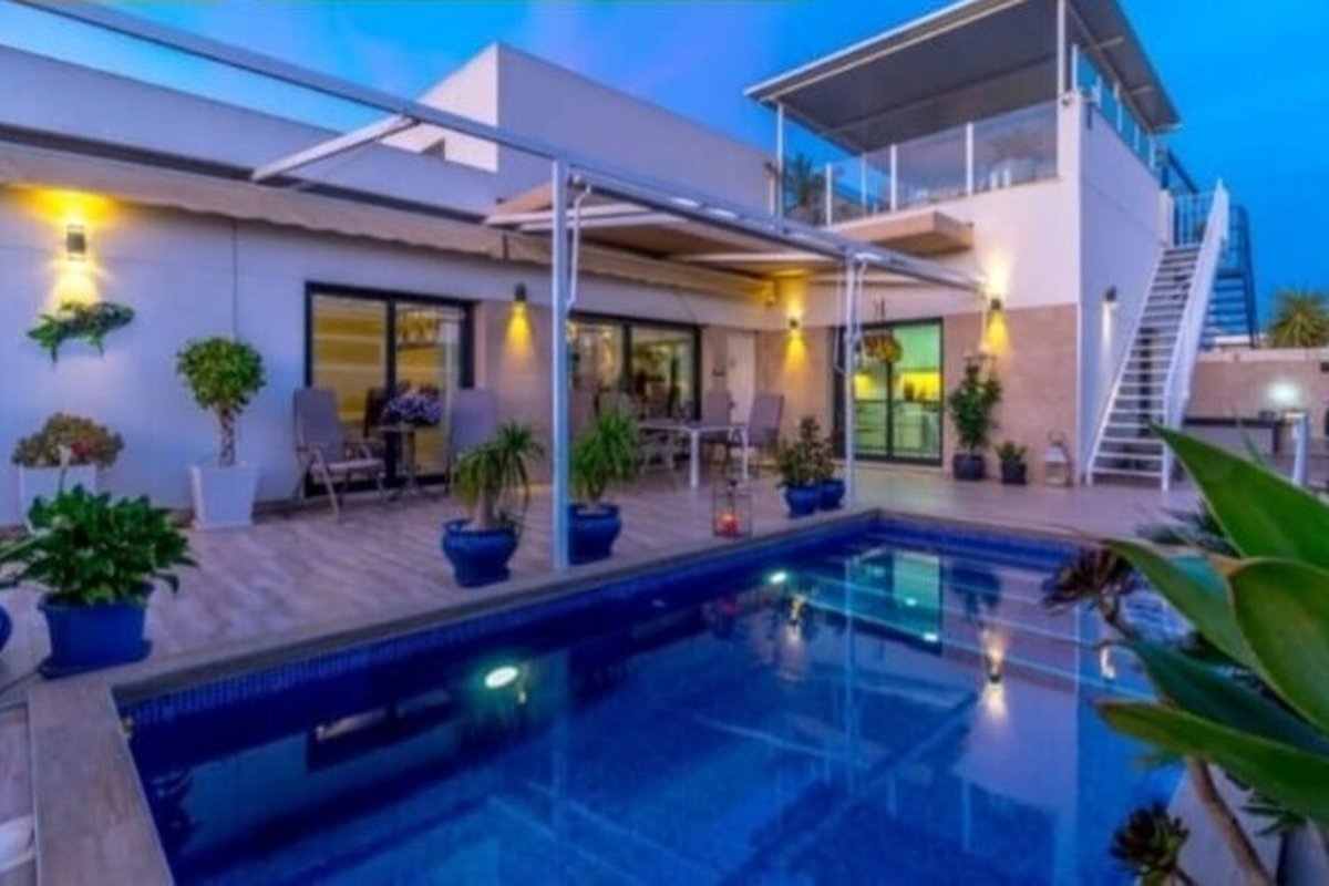 Detached villa on one level.Located in the new part of the municipality of Daya Nueva, a short walk from the town center.The property has 2 bedrooms and 2 bathrooms, with a constructed area of 120 m2 on a 242 m2 individual plot with a private pool.The living-dining room has an open kitchen, natural light, a patio, and stairs to the solarium.The bedrooms have built-in wardrobes, and the master bedroom has an en-suite bathroom and patio doors opening onto the terrace and pool.In a peaceful setting, approximately 10 minutes from the beaches of La Marina del Pinet and Guardamar del Segura.With easy access to the A-70 motorway and approximately 25 minutes from Alicante Airport.