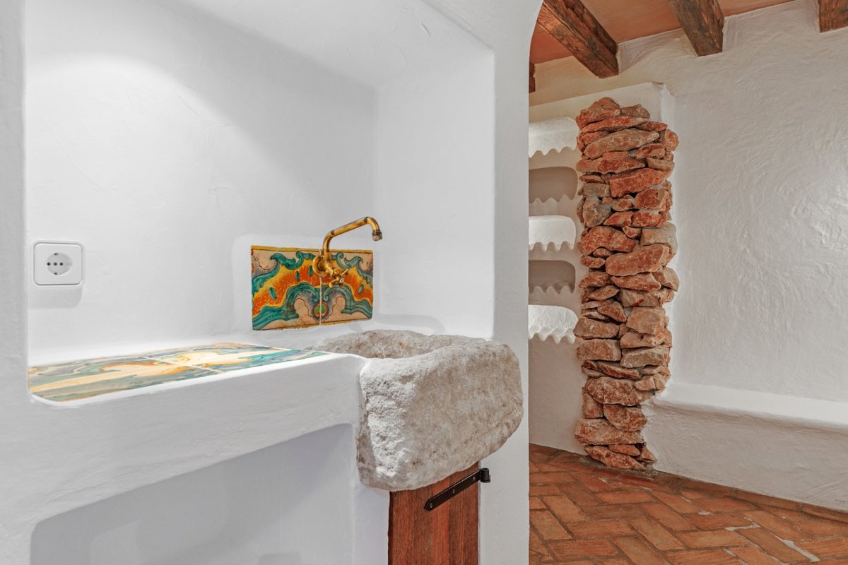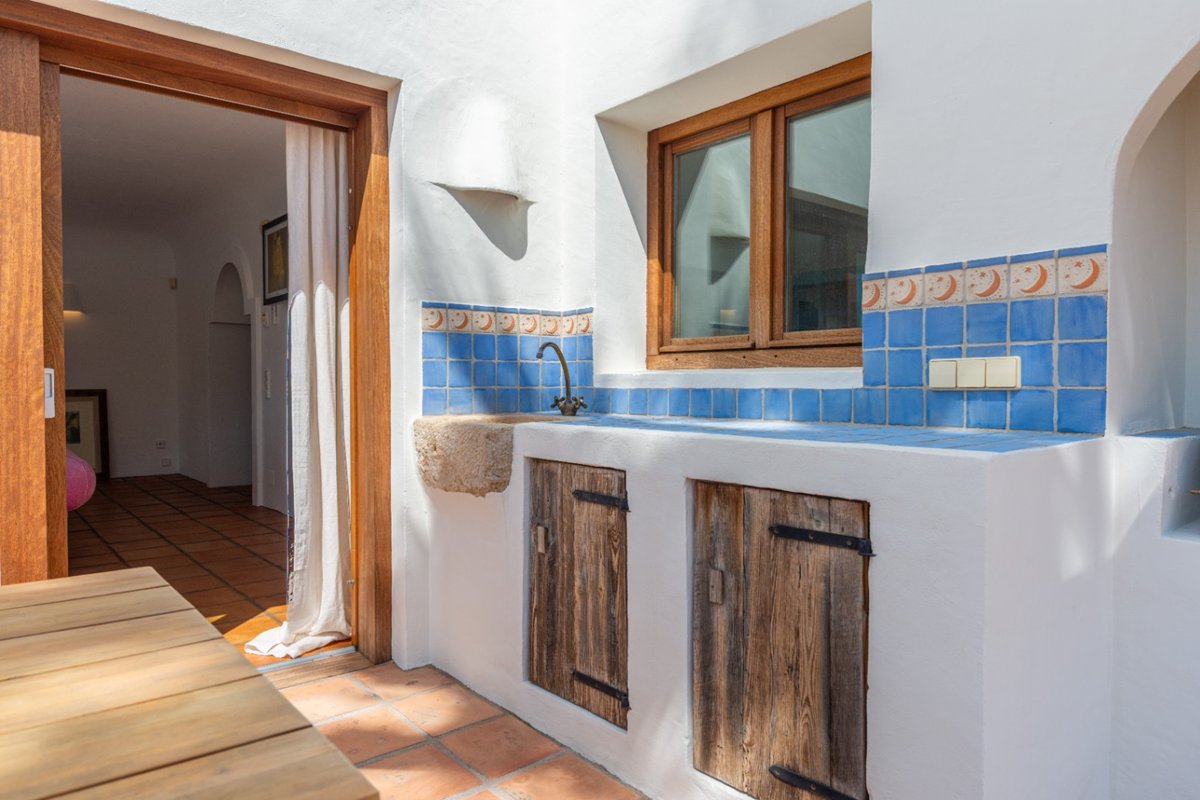 Luxury villa with sea views in Ibizan style in El Portet in Moraira for sale.This beautiful Ibiza-style villa, built with very select materials, was constructed in 2007 and completely renovated in 2024. This cozy villa, with all details well cared for, is just 1 km from the famous sandy beach of El Portet.We enter into the hall with a guest toilet and find a spacious living room with two porches overlooking the sea, surrounding the pool, the jacuzzi on the same level, and the garden. From the living room, we access to a large dining-living area next to the kitchen with a laundry room. On the upper floor is the master bedroom with an en-suite bathroom and dressing room. We also find a large terrace on this floor with beautiful views of the sea and mountains. On the lower floor, there are two bedrooms and a spacious bathroom. It is possible to add a second bathroom. This floor also has a bodega and a technical room.The villa features underfloor heating and air conditioning. The appliances are new. Quality furniture, an alarm system, and wifi are included. The garden has an automatic irrigation system.The double-glazed windows are new. Great care has been taken to create a special atmosphere with beautiful rustic beams and details. The villa is in perfect condition.There is a covered and enclosed parking space for two cars plus another pedestrian entrance. Lighting is provided throughout the house and garden.A villa ready to move into.If you wish to add your personal touch, our interior designer Luna can create a completely customized interior design project according your taste. Design Villas Moraira has its own construction team.
