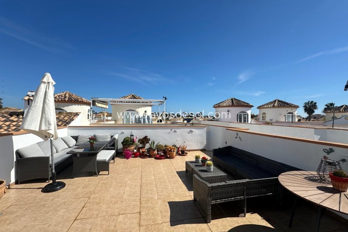 Outside, you'll enjoy off-road parking and a sunny south-facing terrace at the front . Stairs lead to the solarium , which offers stunning views of the Torrevieja salt lakes . In addition, there is a very well-maintained communal swimming pool that is never too busy — ideal for relaxing in peace.
