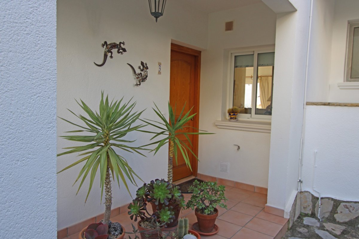 Situated within an exclusive residential community just a short distance from the charming town of Jalón in the heart of the Vall de Pop, this delightful townhouse enjoys truly breath-taking views across the valley and surrounding mountains. The ground floor offers a spacious, open-plan living and dining area with fire place and potential to install a wood burner or pellet burner , along with air conditioning (hot and cold) and gas central heating. A large sliding glass door leads directly onto a covered terrace and a beautifully maintained private garden—an ideal space to relax and enjoy the peaceful surroundings. The fully equipped kitchen features a convenient serving hatch, and this level also includes a large bathroom with bath and overhead shower and a double bedroom, currently used by the owners as a dining room.Upstairs, the bright master bedroom benefits from fitted wardrobes, air conditioning, central heating, and direct access to a covered terrace with stunning panoramic views of the valley and mountains. The second double bedroom offers similar features and opens onto an additional terrace, again boasting lovely views. A family bathroom with a bath and overhead shower completes this floor. The property is equipped with gas central heating, air conditioning throughout, and double glazing for year-round comfort and alarm system. A private parking within the urbanisation is also included.The small, well-maintained community features a fantastic communal swimming pool, recently renovated, with shower facilities, sun terraces, and a grassed area—all enjoying spectacular panoramic views of the valley.This elegant townhouse is ideal as a permanent residence within a friendly, multinational community, or as a secure lock-up-and-leave holiday home. Properties of this quality and location are in high demand, so early viewing is highly recommended