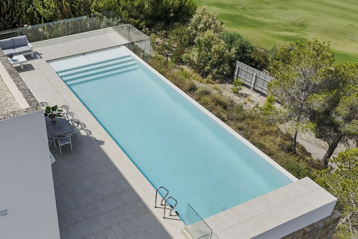 A luxury villa first line to the Las Colinas golf course in Orihuela Costa, this property boasts a stunning infinity pool with views of the course, endless terraces, a cosy back garden, parking for two cars and a beautiful, bright living, dining and kitchen area. There are a total of four bedrooms and three bathrooms as well as a guest toilet split across two levels with the main living level housing three bedrooms, two bathrooms and the guest toilet and a lower groundfloor hosting a suite with walk in wardrobe, ensuite bathroom and a private terrace that has stairs both up to the pool terrace as well as to the parking. The villa is characterised by a feeling of space, privacy and tranquility. It is situated on the 'golf island' on Las Colinas which is an exclusive villa area surrounded by the course. Las Colinas is a secure gated community with restricted access and 24 hour security patrols. It is also an area known for its natural beauty and a perfect place if you want to live healthily with sports facilities, numerous restaurants, a nature trail and naturally, the golf course, which is multi award-winning.