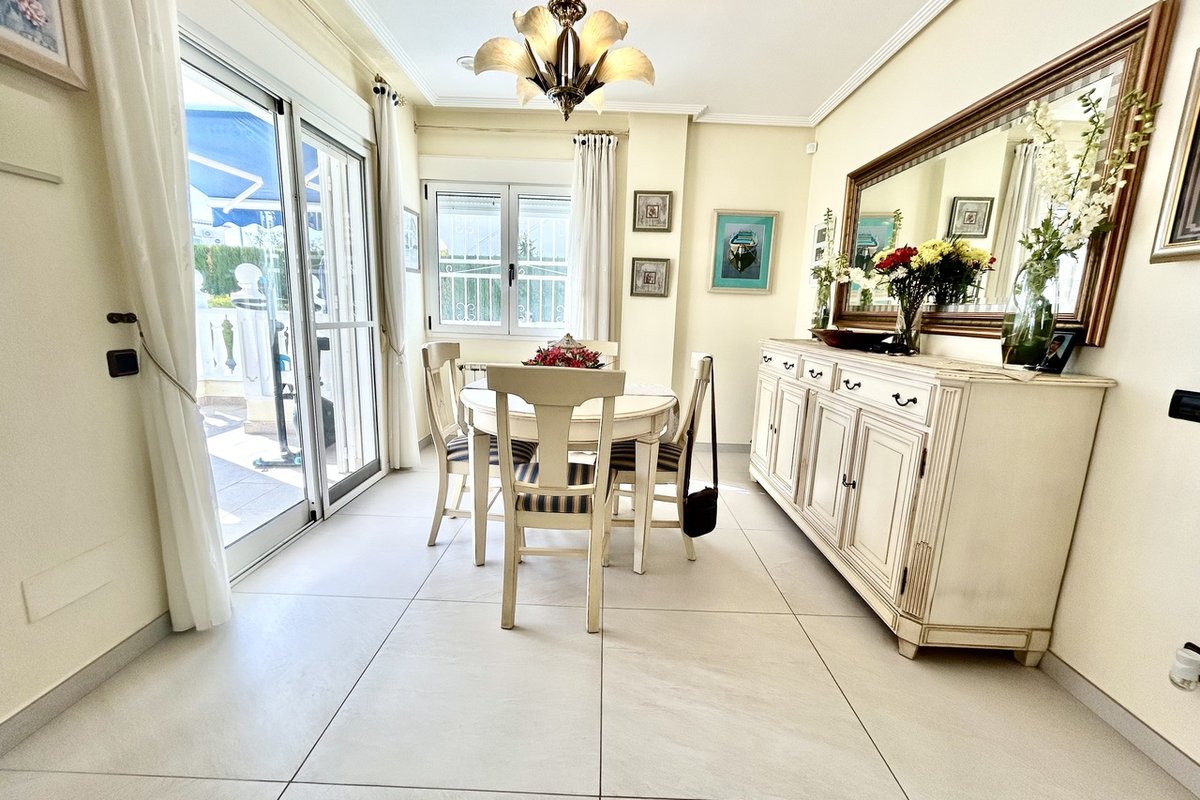 Nestled in the heart of Pinar de Campoverde, this stunning 4-bedroom, 3-bathroom villa offers the perfect blend of comfort, space, and Mediterranean lifestyle — all just a short stroll from local bars, restaurants, shops, and everyday amenities.Designed for both relaxed family living and effortless entertaining, the property boasts a private swimming pool, beautifully landscaped gardens illuminated with solar lighting, and a fully equipped outdoor kitchen — ideal for hosting guests and enjoying long summer evenings. For added peace of mind, the villa is fitted with security cameras throughout.Inside, the home is equipped with oil central heating and air conditioning, ensuring year-round comfort.The main level welcomes you with a spacious and bright living room, complemented by a dedicated dining area and a separate modern kitchen. Also on this floor is the impressive master bedroom featuring a contemporary ensuite bathroom.Downstairs, you’ll find a large entertainment area — perfect as a games room, cinema space, or guest suite — along with an additional bedroom and bathroom, offering flexibility for visitors or extended family.The top floor hosts two further bedrooms and two bathrooms, all finished to a high standard. From here, you can enjoy beautiful sea views, which are also visible from the expansive terrace — a perfect spot for morning coffee or sunset relaxation.Completing the property is a large private garage, providing secure parking and additional storage.This villa combines an excellent central location, generous living space, and desirable outdoor features, making it an exceptional opportunity whether as a permanent residence, holiday home, or investment.