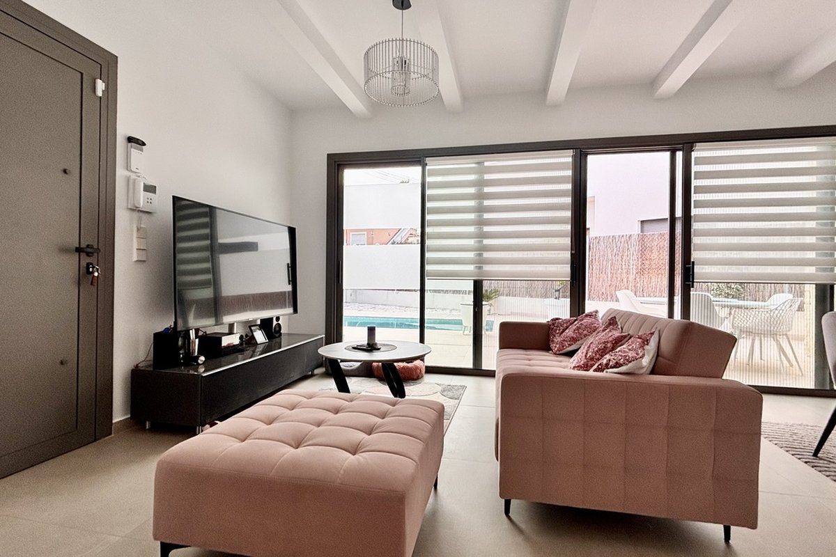 Villa on sale with three rooms, private pool and solarium. Villa was built in 2024, situated near Golf Area, supermarkets and International school. It's selling with furniture. Each room is equipped with built-in wardrobes, providing ample storage space. The villa offers two bathrooms, one of which is en-suite to the master bedroom.At the back of the villa, there is a private backyard featuring a summer outdoor shower, a well-maintained lawn, and comfortable outdoor furniture — an ideal space to relax and enjoy your leisure time.The villa is fitted with an integrated air conditioning and heating system, ensuring comfort throughout the year. The house is in excellent condition, as it has not been lived in for a long time.The kitchen comes fully equipped with built-in appliances and everything needed for comfortable living.
