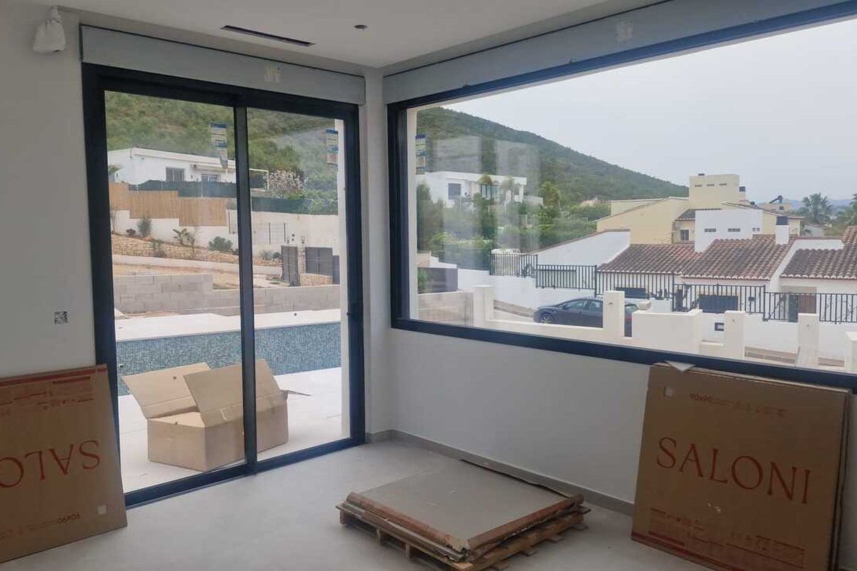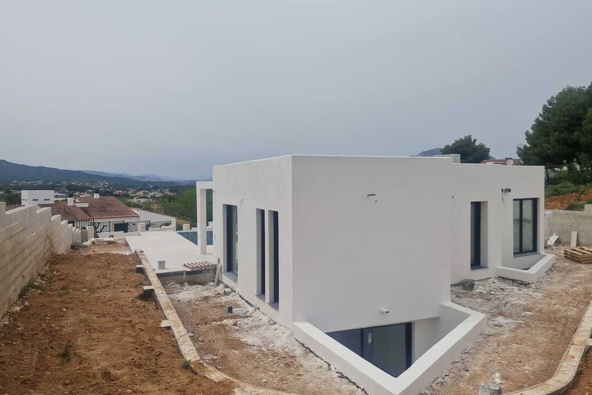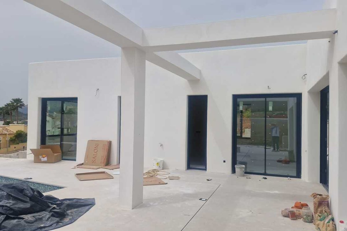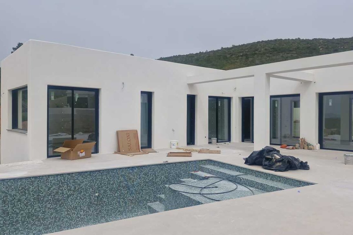 This contemporary Ibiza-style villa, currently in its final stages of completion, offers 400m² of living space on a generous 1,000m² plot in Javea's sought-after Val Sol area. The property boasts a privileged west-facing orientation, framing breathtaking mountain vistas. The upper level features an expansive 80m² terrace combining kitchen, lounge and dining areas, complemented by two generously proportioned bedrooms with en-suite bathrooms. The lower level accommodates an additional guest suite comprising two further bedrooms and bathrooms. Centered around an infinity pool, the residence sits on gently sloping terrain, presenting an exceptional opportunity to acquire a modern villa at a competitive price point. The interior finishes have been carefully curated in a sophisticated neutral palette of whites, greys and beiges, creating an elegant and timeless aesthetic.