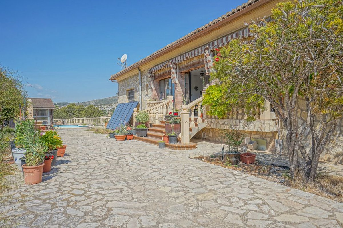 This beautiful country house is located on a plot of over 10,000 m2, centrally situated in the valley between Benitachell and the bay of Jávea. The property enjoys panoramic views over the rolling landscape all the way to the Montgó mountain in Jávea.~On the south side of the villa there is a large naya with a fireplace. From here, a long hallway provides access to the kitchen, dining room, living room with fireplace, guest toilet and a double bedroom. The hallway ends in a spacious double bedroom with en-suite bathroom and a balcony. The kitchen also provides access to a large balcony and is complemented by a practical utility room.~The lower floor consists of two spacious rooms, a bathroom and a private terrace. This level also includes three garages with direct access to the house, a wine cellar, a large storage room and a technical room.~In addition, the property features an attic that extends over the entire surface of the house, offering exceptional additional storage space.~Adjacent to the house is a sun terrace with swimming pool and a charming wooden pergola. A large part of the plot is currently planted as a vineyard with three different grape varieties: Chardonnay, Merlot and Tempranillo. There is also a large, flat area with a variety of fruit trees, as well as a spacious greenhouse currently used for garden storage.~The property has its own water well and is equipped with both thermal and photovoltaic solar panels, making it particularly energy efficient. In addition, the house is connected to the mains water and electricity networks.~Thanks to its central location, the village centre of Benitachell can be reached within just 3 minutes, offering all amenities such as supermarkets, schools and pharmacies. The sandy beach of Jávea is approximately 12 minutes away by car, while Moraira can be reached in around 15 minutes. Jávea Golf Club is located less than one kilometre away.~An exceptional property in an idyllic setting, ideal for those seeking peace, space and nature.~