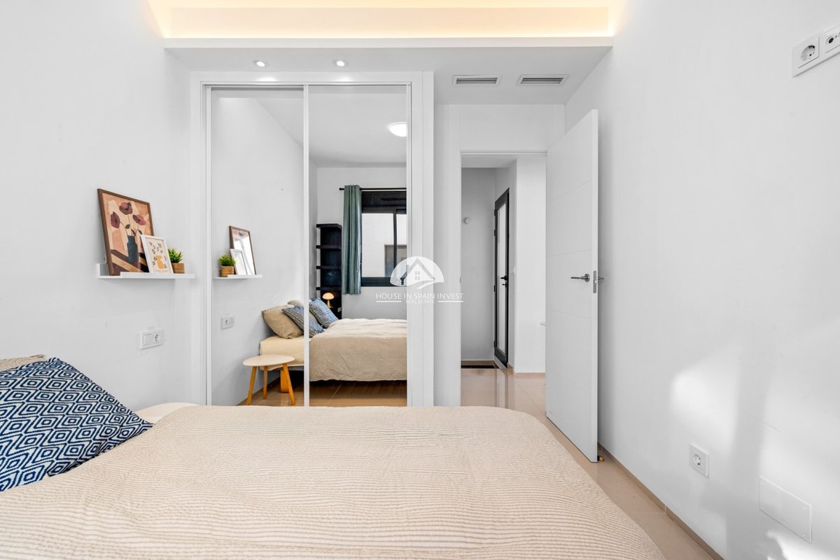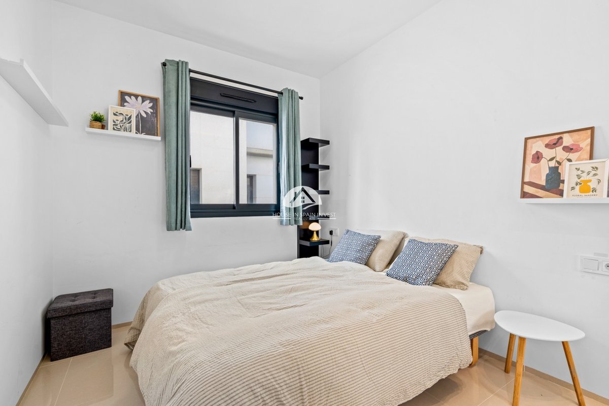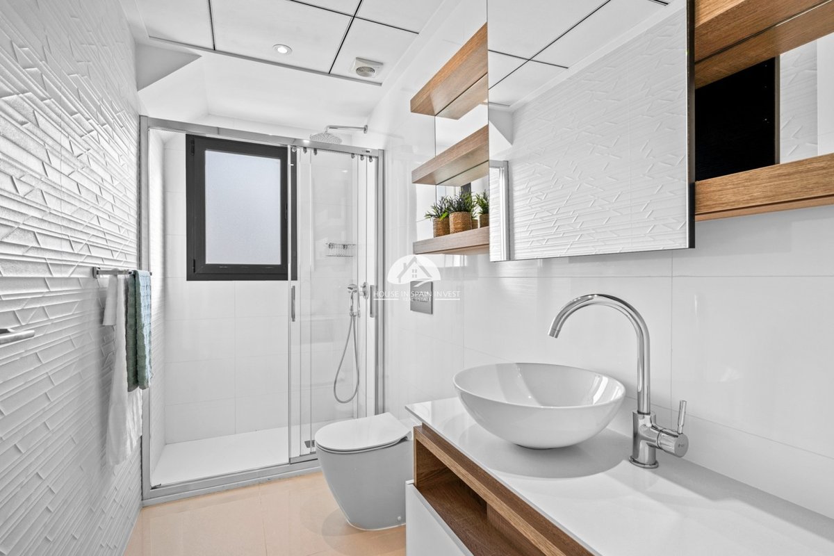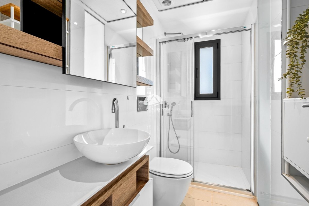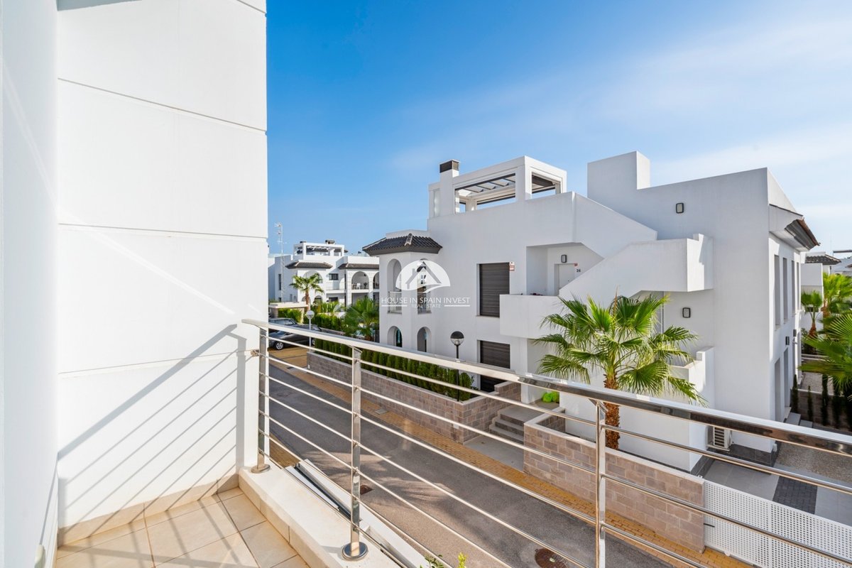 On the ground floor, you’ll find a spacious living room with large French windows that allow plenty of natural light to fill the space. The open-plan kitchen connects to the living area. From the living room, sliding glass doors open onto the terrace located by the entrance. Upstairs, you’ll find three comfortable bedrooms and two bathrooms. Both main bedrooms have their own private terraces with lovely views overlooking the community pool area. External stairs lead up to a spacious rooftop solarium, that includes a shower and a kitchen/BBQ with panoramic views.