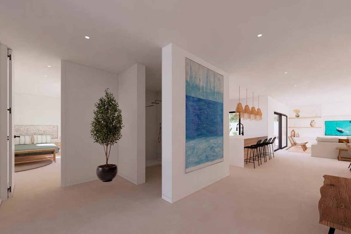 This contemporary Ibizan-style villa embodies light, space, and refined design. Set on a generous 800 m² plot, the home spans approximately 394 m² of built space, including four spacious double bedrooms and three luxurious bathrooms. The architecture emphasises open-plan living with seamless transitions between interior and exterior areas. Floor-to-ceiling windows flood the home with natural light, while terraces, a private swimming pool, and landscaped gardens create a resort-like atmosphere.