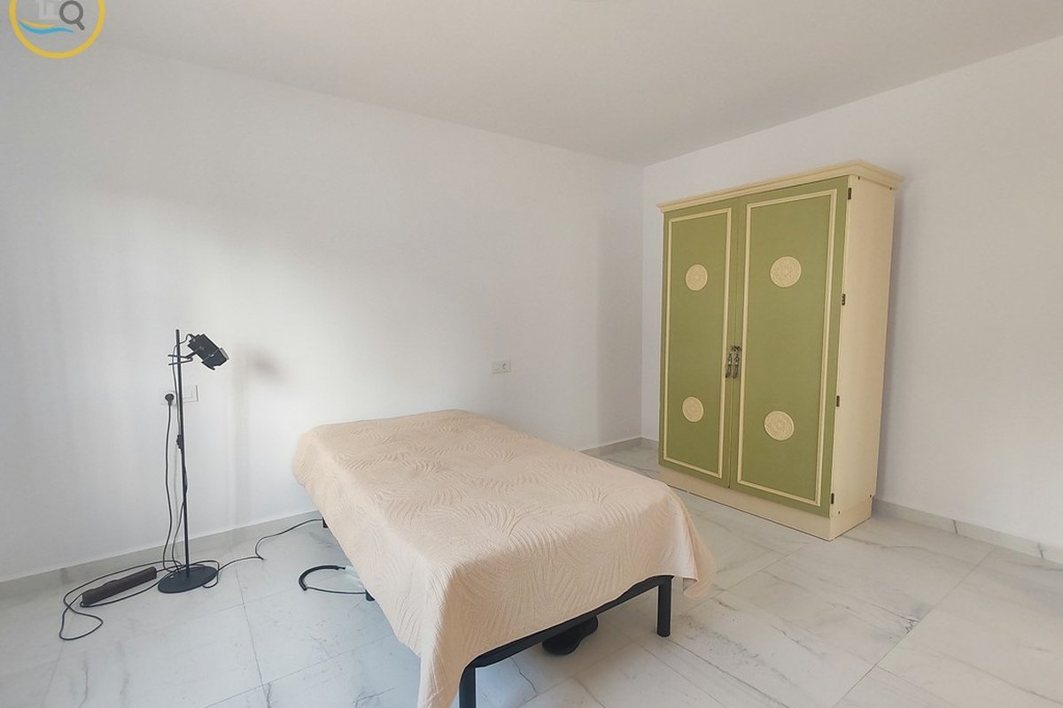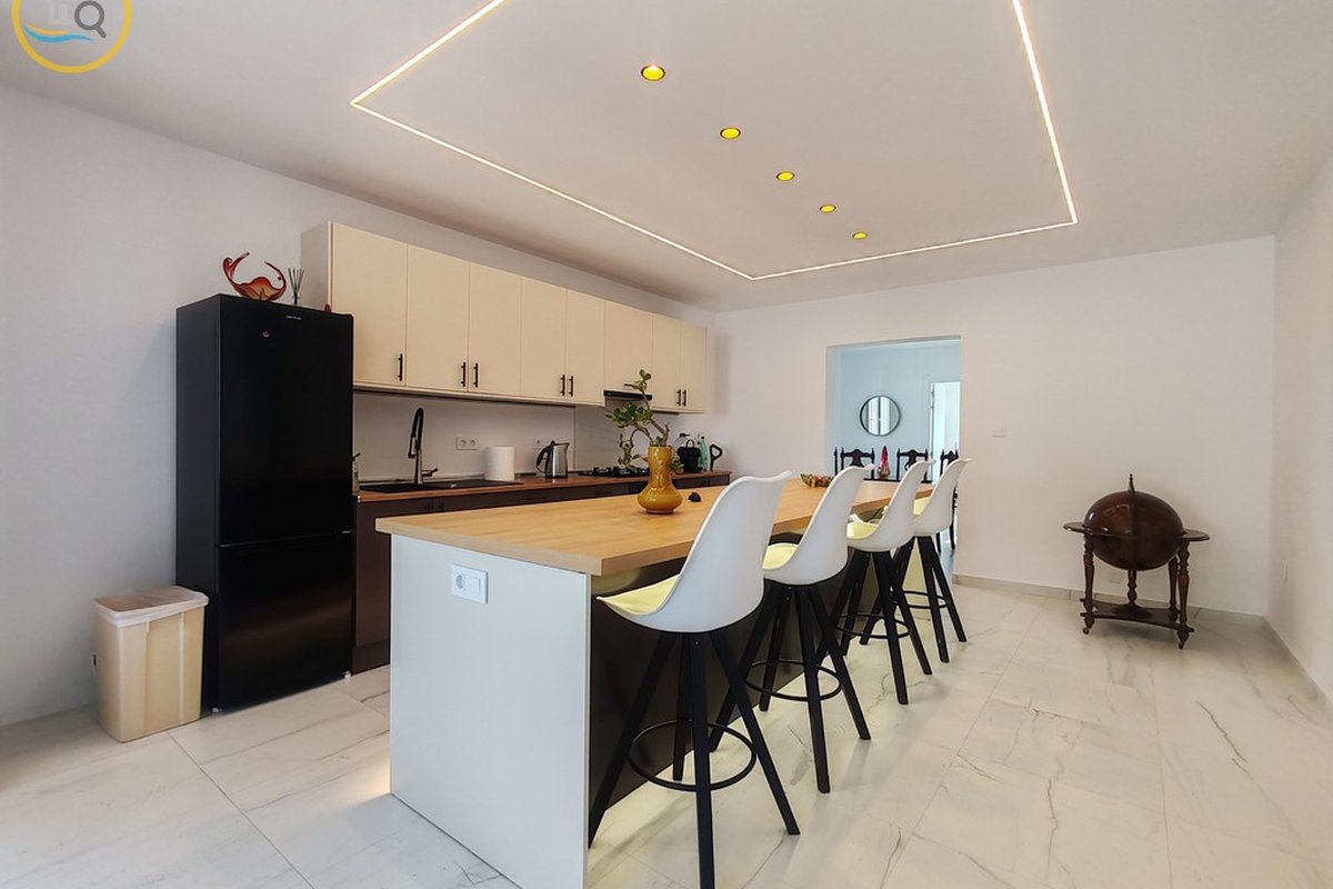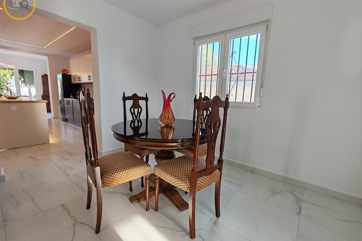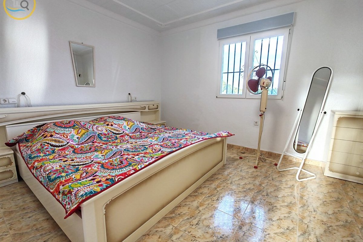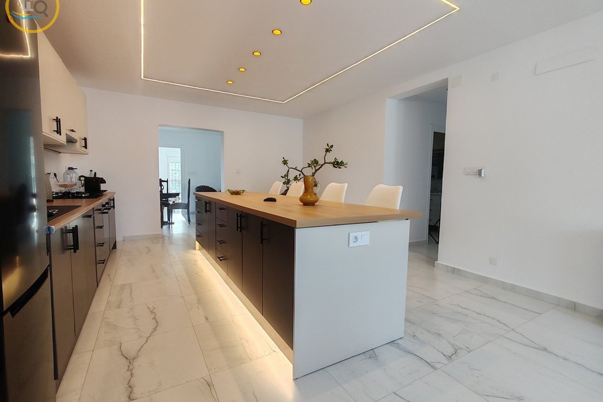 This plot has parking with space for several cars. The villa is currently divided into two separate spaces on the ground floor which are accessed through a glass door that opens onto a spacious and bright open-plan kitchen recently installed with a large central island and a dining room. To the right of the kitchen is a hallway that leads to a spacious bedroom, a family bathroom, and a small room that could be used as an office or dressing room. At the rear of the kitchen is a good-sized living room and a door from the living area that leads to a covered terrace. A second door in the living room leads to a spacious master bedroom with a private balcony.