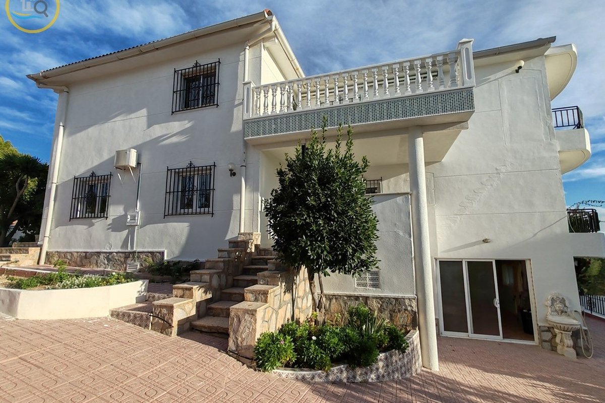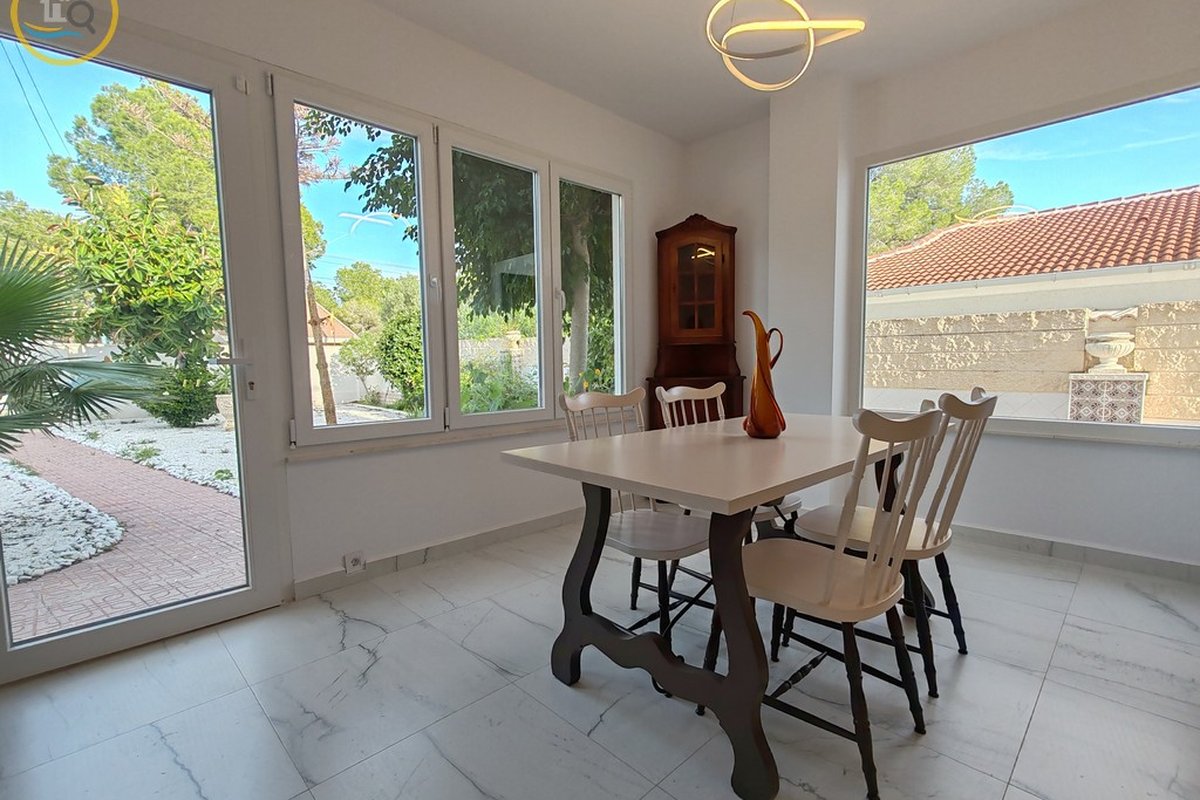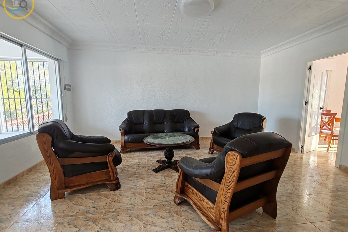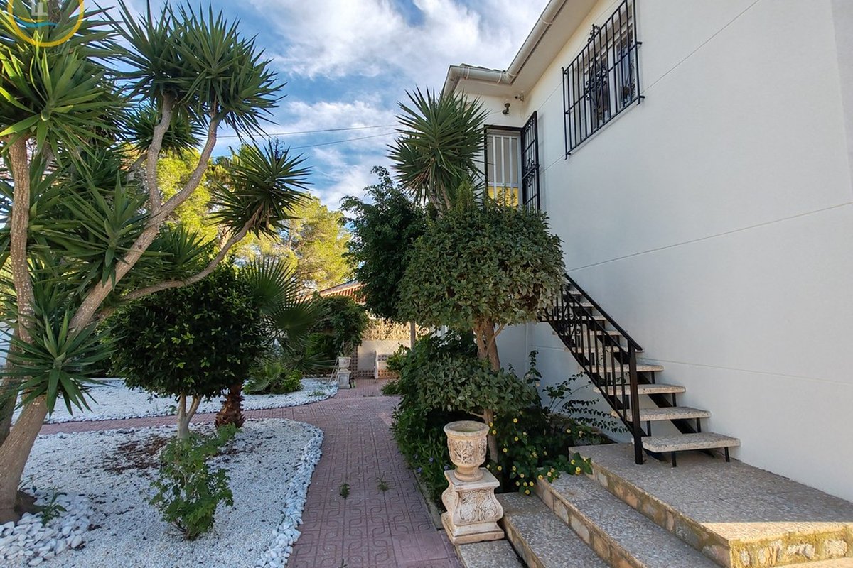 A set of external stairs from the front of the villa leads to the second half of the house, which consists of a glazed room, a spacious living room, a large fully equipped independent kitchen, a family bathroom, a double bedroom, and a small bedroom. At the rear of the property there is another large master bedroom with glass doors that open onto the terrace, and there is also a second door that leads to another terrace with awnings. This property has a storage room and what was a garage that was used as a summer kitchen, this area has electrical and water connections. On the side there are steps leading to the pool area and the terrace and an outdoor bar with barbecue. This property is sold furnished.