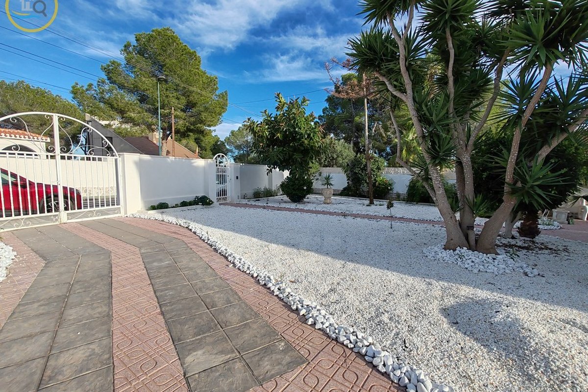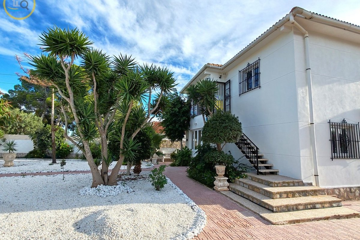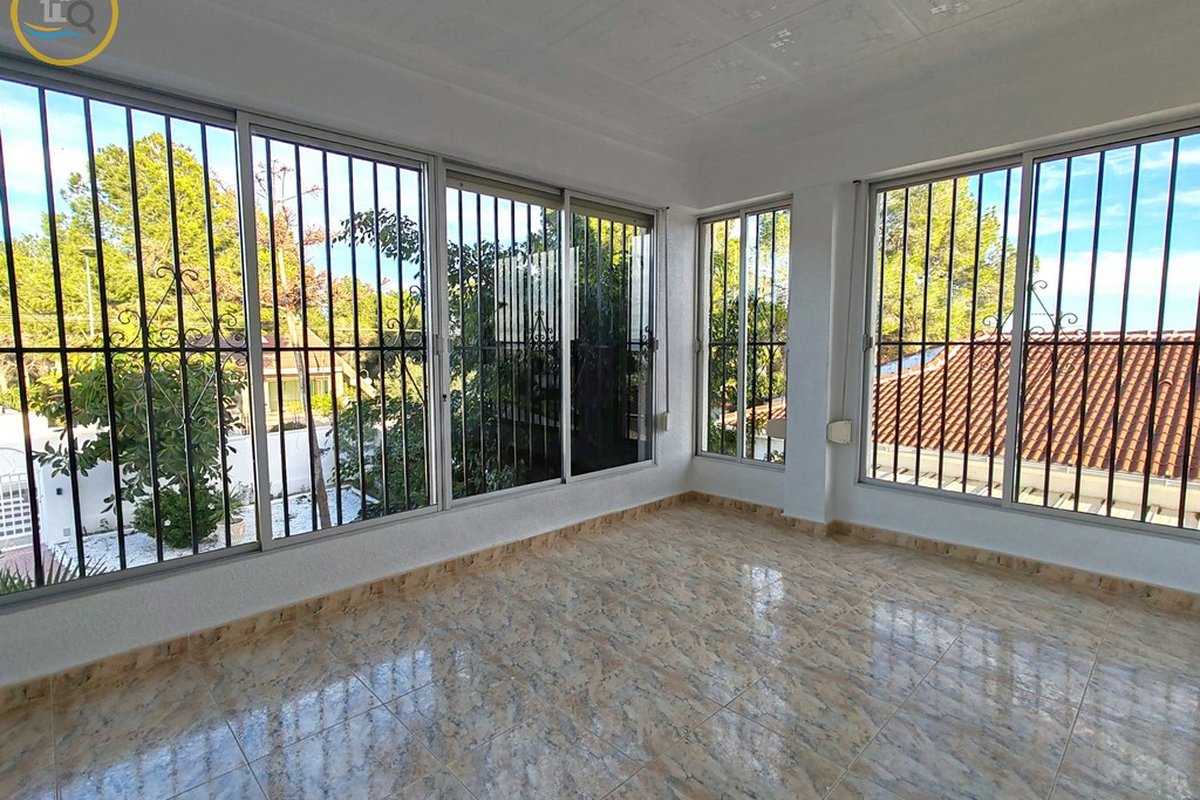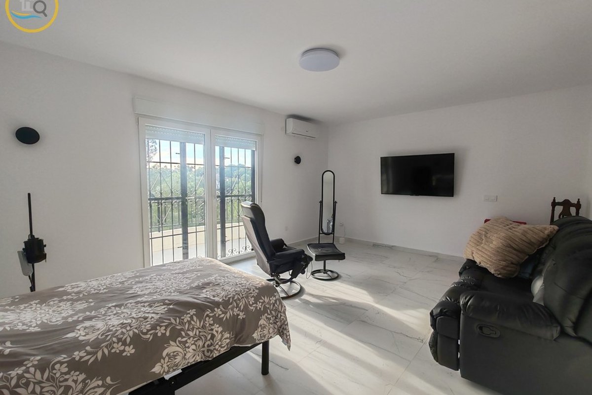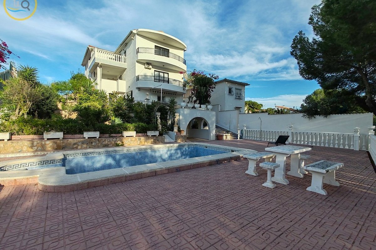 A set of external stairs from the front of the villa leads to the second half of the house, which consists of a glazed room, a spacious living room, a large fully equipped independent kitchen, a family bathroom, a double bedroom, and a small bedroom. At the rear of the property there is another large master bedroom with glass doors that open onto the terrace, and there is also a second door that leads to another terrace with awnings. This property has a storage room and what was a garage that was used as a summer kitchen, this area has electrical and water connections. On the side there are steps leading to the pool area and the terrace and an outdoor bar with barbecue. This property is sold furnished.