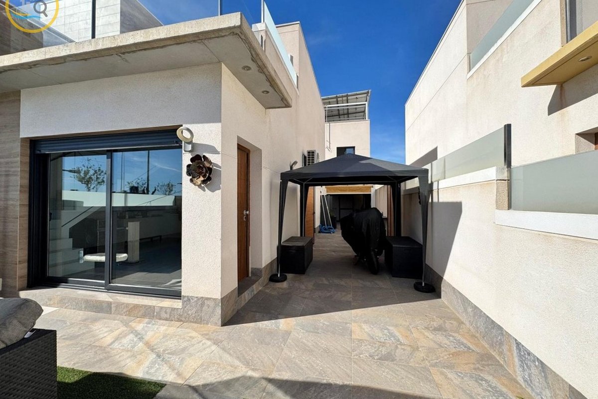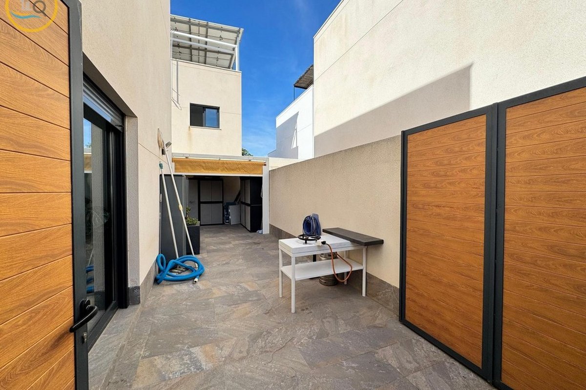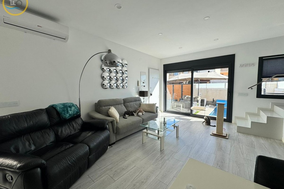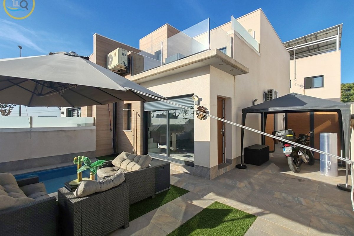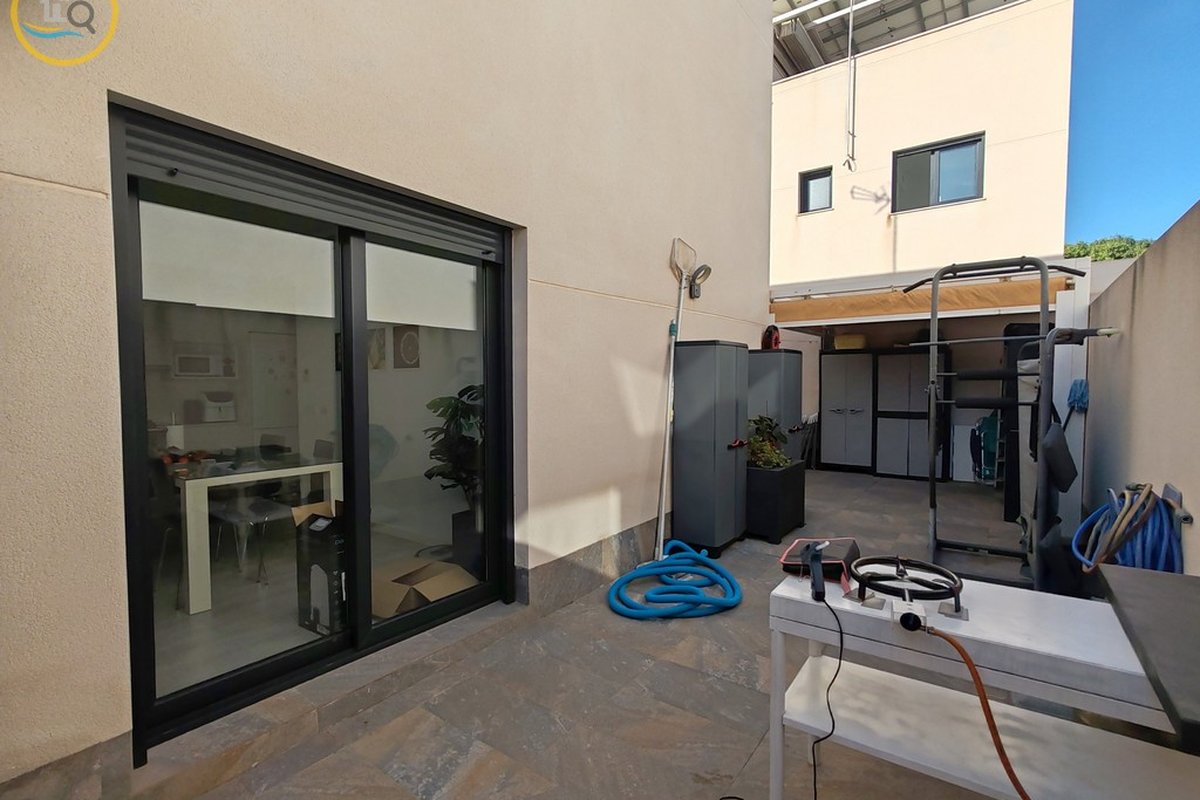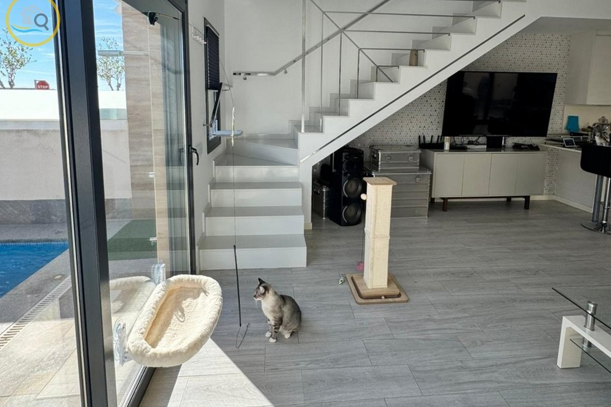 This plot has parking space for 2 or more cars. This smart home with smart opening can be controlled through your phone. Currently, the house offers a heated pool with jacuzzi area and a relaxation area. The entrance of the house leads to a spacious and bright living-dining room and a fully equipped open kitchen. On the ground floor there is a bathroom with shower and a double bedroom with fitted wardrobes, a modern and metallic railing that will lead to the first floor where the second bathroom with shower is located, two double bedrooms, both with fitted wardrobes, and along the hallway, a 20 m² terrace with glass windows, a charming place to sit and enjoy the sun.