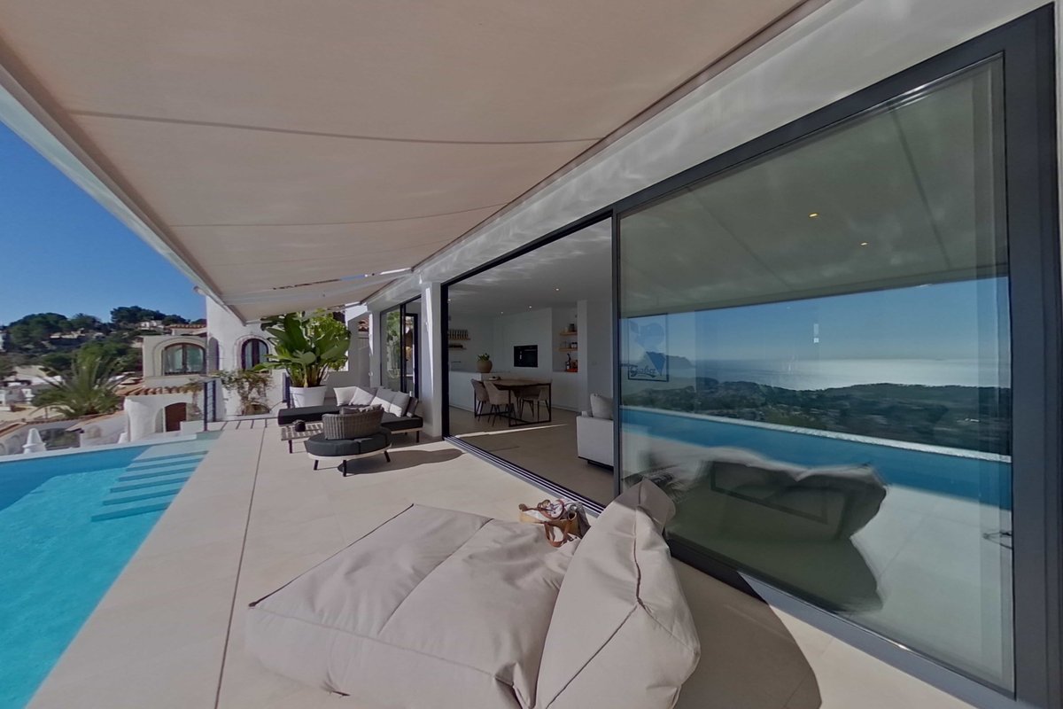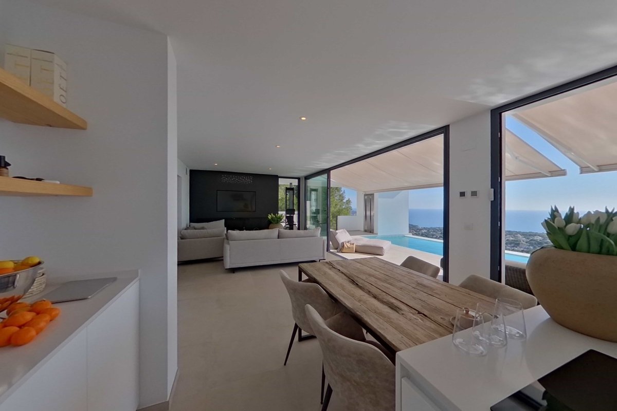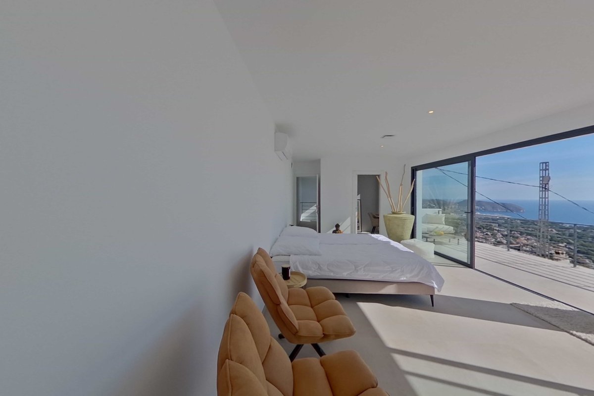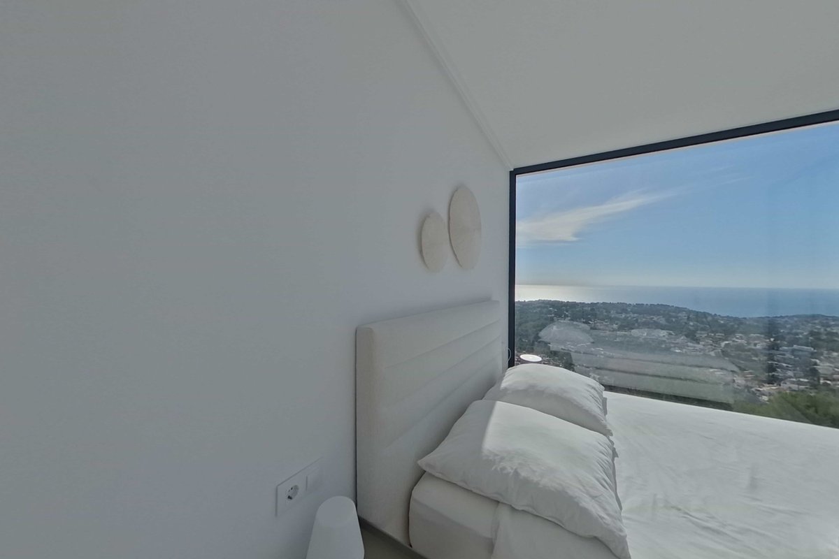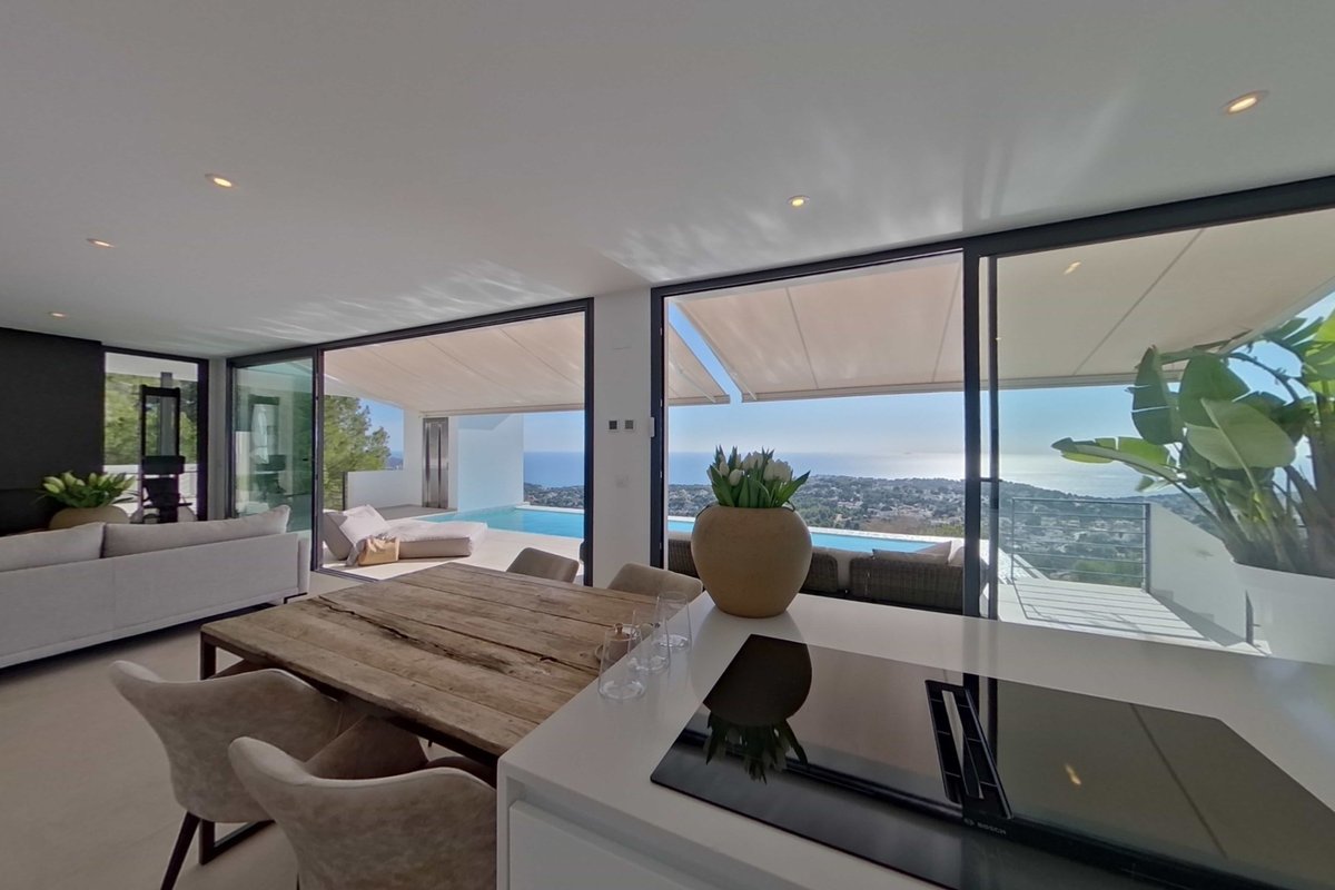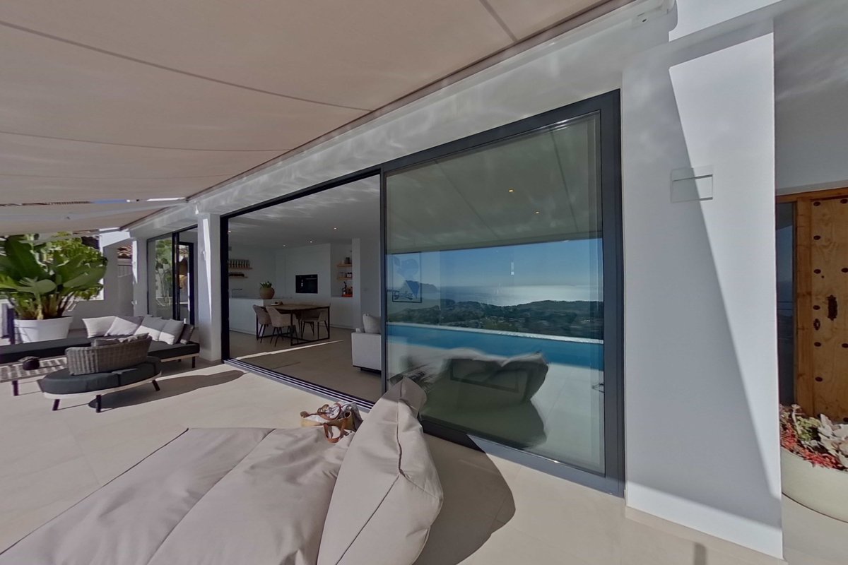 Welcome to 180° Oceanview Villa Moraira,~~The name of this luxury villa speaks for itself, with breathtaking views over the entire region from every angle of the property. This luxury villa has recently been completed and equipped with all the latest equipment and materials, paying meticulous attention to detail.~~The villa is spread out over 4 floors connected by an elevator, which goes from the entry level up to the living area, providing access to the 2 upper bedrooms via stairs. On the entry level is an open space fully prepared to be converted into a bedroom ensuite, or it can be used as a spacious garage for 2 cars by adding a garage door; this is included in the price and adaptable to the needs of the new owners.~~On the 2nd level, you will find a spacious bedroom ensuite with a walk-in closet. As this is not directly connected to the main living area, it offers an extremely unique space for guests, with incredible views available from all areas of the property!~~Moving up to the 3rd level, you arrive at the living area. Outside, you have the saltwater pool surrounded by a BBQ area, a lounge area, and a cozy corner to enjoy any meal of the day. Inside, you will find the fully equipped American-style kitchen with the latest equipment and premium brands. Next to the kitchen, you'll find the dining area and living area, all areas connected to the spacious terrace by sliding doors, offering a true Mediterranean living style.~~By stairs, you move up to the upper 2 bedrooms, both ensuite. One of the rooms has a double bed with an additional area featuring a retractable bed, which could also be used as an office space or extra wardrobe. The master bedroom itself comes with a walk-in closet/makeup area and a private terrace.~~All the air conditioning units have been integrated into the design and cleverly covered by panels. There is underfloor heating throughout the property.~~If you are looking for a state-of-the-art villa with breathtaking views, this is the place for you.~~All of this is just 9 minutes away by car from Moraira and 20 minutes from Calpe.~