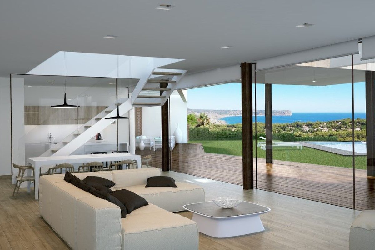 This project has a building license and can be delivered key ready within 12 months !! A beautiful modern villa, situated in a dead end street in a quiet neighborhood at 2500m from the sandy Arenal beach. There is a beautiful view of Cabo San Antonio and the bay of Javea. The ground floor measures 191 m2 and the house consists of an entrance hall and a spacious living room with a fully equipped open kitchen, on the other side of the house there are 3 double bedrooms with en-suite bathroom that give access to the terrace and the swimming pool. The first floor consists of a master bedroom with en-suite bathroom and a walk in closet, this floor measures 45 m2. There is also a basement with a window where we can find the technical room and a storage room that is also accessible from outside and there is also a multipurpose room of 39 m2. Outside there is a long driveway, a low maintenance garden and a swimming pool.~