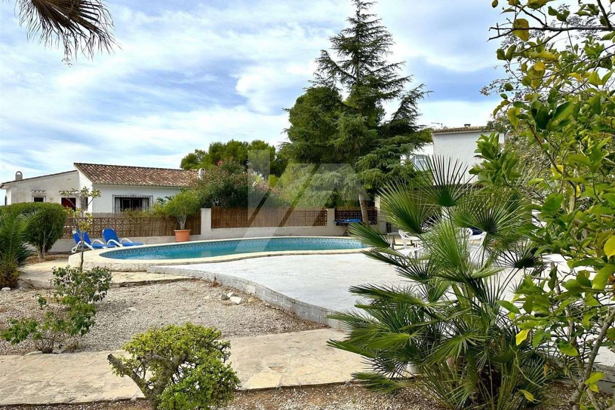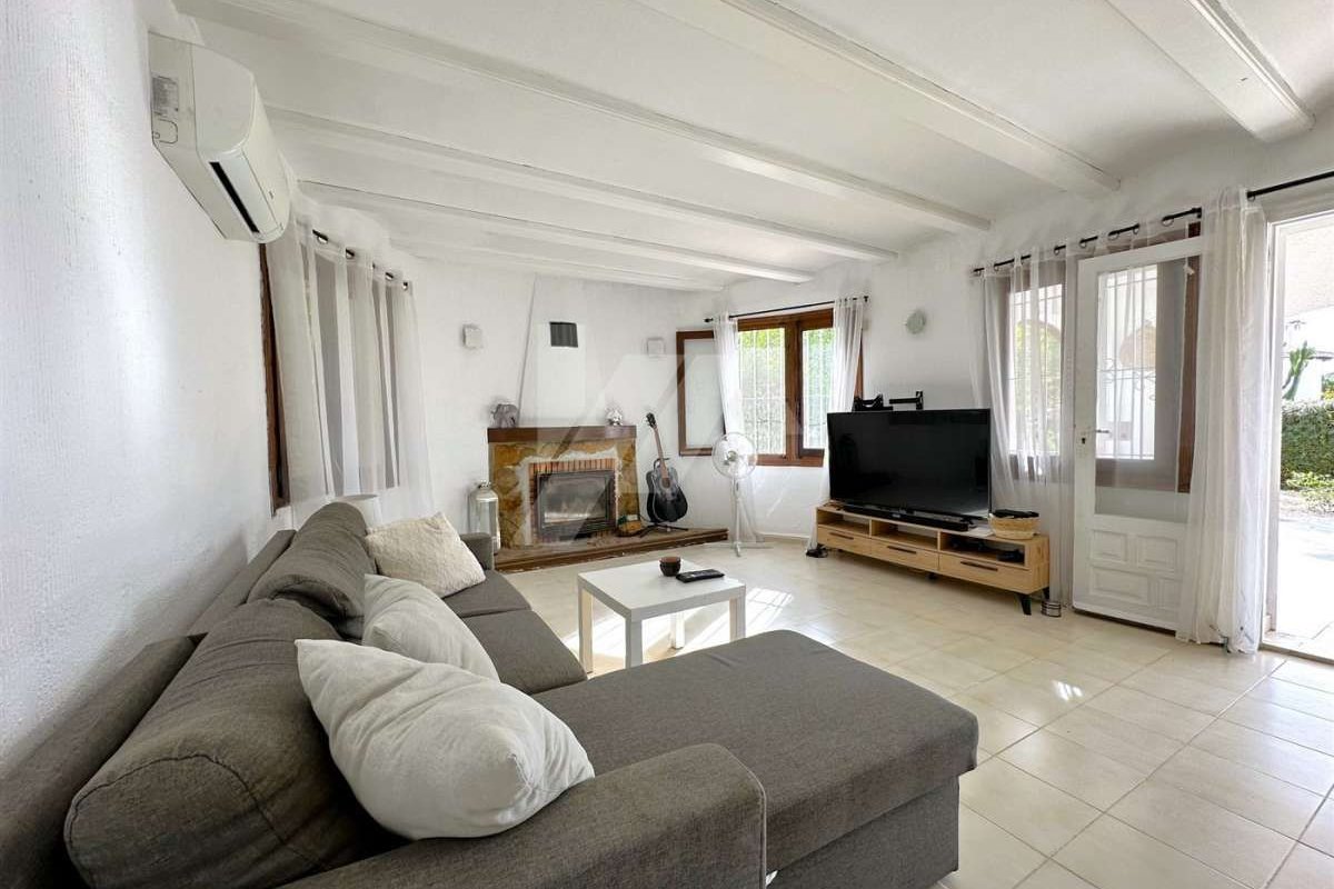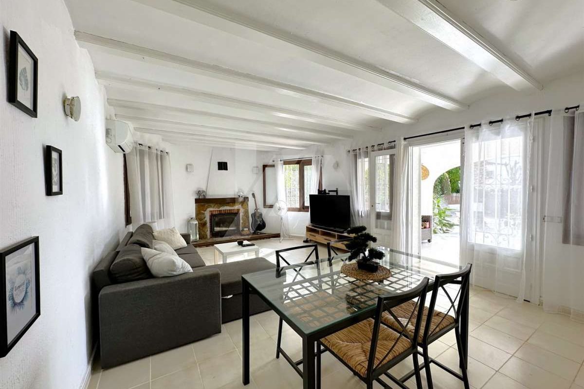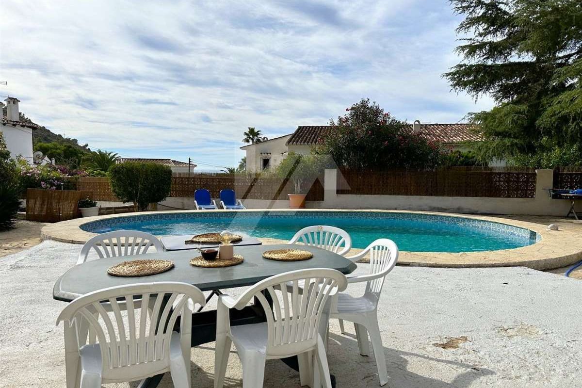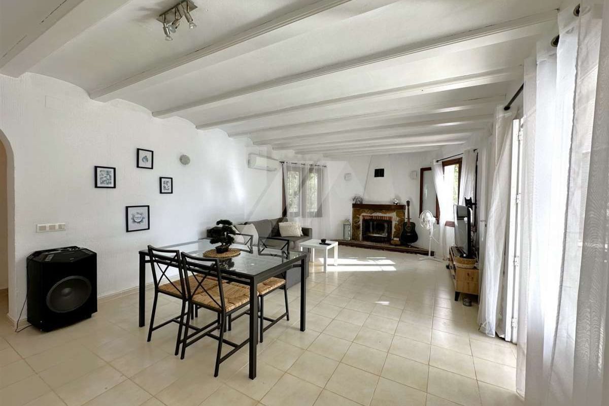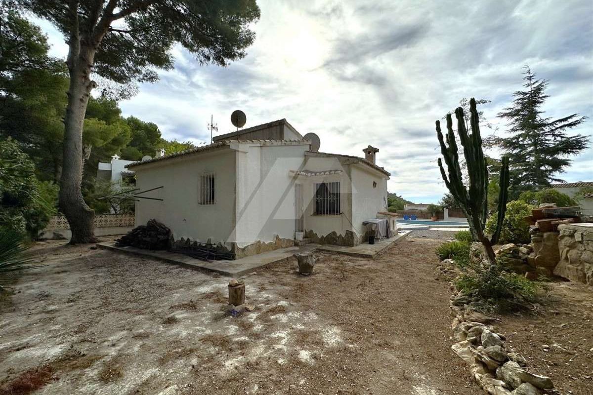 Villa for sale in Moraira.~~It is located in the sought after area of Arnella, right next to El Portet.~~It has a bit of sea view and is located just 1,5 km from the beach and the centre of the village.~~The plot is flat and fenced. ~~The property which is distributed in one floor, has an entrance porch which gives access to the living-dining room with fireplace, independent and refurbished kitchen.~~There are 2 bedrooms with fitted wardrobes and a fully renovated bathroom with bathtub.~~The mature garden has a swimming pool on the same level as the property, all facing south.~~Other extras: Air conditioning hot/cold, fitted wardrobes, parking, etc.~~The possibilities of extension make this property very attractive for those who wish to carry out their own design of distribution and reform. ~~Do not hesitate to contact our team to arrange a viewing.~