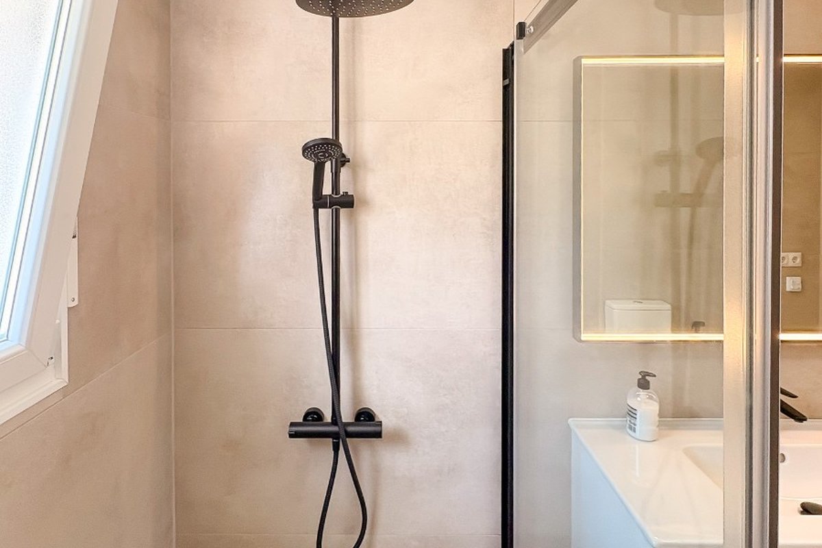 The first floor houses the master bedroom , a second bathroom with a shower , and two terraces , one facing northwest and the other southwest , allowing you to enjoy the sun throughout the day. The villa's southwest orientation ensures pleasant natural light for much of the day.