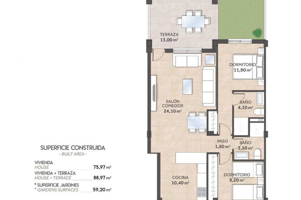 New Build Bungalows in San Miguel de Salinas – Nature, Golf and ComfortDiscover this new residential development in San Miguel de Salinas, located in the sought-after area of “La Cañada”, surrounded by a protected pine forest between the prestigious golf courses of Campoamor and Las Colinas. Just 7 km from the Mediterranean coast, this residential offers the perfect blend of tranquility, nature, and easy access to all amenities.Spacious and Modern HomesThe development offers two property types to suit different lifestyles:Ground floor bungalows: 2 bedrooms, 2 bathrooms, two large private gardens, and surface parking.Top floor bungalows: 2 bedrooms, 2 bathrooms, spacious solarium with sea views, and surface parking.Each home features generous dimensions and can be adapted into a 3-bedroom layout (optional at an extra cost), with kitchen appliances included.High-Quality FinishesDesigned for comfort and functionality, all properties include:Fully equipped bathrooms with furniture, mirrors, and shower screensAerothermal hot water systemBuilt-in LED ceiling lightsExclusive Community AreasThe residential features over 1,700 m2 of landscaped green areas with palm trees and Mediterranean plants. Residents can enjoy a large swimming pool with jacuzzi, a children’s pool, and sunbathing areas, making it the ideal setting to enjoy the Costa Blanca climate all year round.Privileged Location in San Miguel de SalinasThis quiet residential is located less than 3 km from the charming town of San Miguel de Salinas, with all daily services at hand. In addition, beautiful sandy beaches in Orihuela Costa and Torrevieja are only 7 km away, offering endless leisure, shopping, and dining options.Close to Renowned Golf CoursesFor golf enthusiasts, the location is unbeatable. Within a 4 km radius you will find three of the most prestigious golf courses on the Costa Blanca:Villamartín Golf – 3.5 kmLas Colinas Golf & Country Club – 4 kmCampoamor Golf – 4 kmExcellent ConnectivityKey points of interest nearby include:San Miguel de Salinas – 3 kmLa Zenia Boulevard Shopping Centre – 10 kmAlicante Airport – 55 kmMurcia Airport (Corvera) – 50 kmSecure Your New Home in San Miguel de SalinasWhether you are looking for a permanent residence, a holiday retreat, or an investment opportunity, these new build bungalows offer excellent value in one of the most desirable areas of the Costa Blanca. Contact us today for more information and to arrange a visit.~