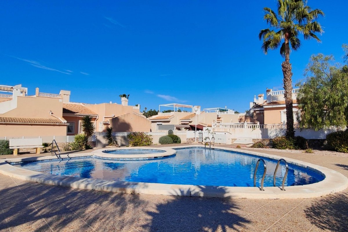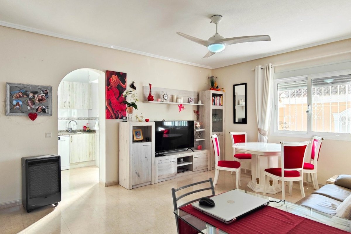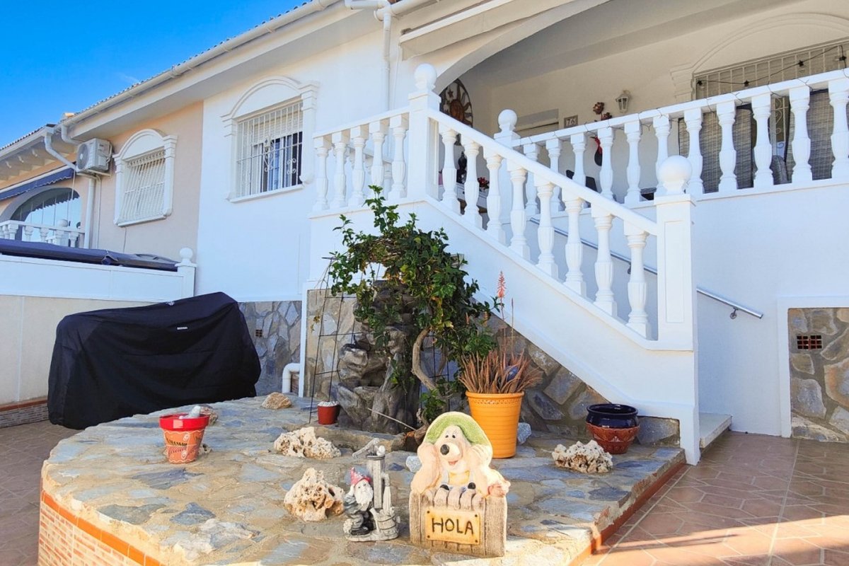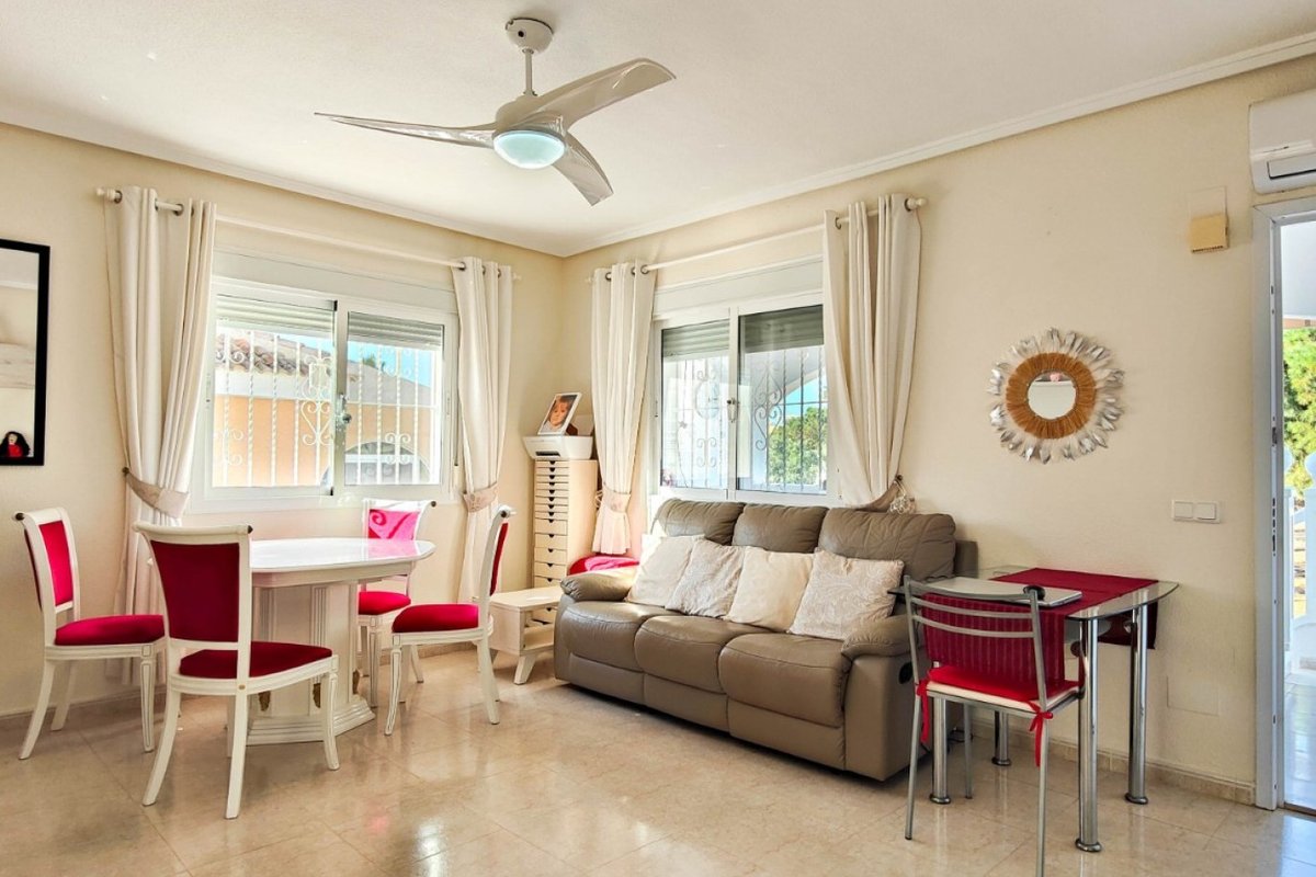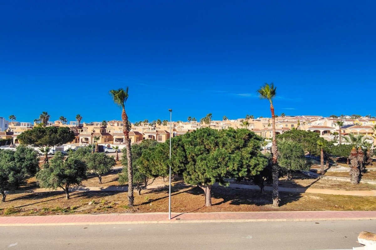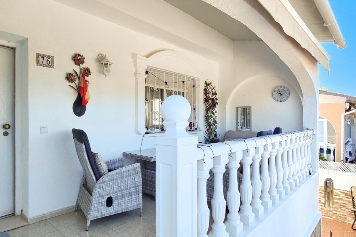 This beautiful semi-detached villa is located on a 200 m² plot in a quiet and highly sought-after area of Ciudad Quesada, part of Rojales. Positioned directly in front of a spacious green area, the property enjoys completely open views, excellent privacy and a peaceful environment. The villa is distributed entirely on one level and is elevated with an air chamber underneath, providing improved insulation and comfort throughout the year. It offers 2 bedrooms with fitted wardrobes and 2 full bathrooms, one of them en-suite. The living room is spacious and filled with natural light thanks to its west orientation, and it is equipped with air conditioning. All rooms benefit from ceiling fans. The kitchen is independent and fully equipped. Outside, the property features a private garden of approximately 100 m², ideal for enjoying the Mediterranean climate, as well as a 15 m² west-facing porch overlooking the green area. There is also a 20 m² private solarium, perfect as a relaxation space, off road parking for the car, and a storage/laundry room. The facade and exterior walls have been recently painted, and the property is sold furnished, including white goods. The residential complex offers a communal swimming pool. Located close to the centre of Ciudad Quesada, with all amenities, shops and restaurants within easy reach. An excellent opportunity as a permanent residence, holiday home or investment property on the Costa Blanca South.