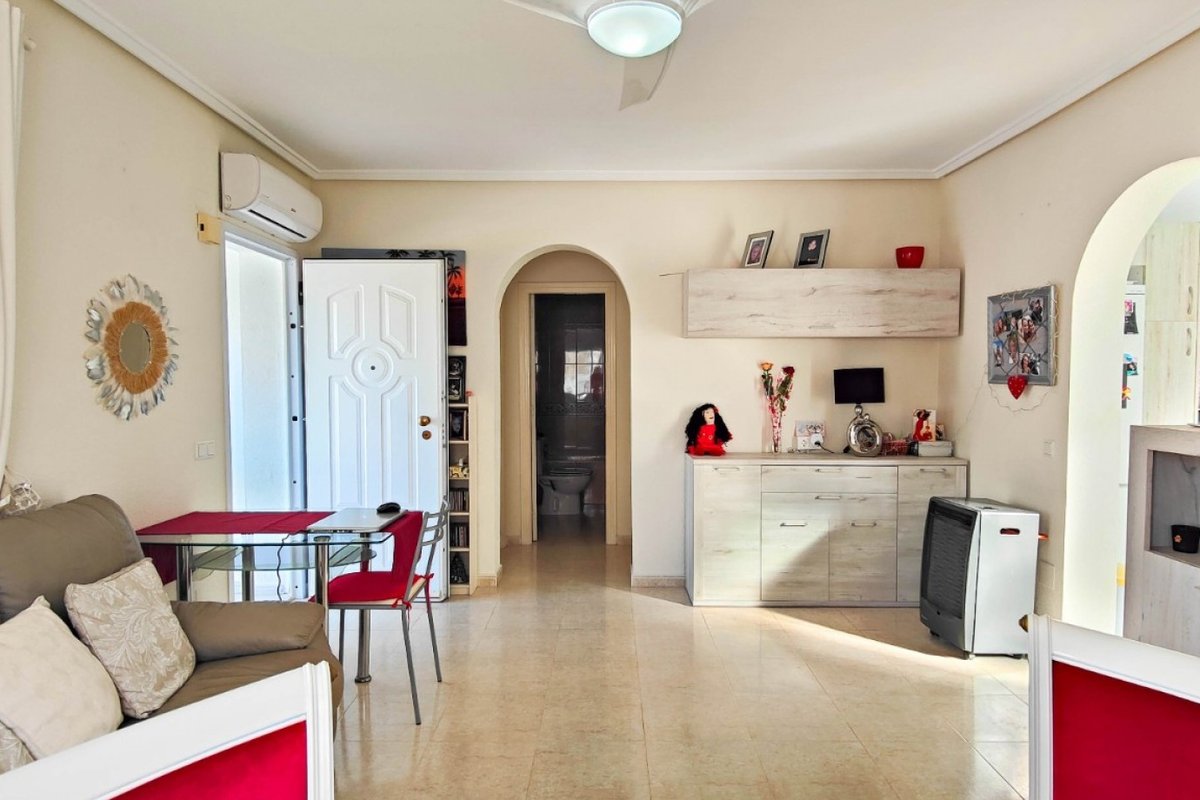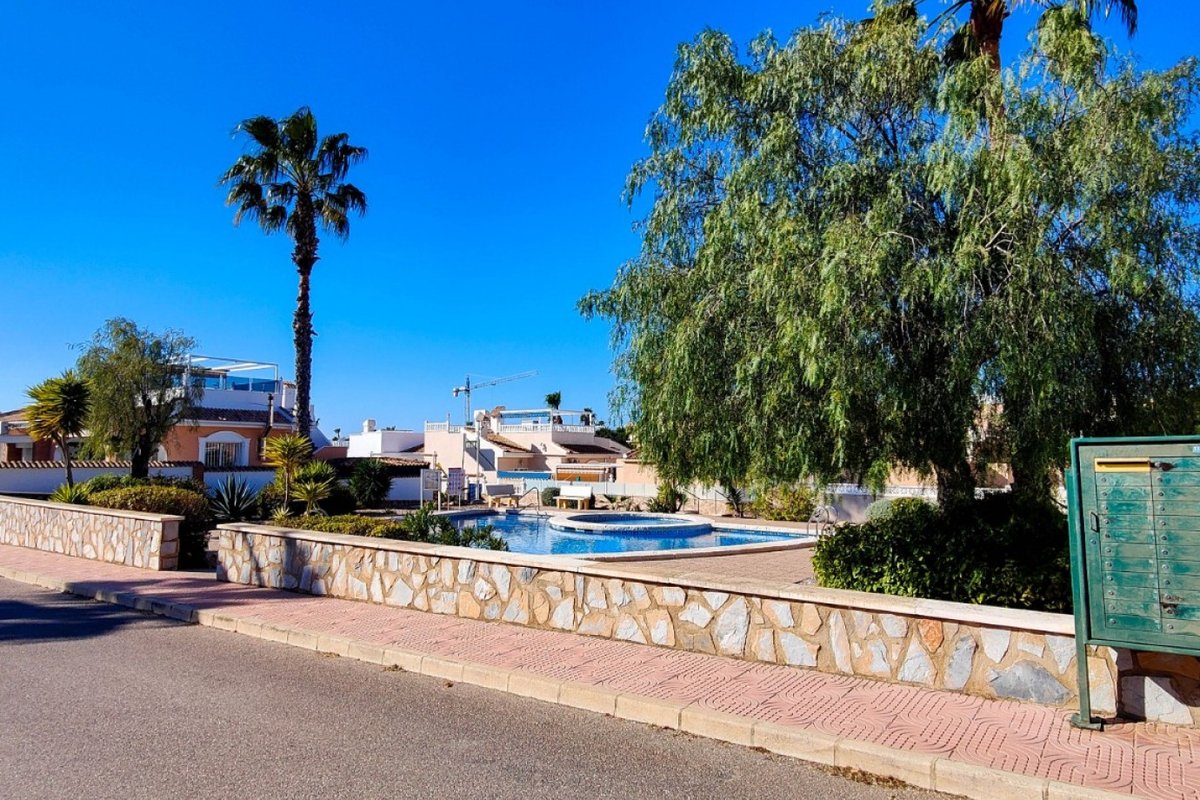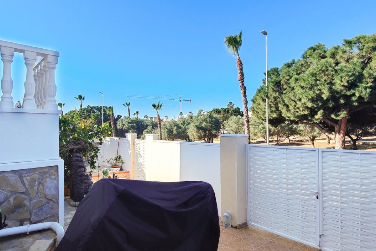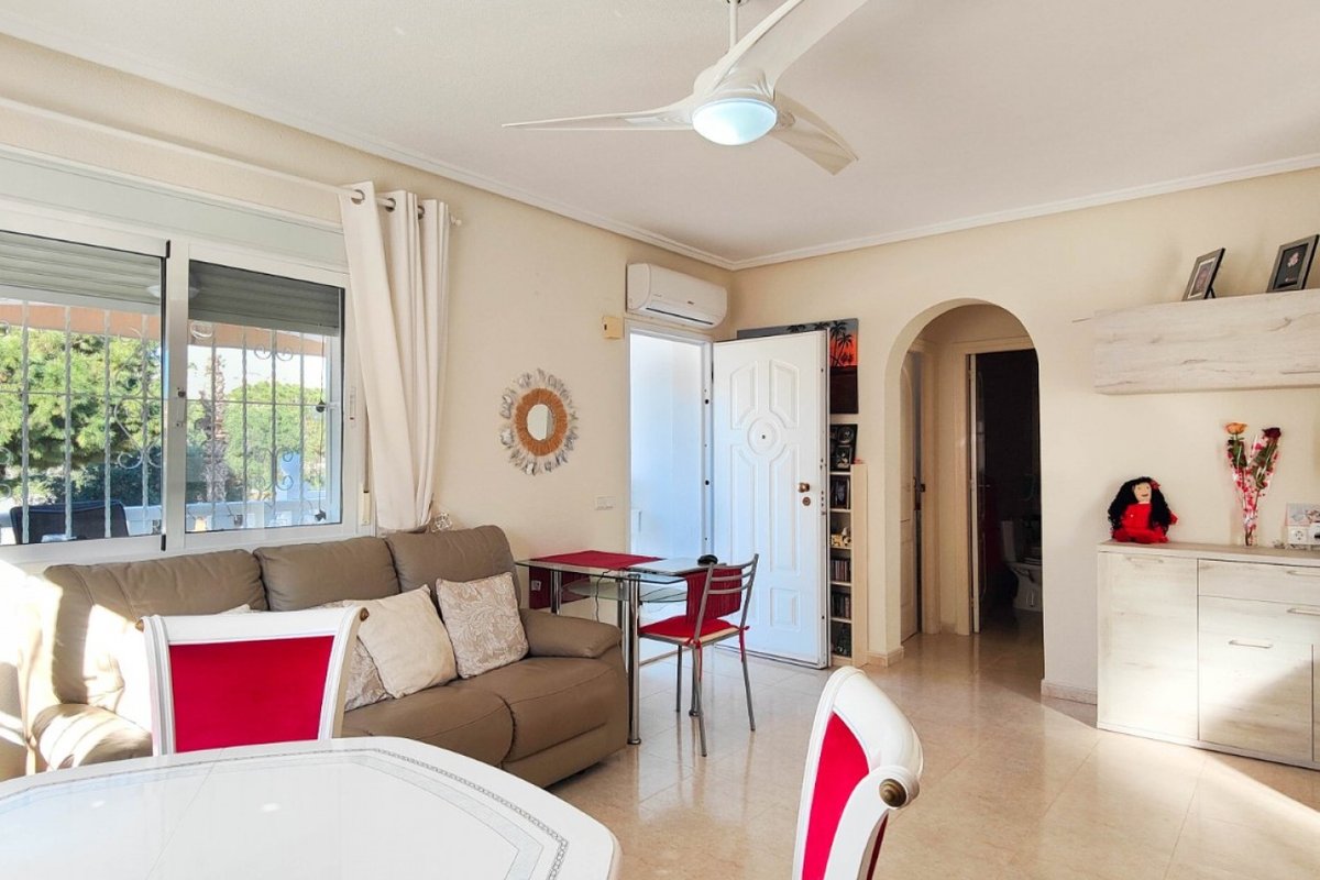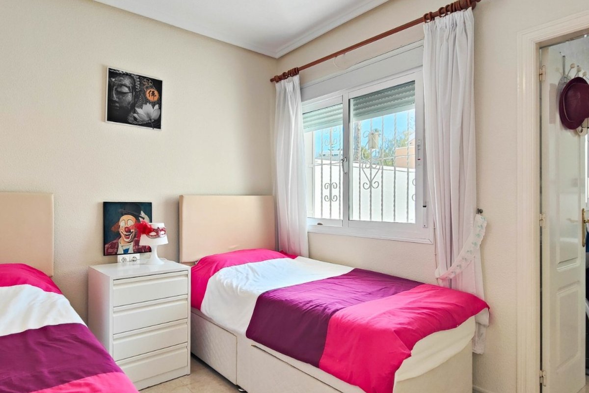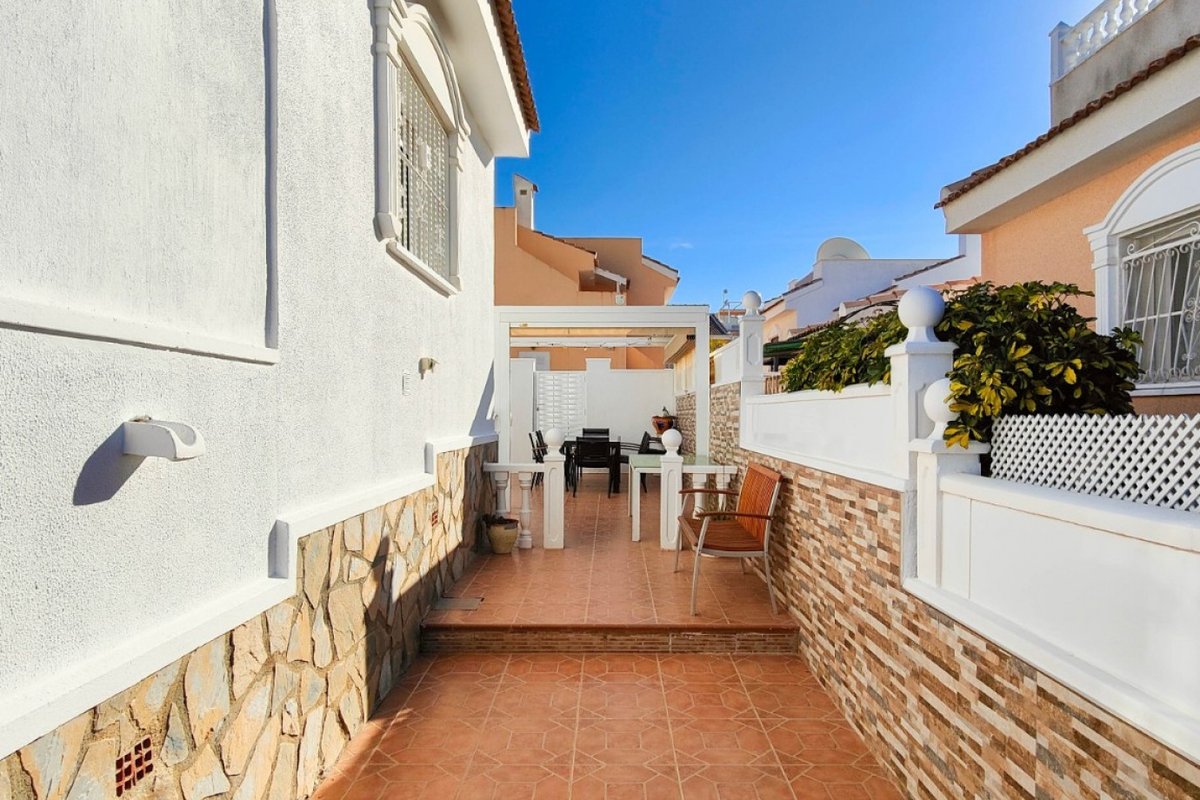 This beautiful semi-detached villa is located on a 200 m² plot in a quiet and highly sought-after area of Ciudad Quesada, part of Rojales. Positioned directly in front of a spacious green area, the property enjoys completely open views, excellent privacy and a peaceful environment. The villa is distributed entirely on one level and is elevated with an air chamber underneath, providing improved insulation and comfort throughout the year. It offers 2 bedrooms with fitted wardrobes and 2 full bathrooms, one of them en-suite. The living room is spacious and filled with natural light thanks to its west orientation, and it is equipped with air conditioning. All rooms benefit from ceiling fans. The kitchen is independent and fully equipped. Outside, the property features a private garden of approximately 100 m², ideal for enjoying the Mediterranean climate, as well as a 15 m² west-facing porch overlooking the green area. There is also a 20 m² private solarium, perfect as a relaxation space, off road parking for the car, and a storage/laundry room. The facade and exterior walls have been recently painted, and the property is sold furnished, including white goods. The residential complex offers a communal swimming pool. Located close to the centre of Ciudad Quesada, with all amenities, shops and restaurants within easy reach. An excellent opportunity as a permanent residence, holiday home or investment property on the Costa Blanca South.