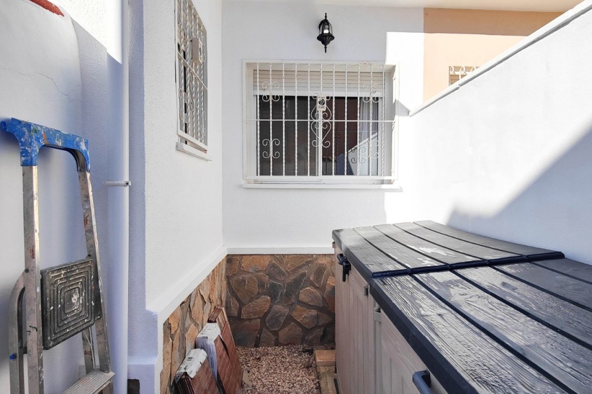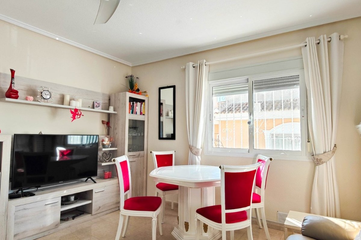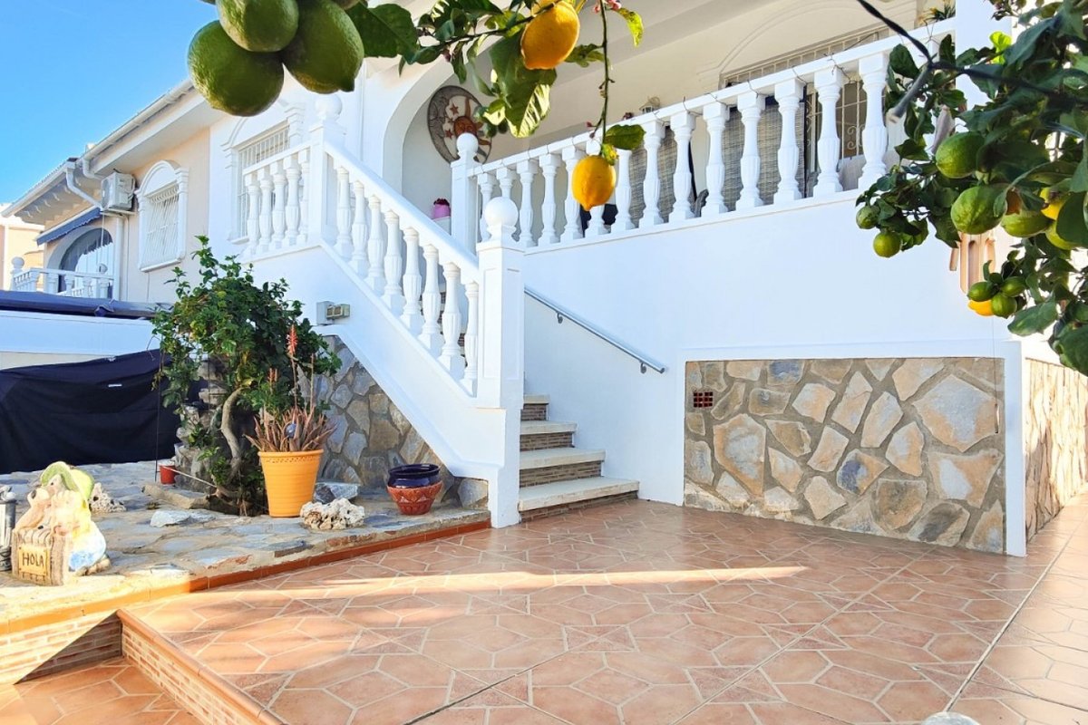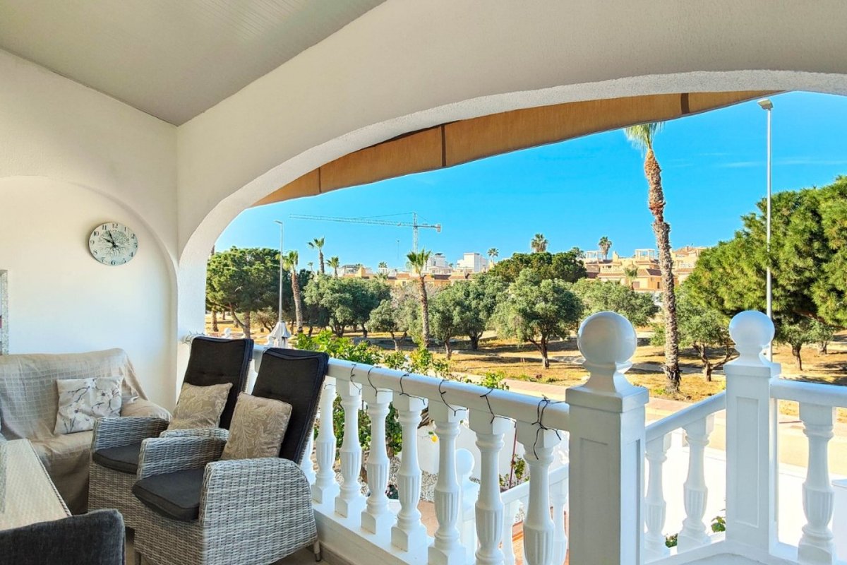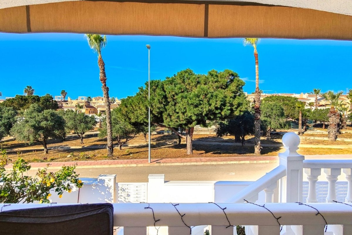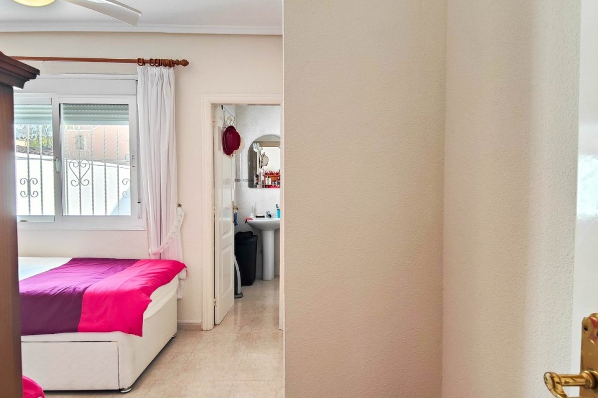 This beautiful semi-detached villa is located on a 200 m² plot in a quiet and highly sought-after area of Ciudad Quesada, part of Rojales. Positioned directly in front of a spacious green area, the property enjoys completely open views, excellent privacy and a peaceful environment. The villa is distributed entirely on one level and is elevated with an air chamber underneath, providing improved insulation and comfort throughout the year. It offers 2 bedrooms with fitted wardrobes and 2 full bathrooms, one of them en-suite. The living room is spacious and filled with natural light thanks to its west orientation, and it is equipped with air conditioning. All rooms benefit from ceiling fans. The kitchen is independent and fully equipped. Outside, the property features a private garden of approximately 100 m², ideal for enjoying the Mediterranean climate, as well as a 15 m² west-facing porch overlooking the green area. There is also a 20 m² private solarium, perfect as a relaxation space, off road parking for the car, and a storage/laundry room. The facade and exterior walls have been recently painted, and the property is sold furnished, including white goods. The residential complex offers a communal swimming pool. Located close to the centre of Ciudad Quesada, with all amenities, shops and restaurants within easy reach. An excellent opportunity as a permanent residence, holiday home or investment property on the Costa Blanca South.