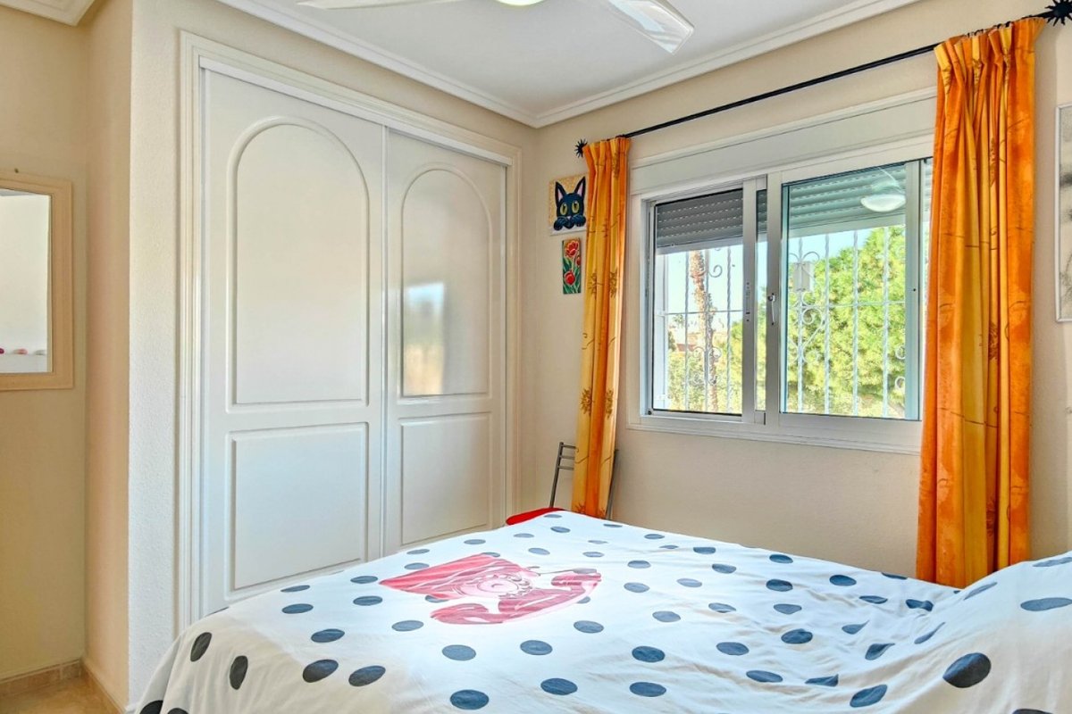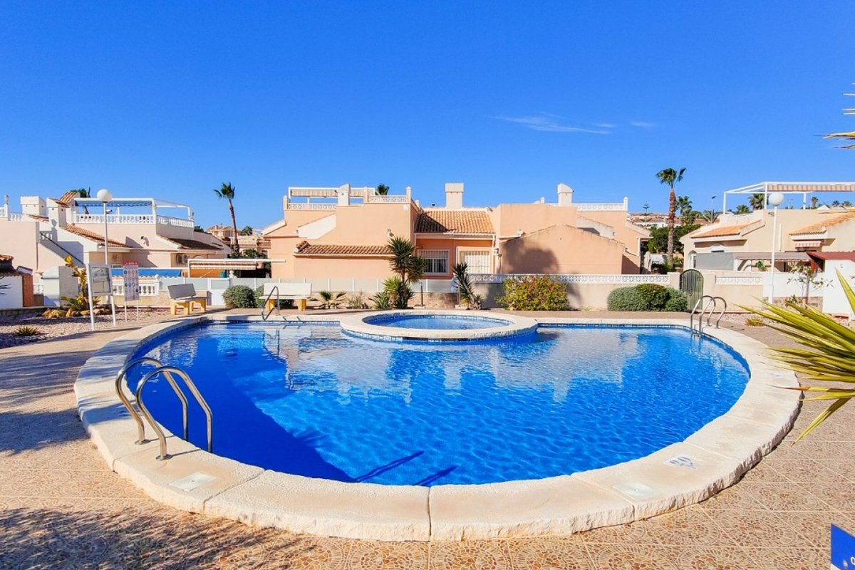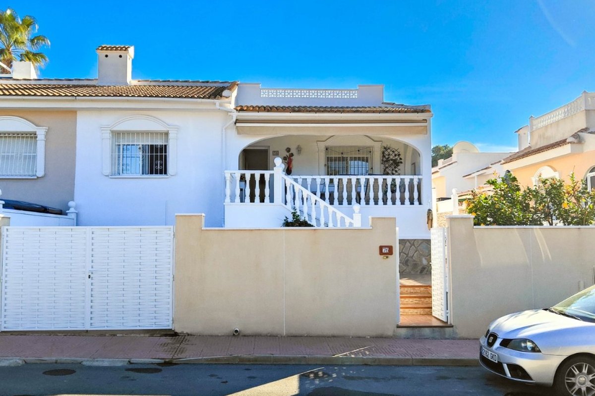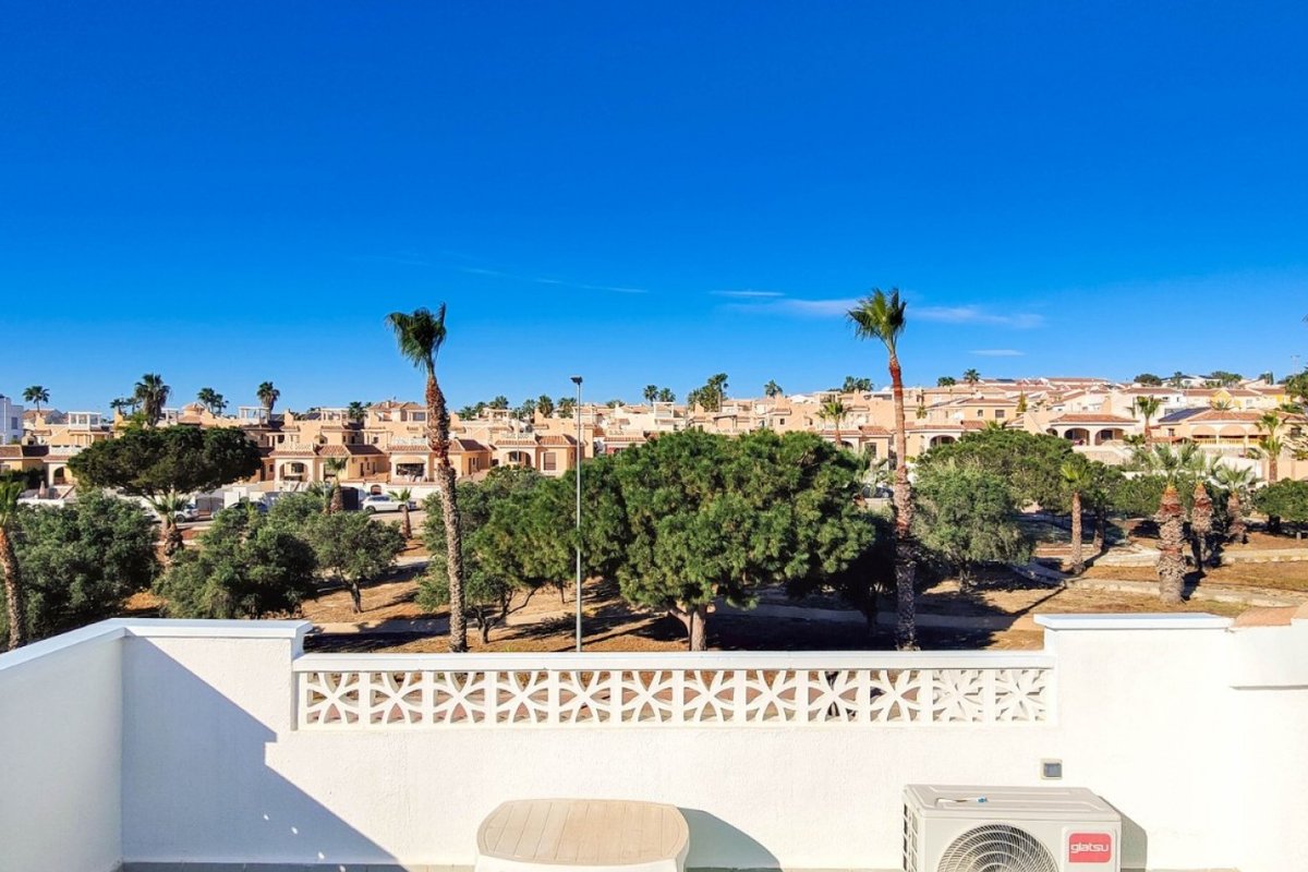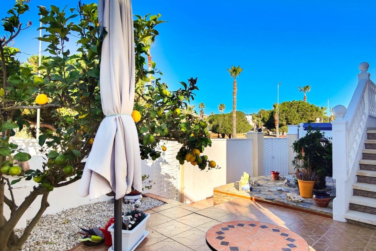This beautiful semi-detached villa is located on a 200 m² plot in a quiet and highly sought-after area of Ciudad Quesada, part of Rojales. Positioned directly in front of a spacious green area, the property enjoys completely open views, excellent privacy and a peaceful environment. The villa is distributed entirely on one level and is elevated with an air chamber underneath, providing improved insulation and comfort throughout the year. It offers 2 bedrooms with fitted wardrobes and 2 full bathrooms, one of them en-suite. The living room is spacious and filled with natural light thanks to its west orientation, and it is equipped with air conditioning. All rooms benefit from ceiling fans. The kitchen is independent and fully equipped. Outside, the property features a private garden of approximately 100 m², ideal for enjoying the Mediterranean climate, as well as a 15 m² west-facing porch overlooking the green area. There is also a 20 m² private solarium, perfect as a relaxation space, off road parking for the car, and a storage/laundry room. The facade and exterior walls have been recently painted, and the property is sold furnished, including white goods. The residential complex offers a communal swimming pool. Located close to the centre of Ciudad Quesada, with all amenities, shops and restaurants within easy reach. An excellent opportunity as a permanent residence, holiday home or investment property on the Costa Blanca South.